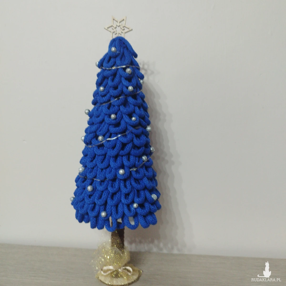 Choinka ze sznurka bawełnianego w kolorze niebieskim z lampkami. Ozdobiona srebrnymi kuleczkami. Wysokość 33cm
