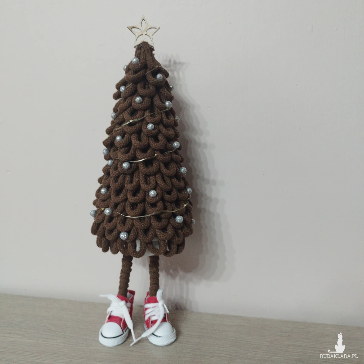 Choinka ze sznurka bawełnianego w kolorze brązowym z lampkami. Ozdobiona srebrnymi kuleczkami. Wysokość 33cm