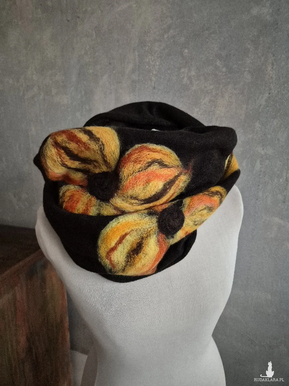 Super prezent na dzień mamy czarny filcowany wełniany miły i ciepły komin handmade, owijany dwa razy, filcowany wełną merynosów, bardzo ciepły i miły, doskonały na prezent, fantastyczny na codzienne noszenie, zwraca uwagę, dodaje koloru, nie zginiesz w tym kominie na ulicy, pojedyncze egzemplarze, polecam bestseller,box x1