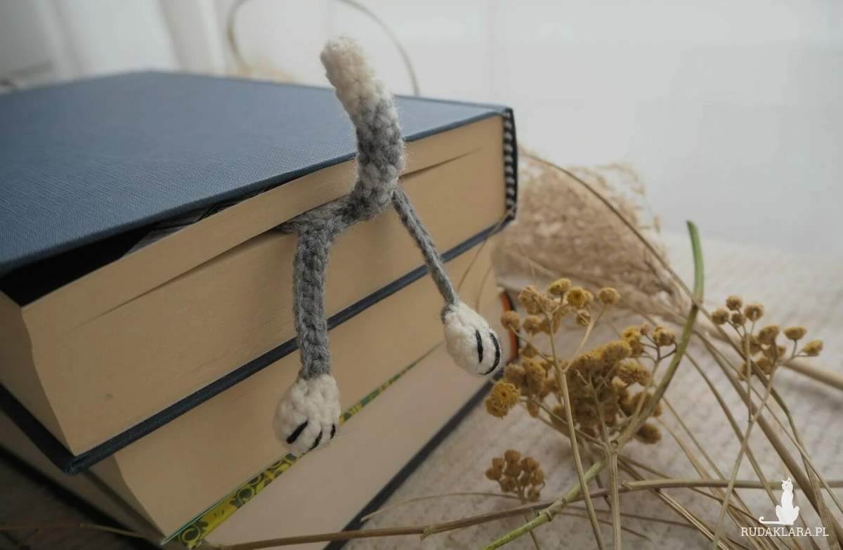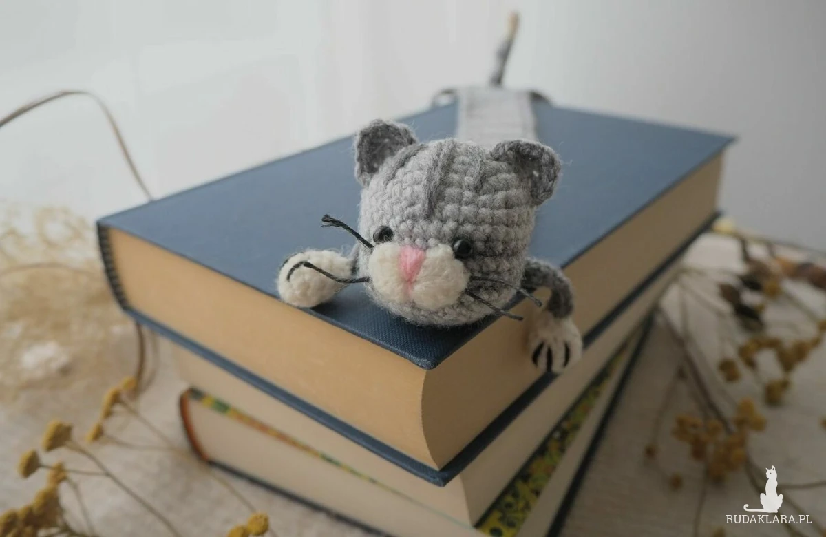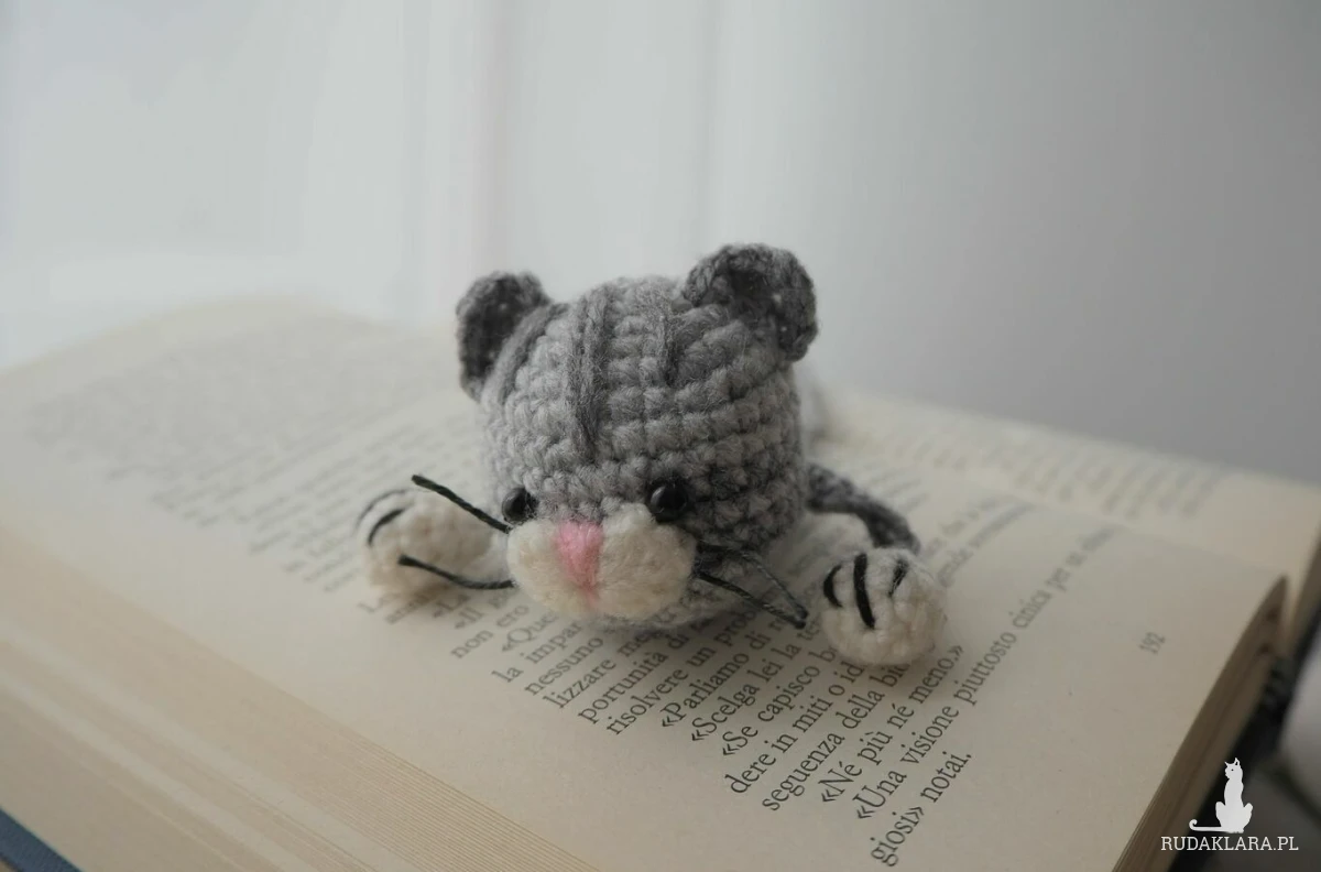 Zakładka do książki z sympatycznym kotem wykonana z włóczki na szydełku.