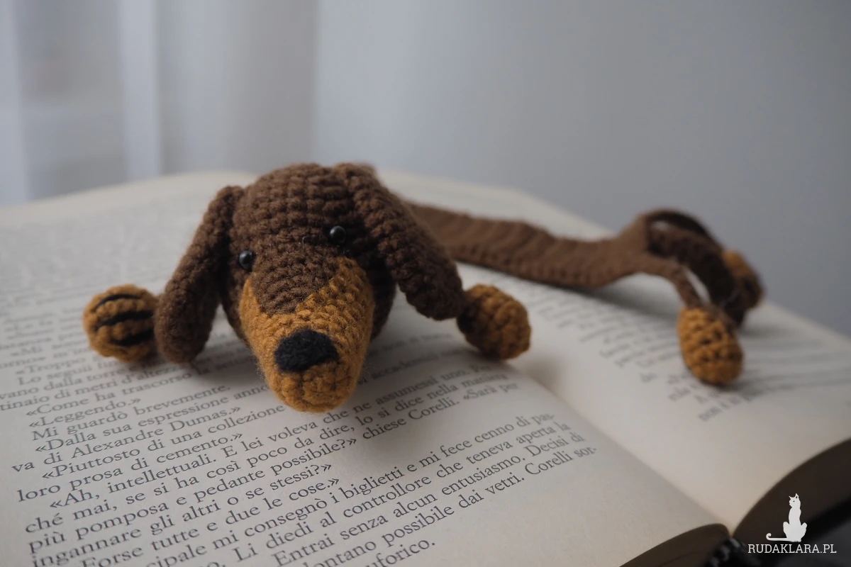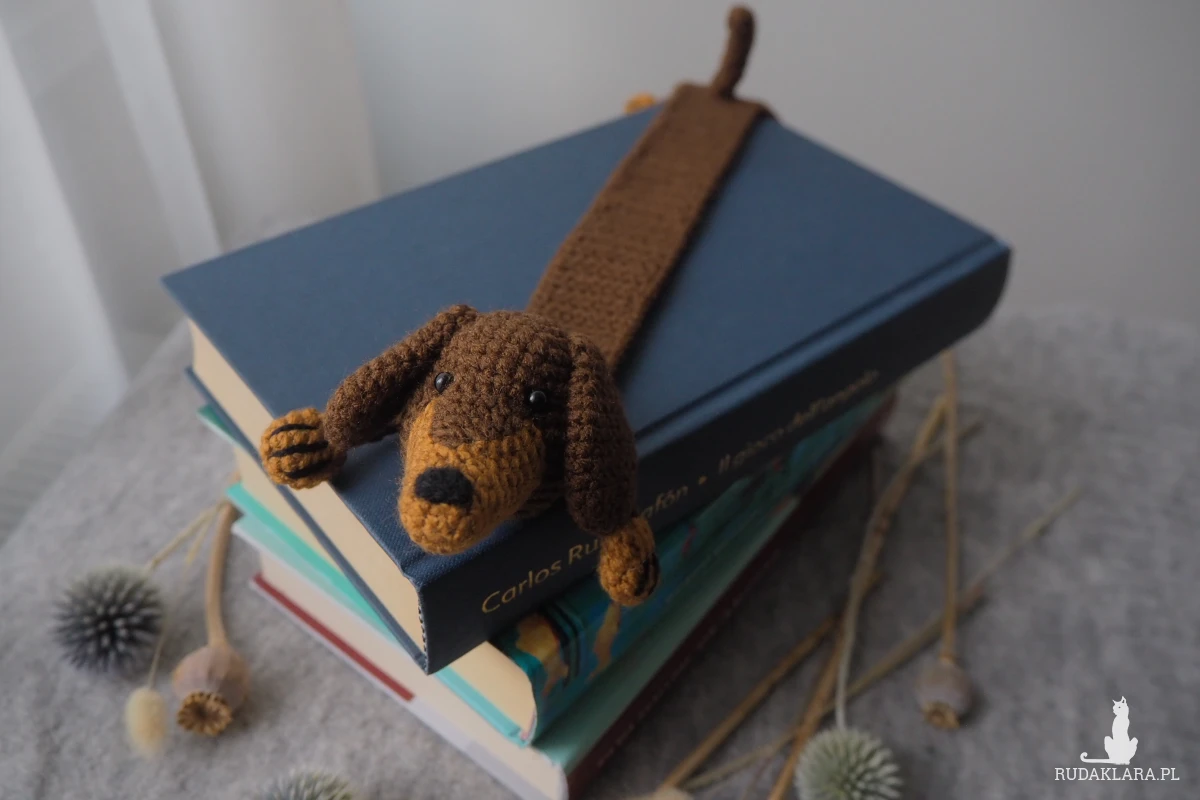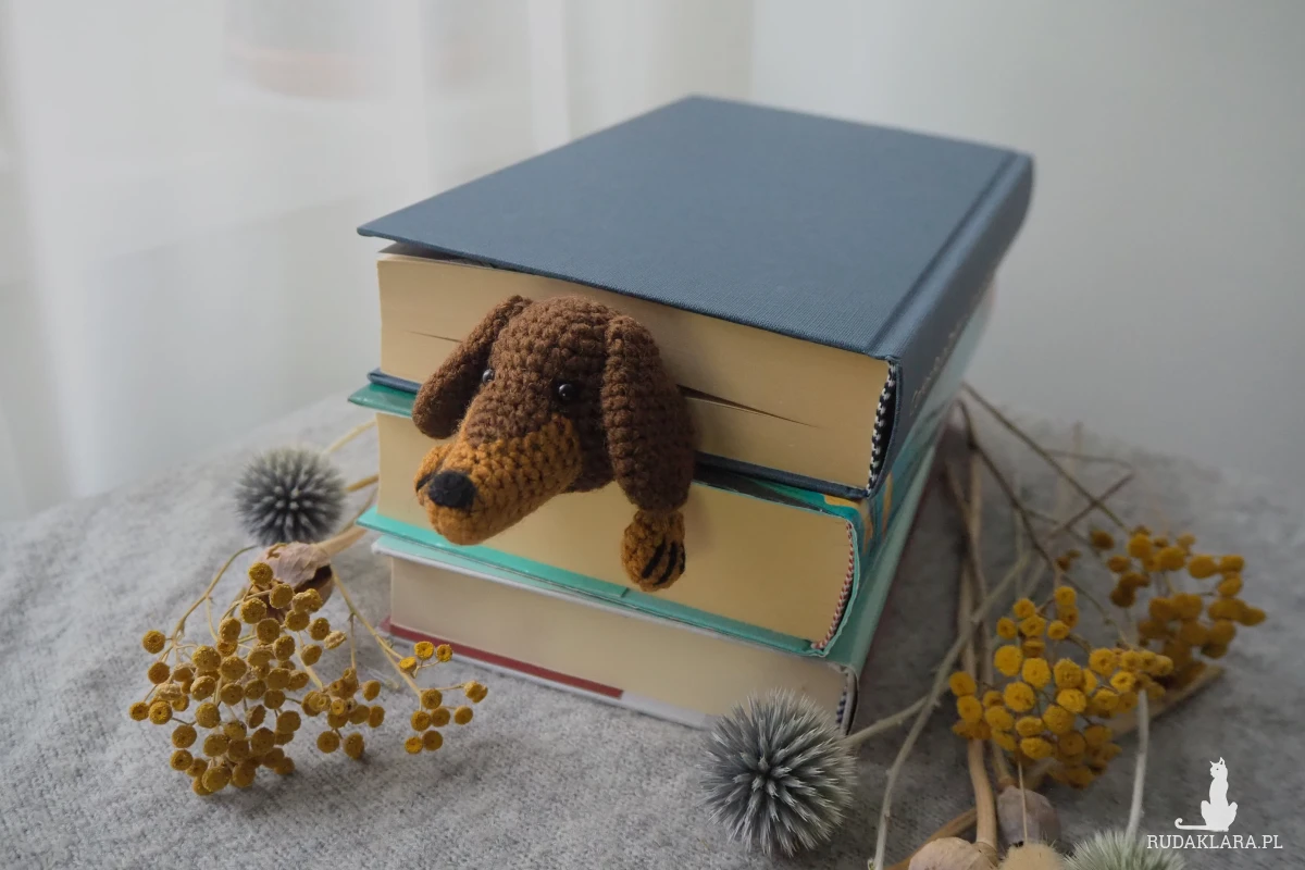 Zakładka do książki z sympatycznym pieskiem wykonana z włóczki na szydełku.