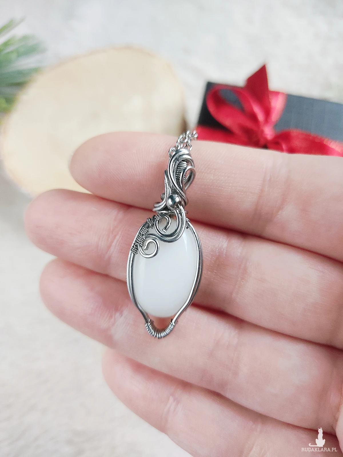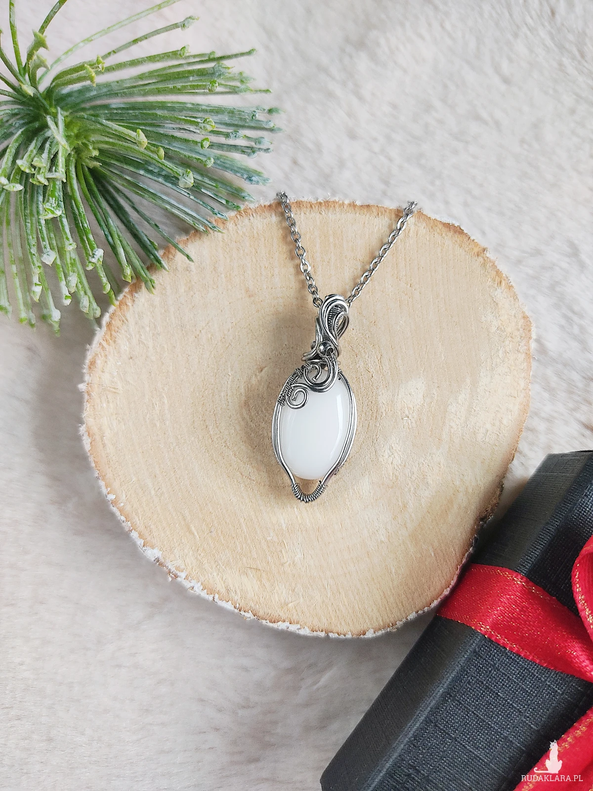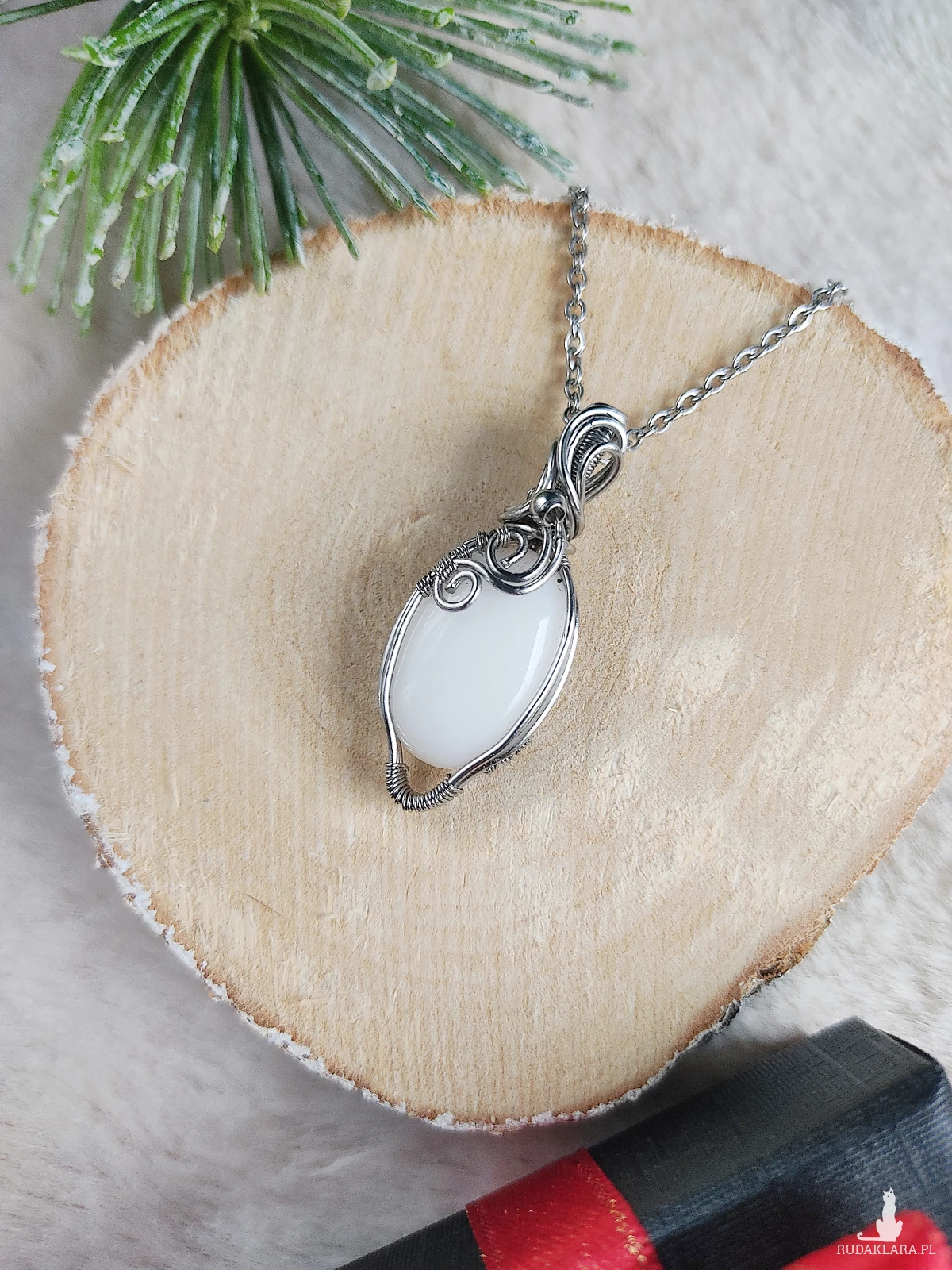 Kwarc mleczny jest kamieniem, który od lat ceniony jest za swój delikatny wygląd oraz symbolikę harmonii i spokoju. Jego miękkie, mleczne tony pięknie odbijają światło, co nadaje naszyjnikowi subtelny blask. Naturalny kamień został starannie dobrany pod względem koloru, a następnie ręcznie otoczony misternymi splotami stworzonymi techniką wire wrapping. Dzięki temu każdy egzemplarz jest niepowtarzalny i może różnić się od innych w drobnych detalach, co daje wrażenie posiadania biżuterii stworzonej tylko dla jednej osoby.
