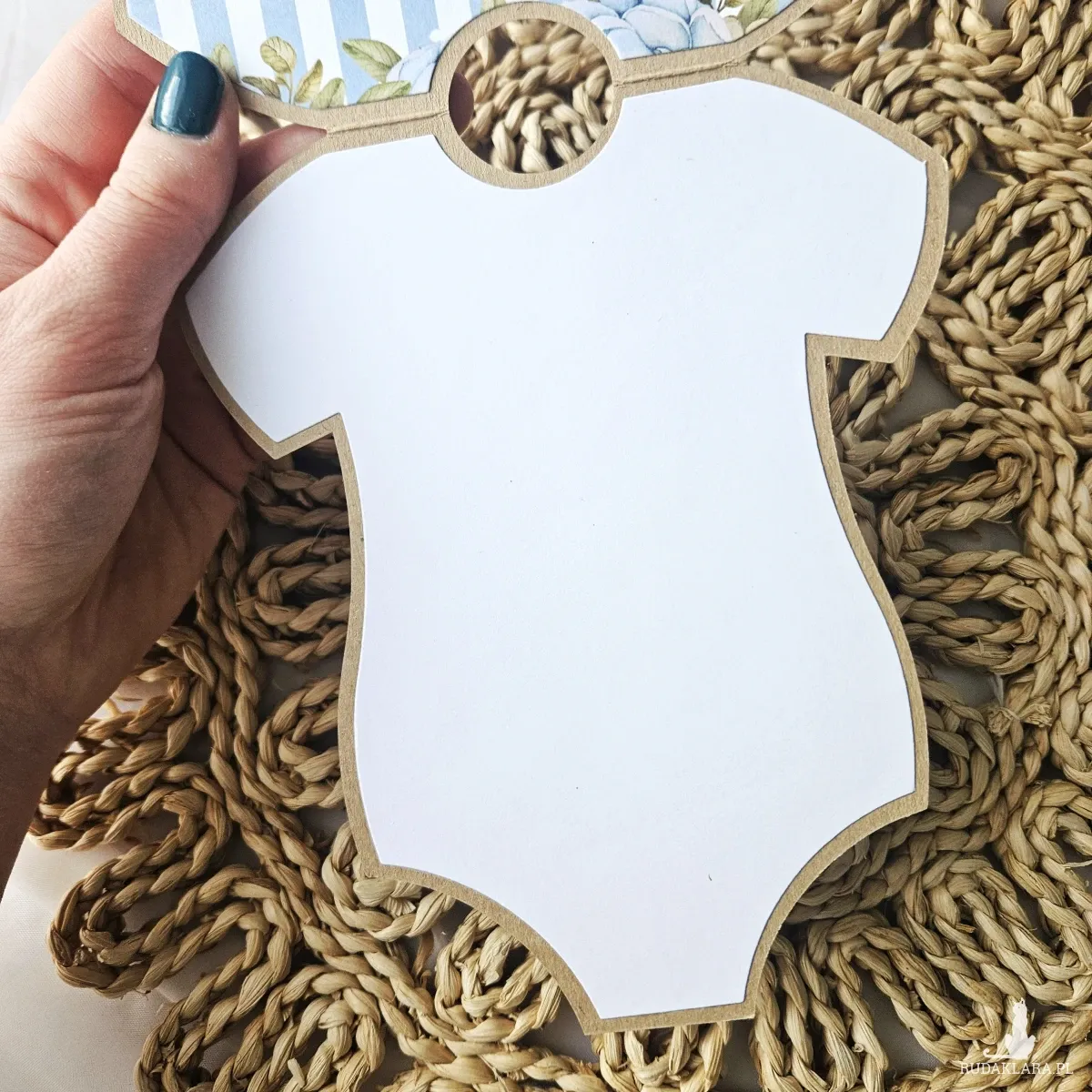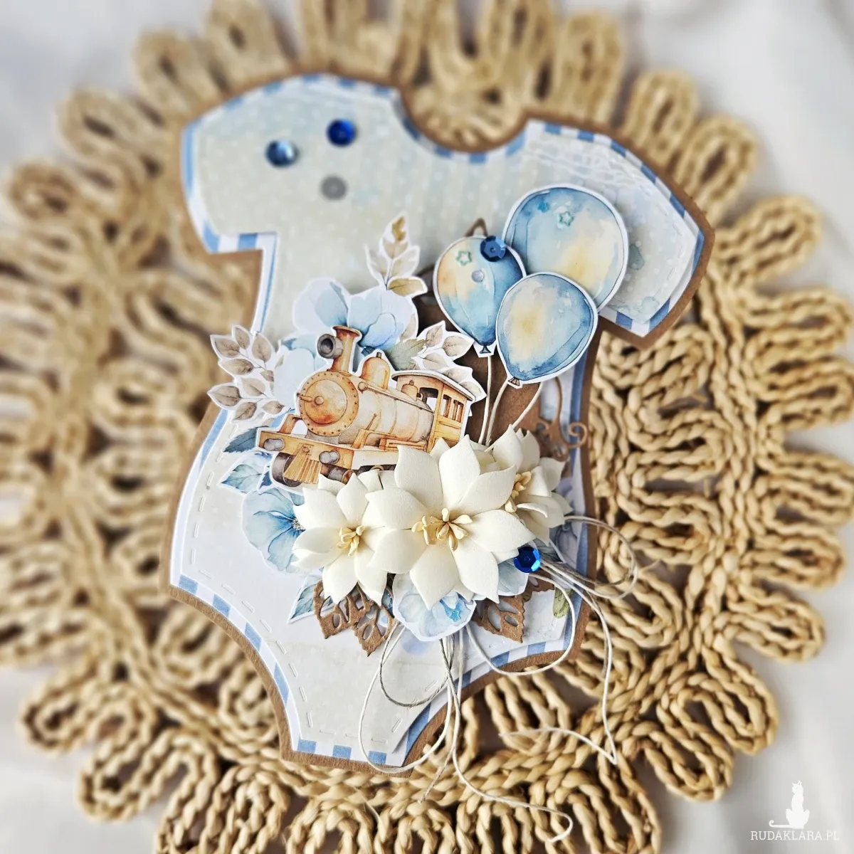 Kartka jest w kształcie dziecięcego body. Oklejona różowymi papierami i ozdobiona dodatkami z papieru, kwiatami z materiału, wstążką oraz koralikami. Świetnie się sprawdzi jako oryginalna pamiątka urodzin maluszka.