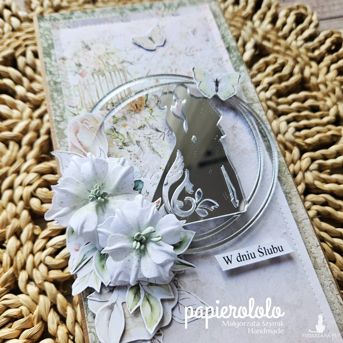 Kartka z okazji ślubu lub rocznicy ślubu. Wykonana z papieru z nadrukiem i ozdobiona kwiatami z materiału oraz papierowymi dodatkami.