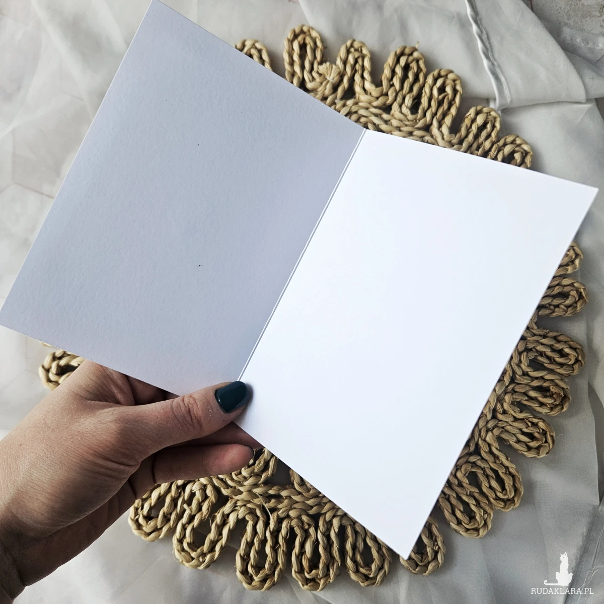 Kartka w formacie A6 (10,5x14,8 cm), do której dołączam kopertę.