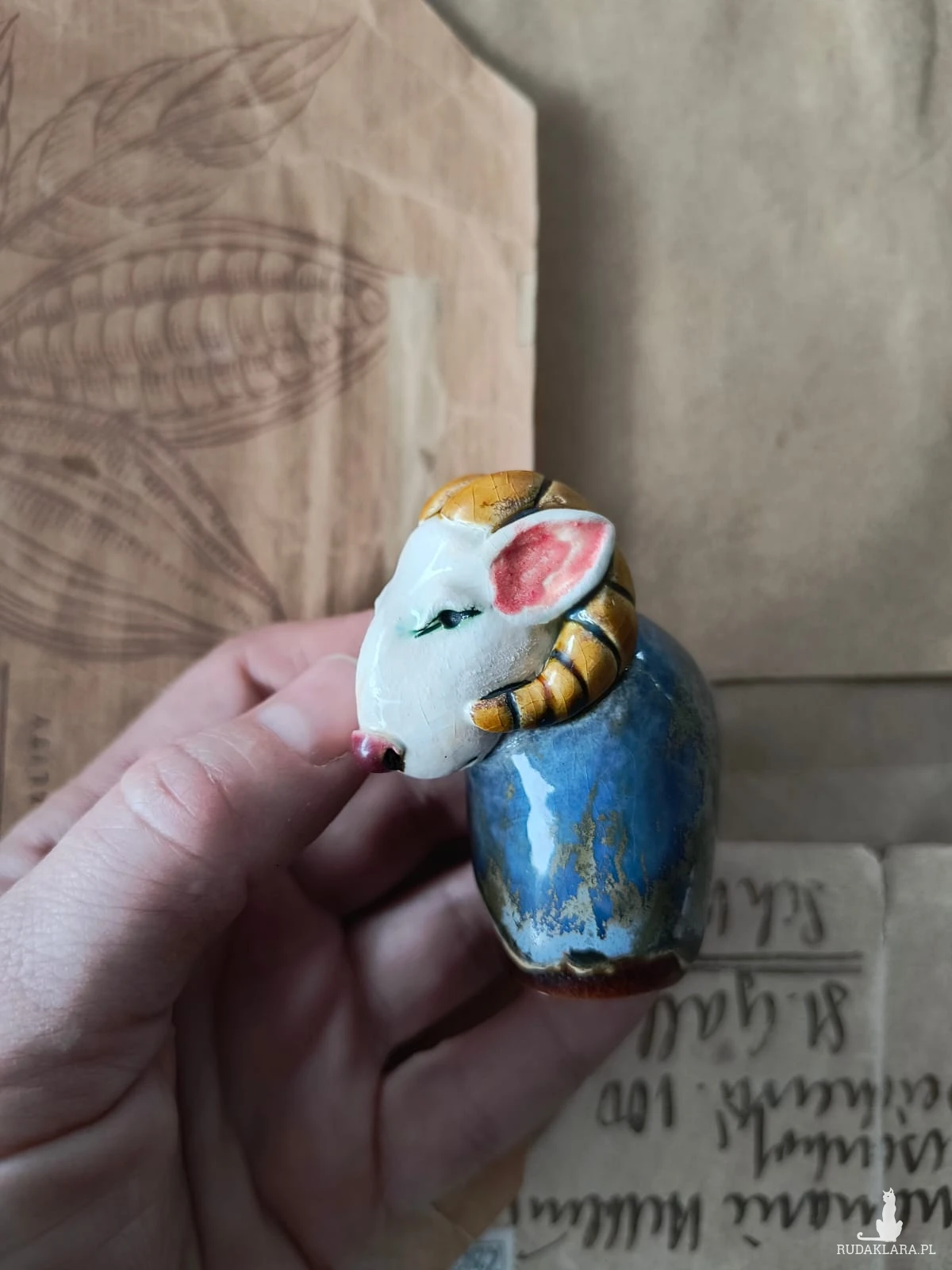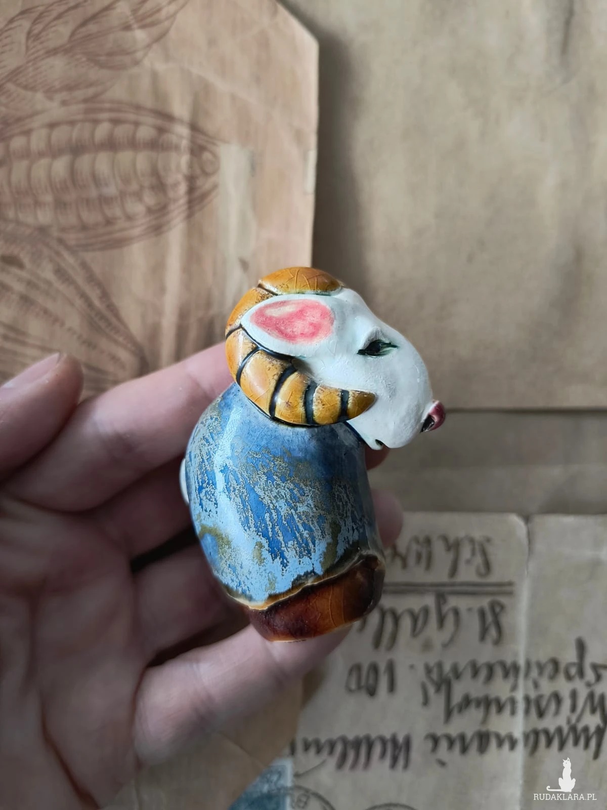 Filigranowa figurka barana, wykonana z dbałością o szczegół z gliny szamotowej, wypalona została na biskwit, a następnie szkliwiona w temp ok 1260 stopni C. Wymiary ok 5,5 cm x 6,5 cm. Świetnie sprawdzi się jako dodatek do lasów w słoikach lub kompozycji doniczkowych. Polecam serdecznie.
