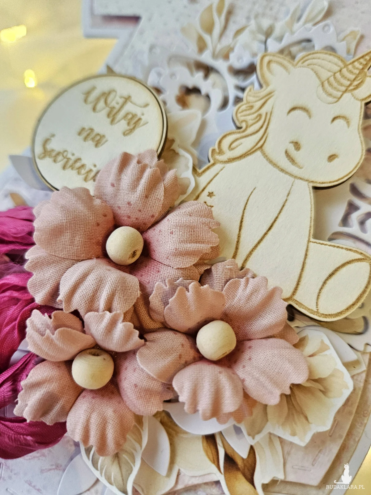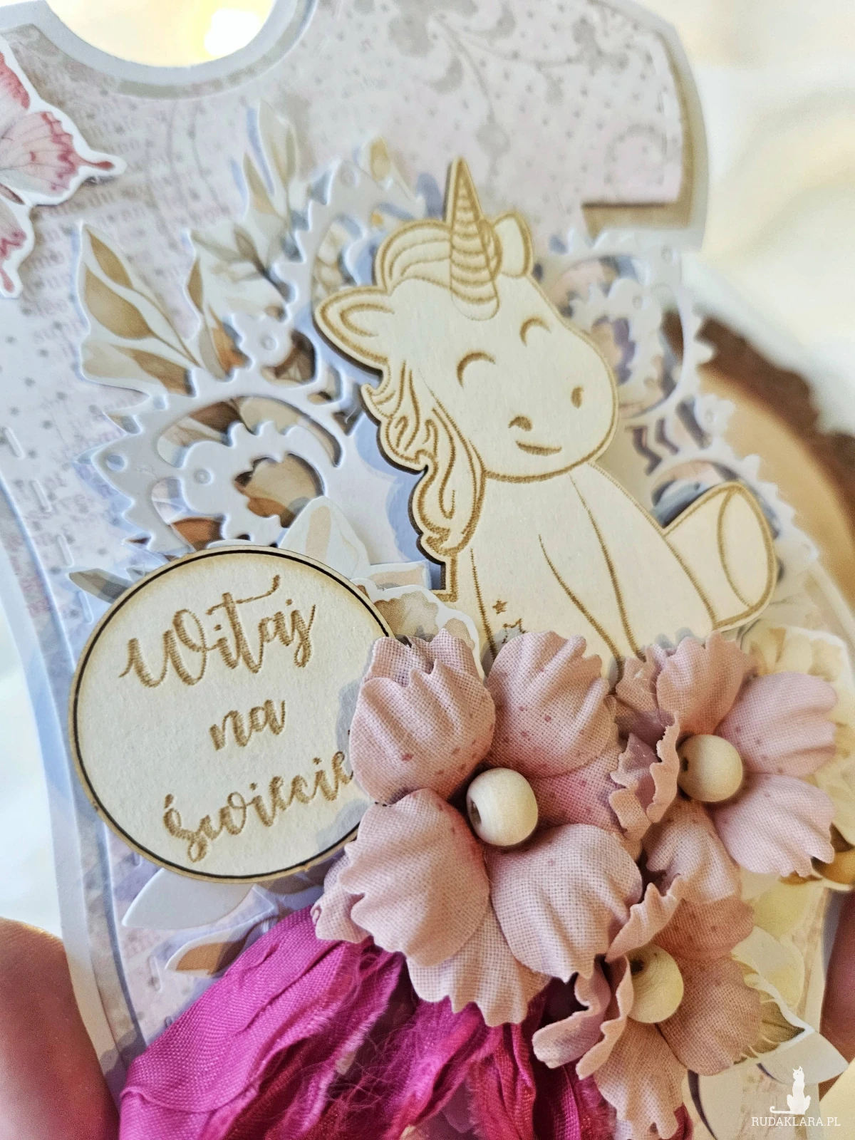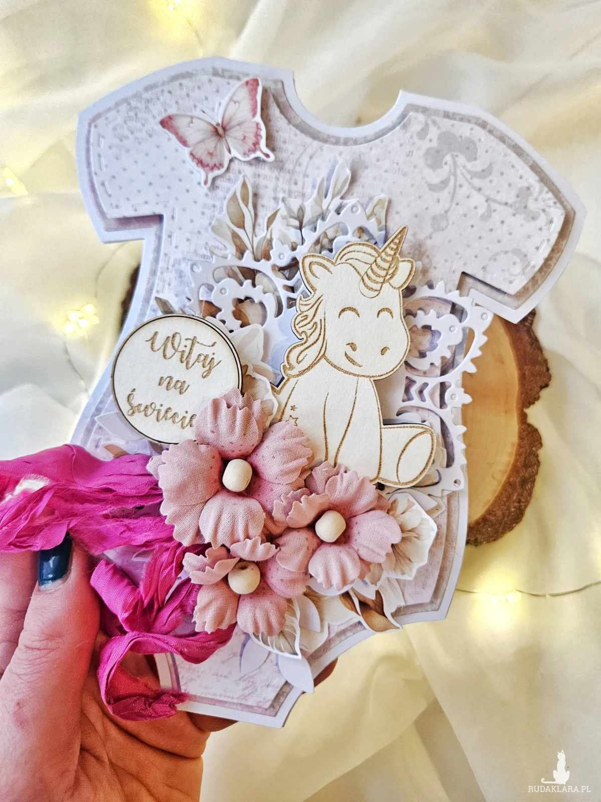 Kartka jest w kształcie dziecięcego body. Oklejona różowymi papierami i ozdobiona dodatkami z papieru, kwiatami z materiału, wstążką oraz koralikami. Świetnie się sprawdzi jako oryginalna pamiątka urodzin maluszka.