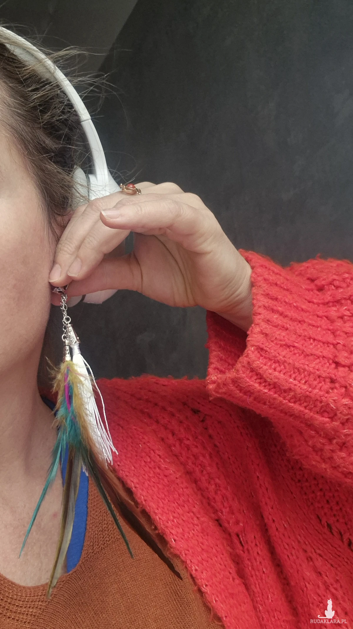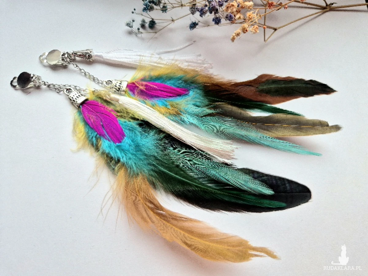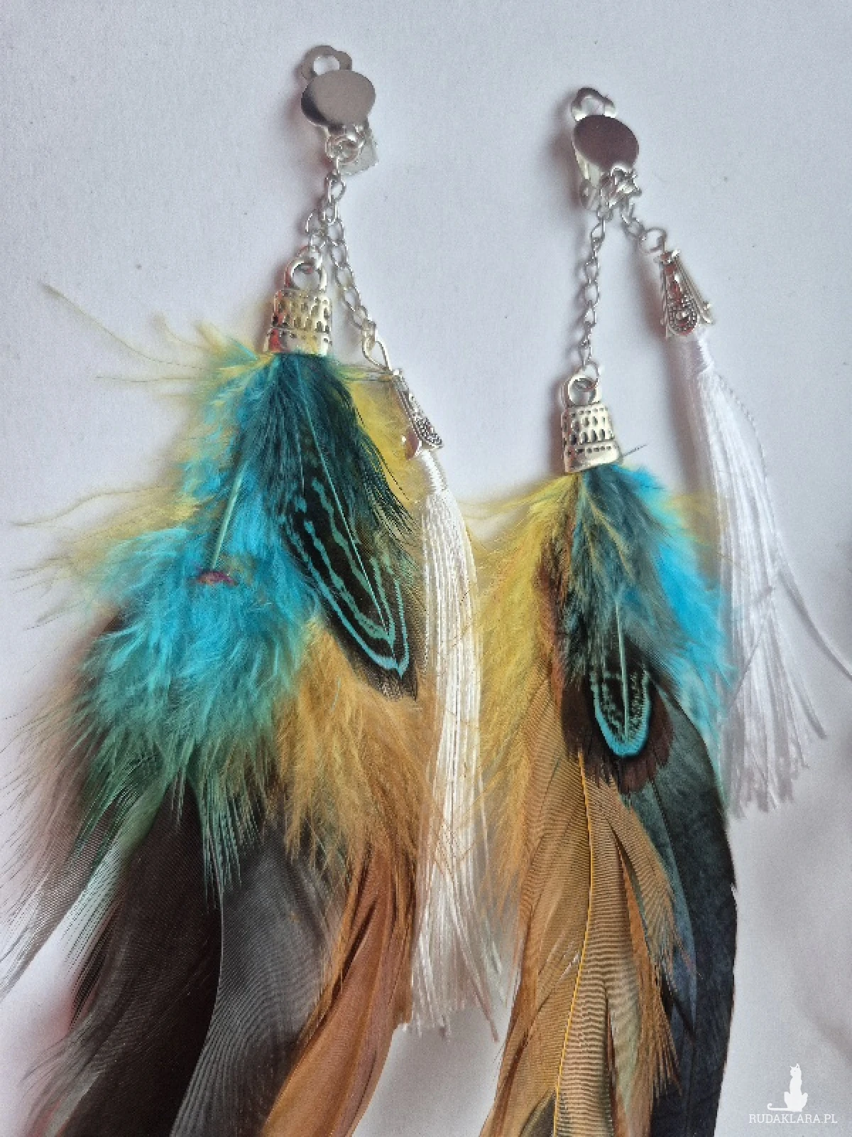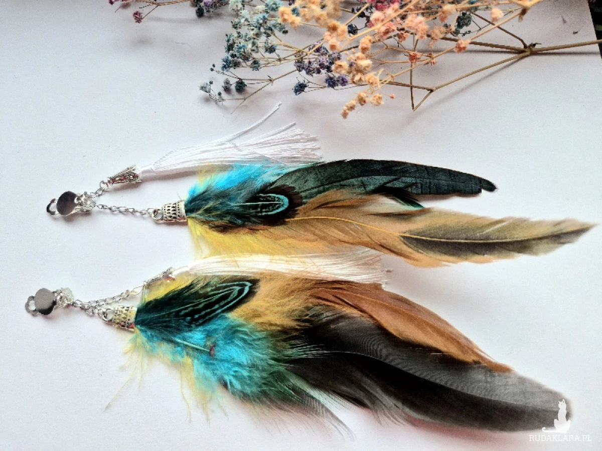 Klipsy kolorowe energetyczne  pióra duże lekkie wykonane w pojedynczym egzemplarzu rękodzieło