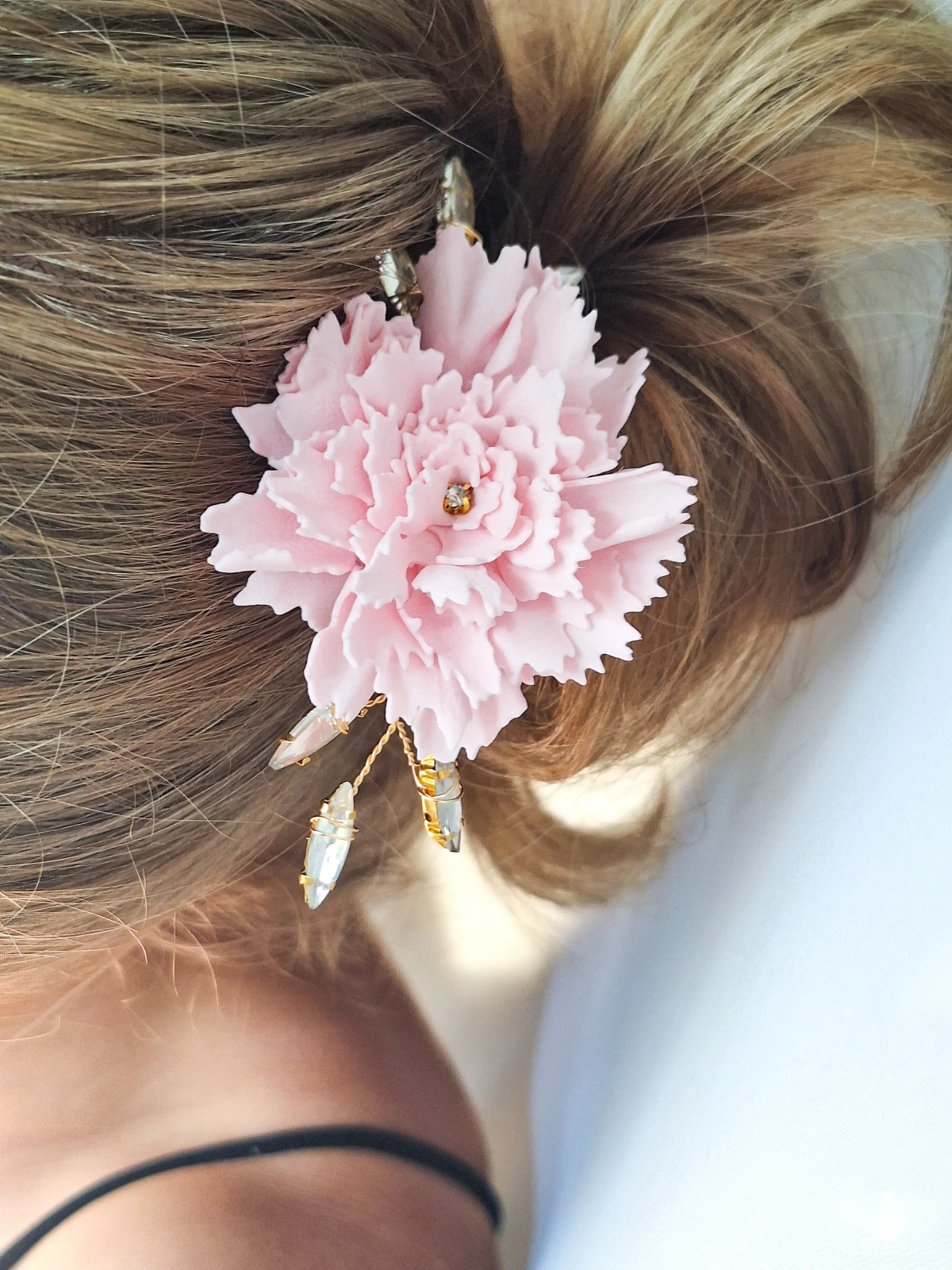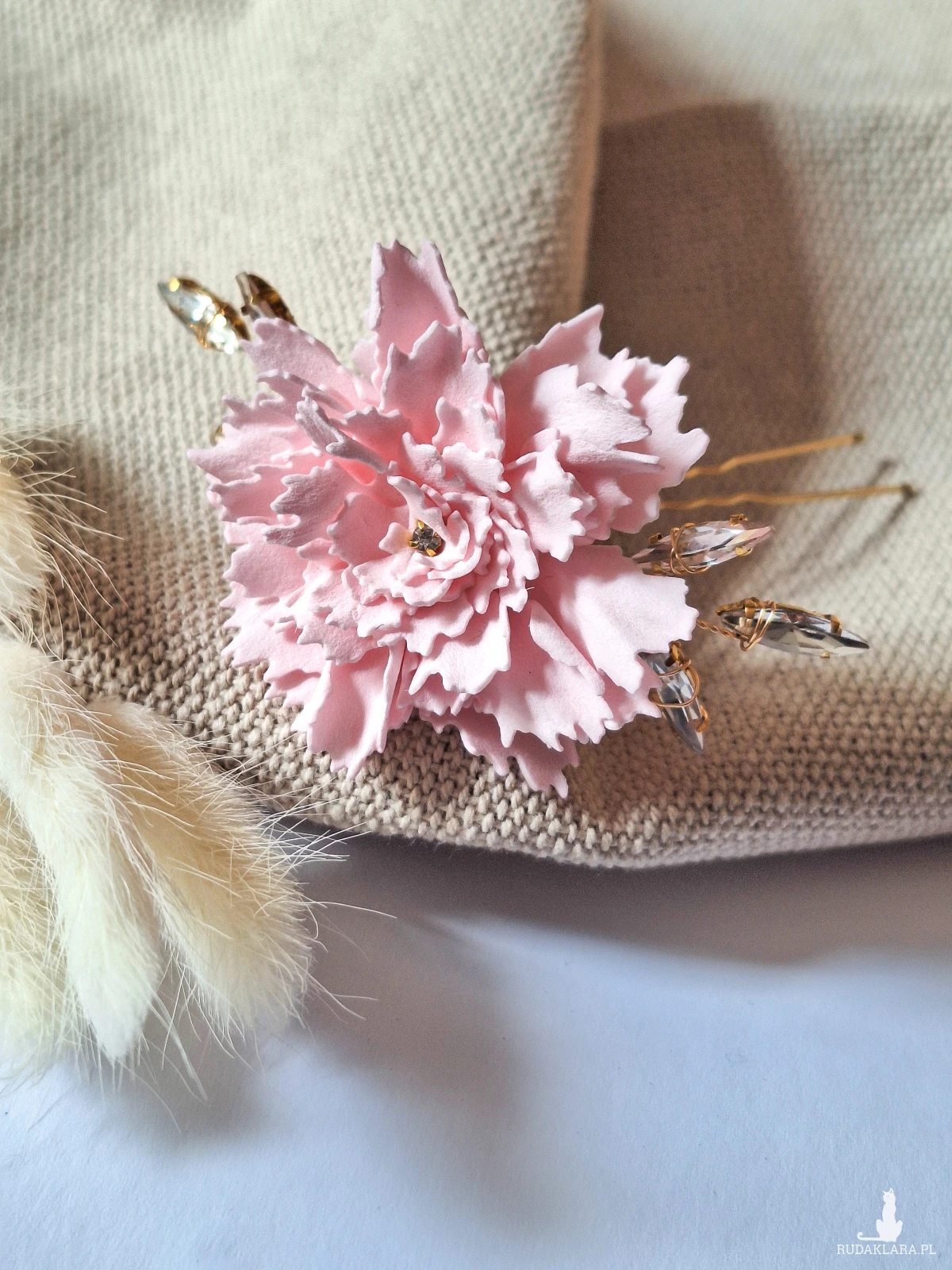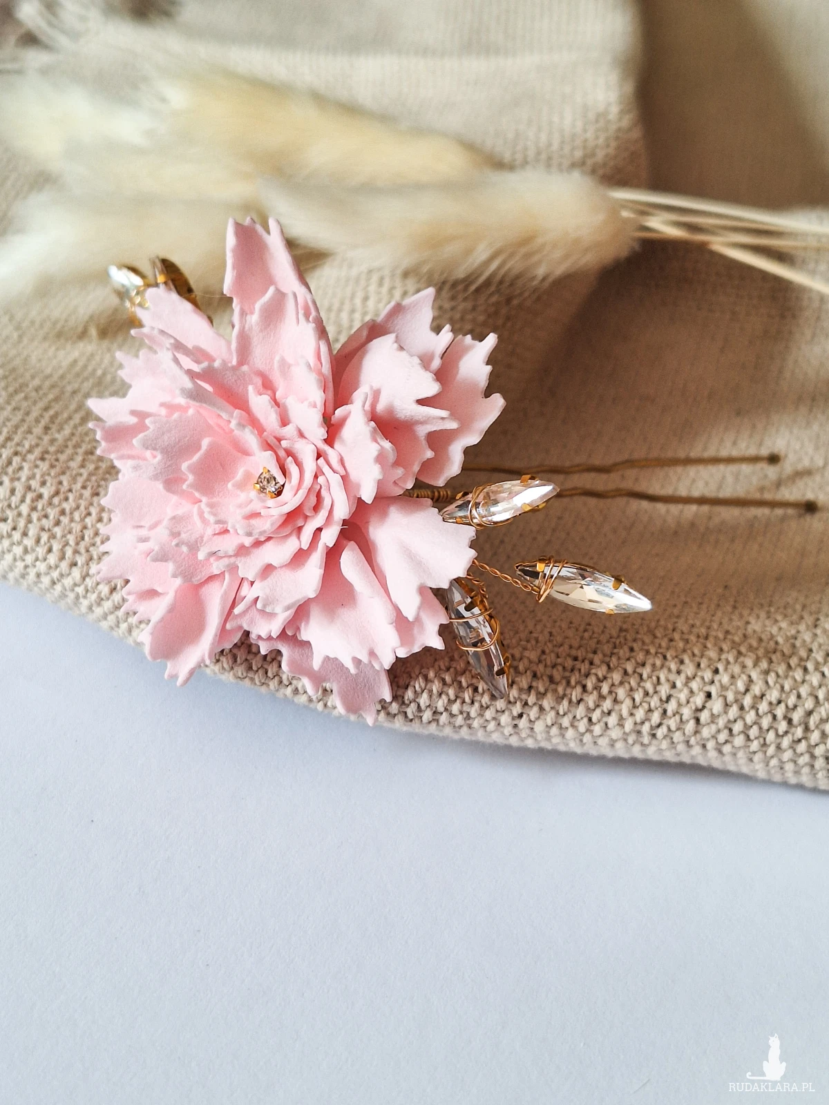 Wyjątkowa kokówka w formie dużego, ręcznie wykonanego kwiatu goździka w pastelowym różu. Umieszczony na złotym drucie julilerskim, ozdobiony kryształkami o pięknym szlifie, tworzą spektakularny i romantyczny dodatek.