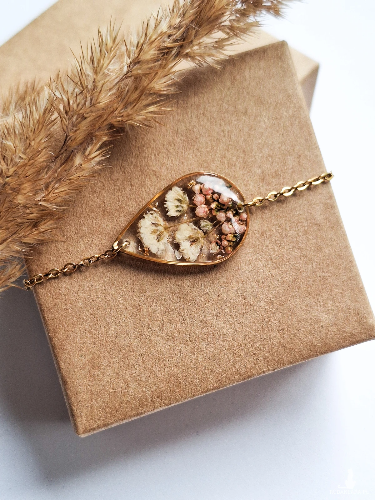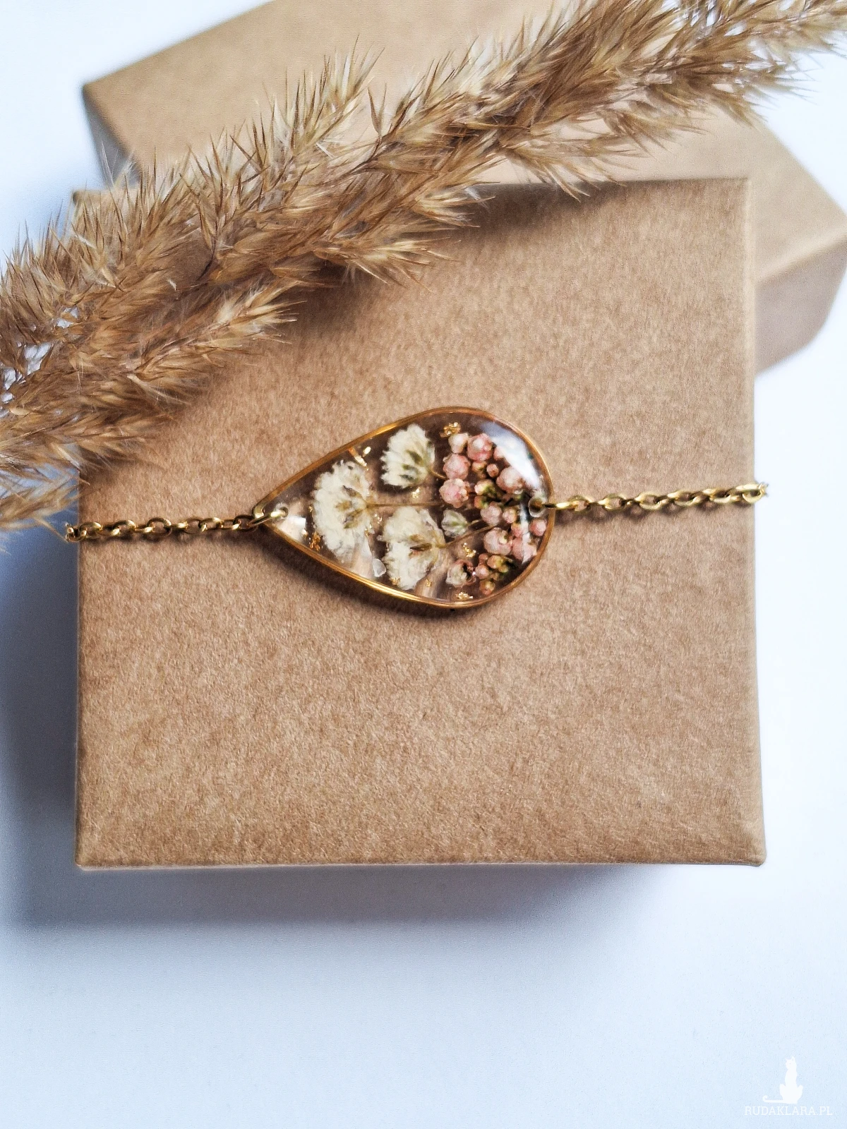 Urocza bransoletka w kształcie łezki z zatopionymi kwiatami białej gipsówki, różowego ozothumnusa i płatkami złota. Wykonana z wysokiej klasy żywicy, która nie zmienia koloru pod wpływem promieniowania uv oraz wysokiej jakości stali chirurgicznej.