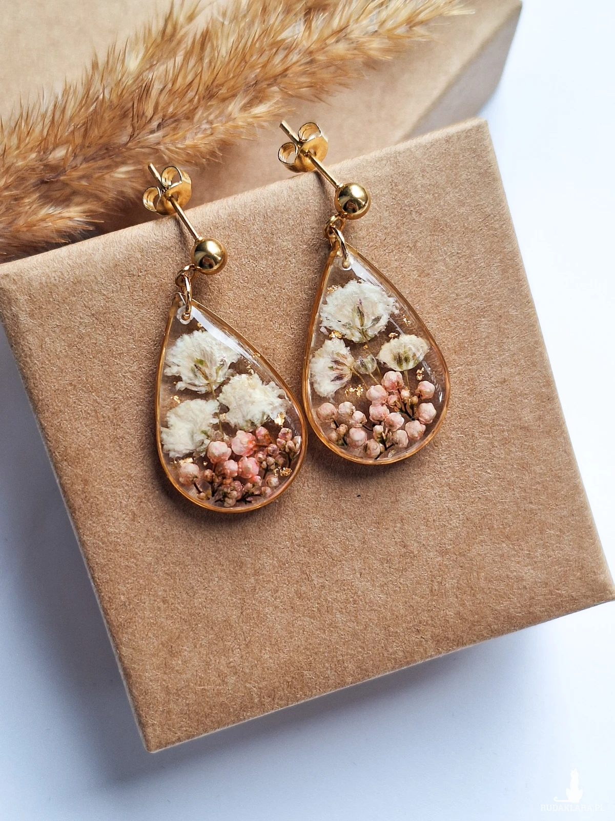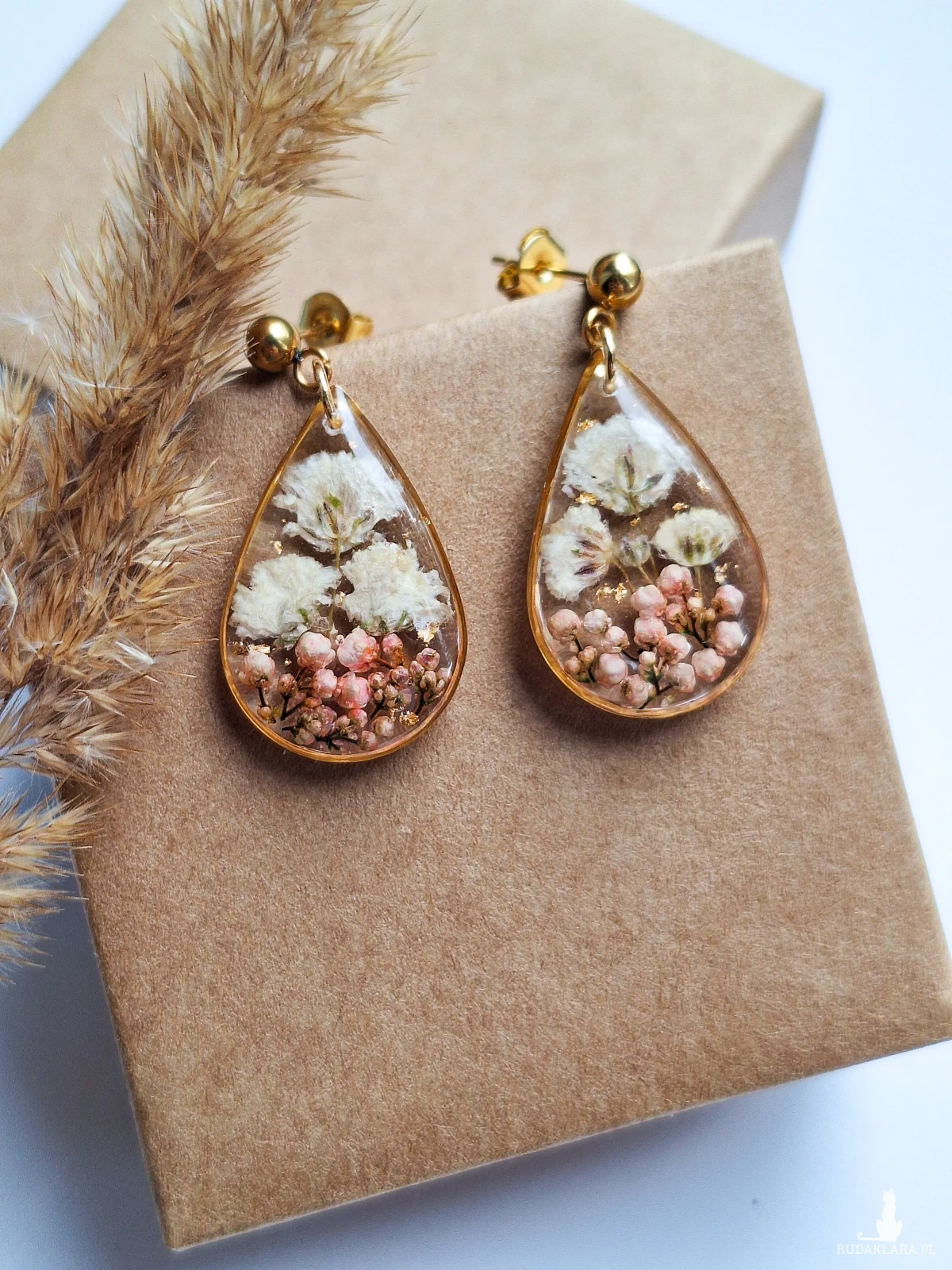 Urocze kolczyki w kształcie łezki z zatopionymi kwiatami białej gipsówki, różowego ozothumnusa i płatkami złota. Wykonane z wysokiej klasy żywicy, która nie zmienia koloru pod wpływem promieniowania UV oraz wysokiej jakości stali chirurgicznej.