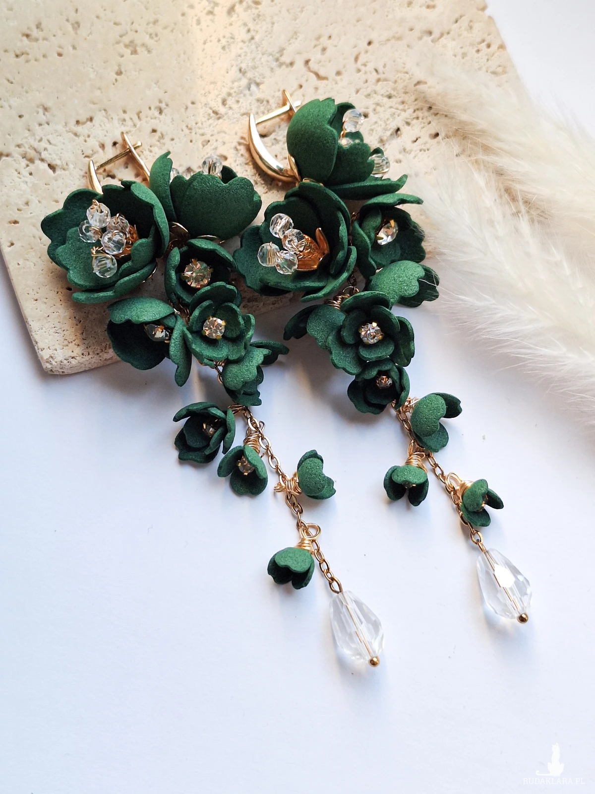 Wyjątkowe, artystyczne kolczyki, które zachwycają swoją lekkością i detalem. Każdy kwiat został wykonany ręcznie, a całość uzupełniają kryształowe akcenty oraz złocone elementy, nadające im elegancji i blasku.
