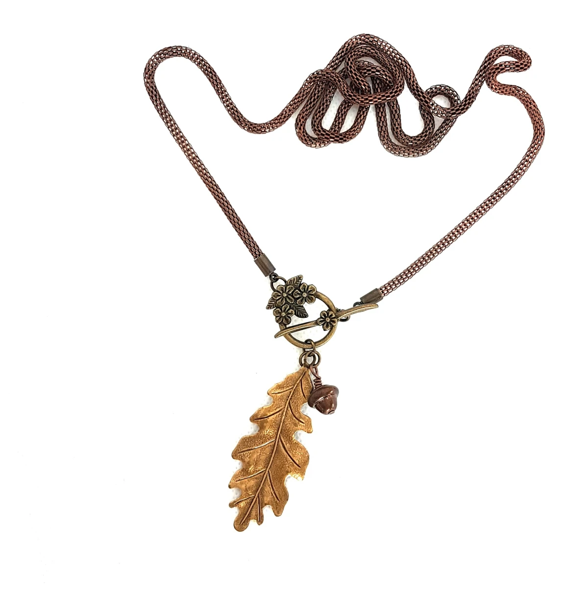 Na metalowym łańcuszku żmijce dł 30 cm zawieszony piękny mosiężny liść dębu i koral szklany w kształcie żołędzia. Bardzo efektowny delikatny naszyjnik. Metal, szkło.