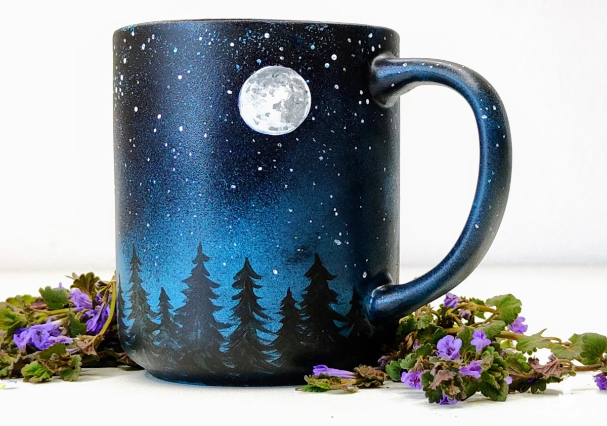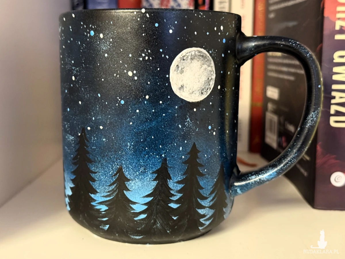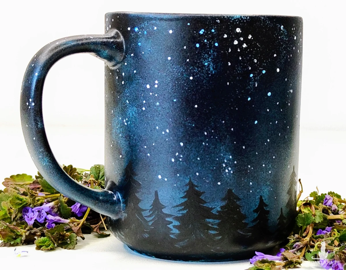 Ręcznie malowany kubek motywem nocnego lasu, kosmosu i księżyca. Został on wykonany przy użyciu wysokiej jakości farb porcelanowych i wypalony w wysokiej temperaturze. Kubek ma pojemność 400 ml.