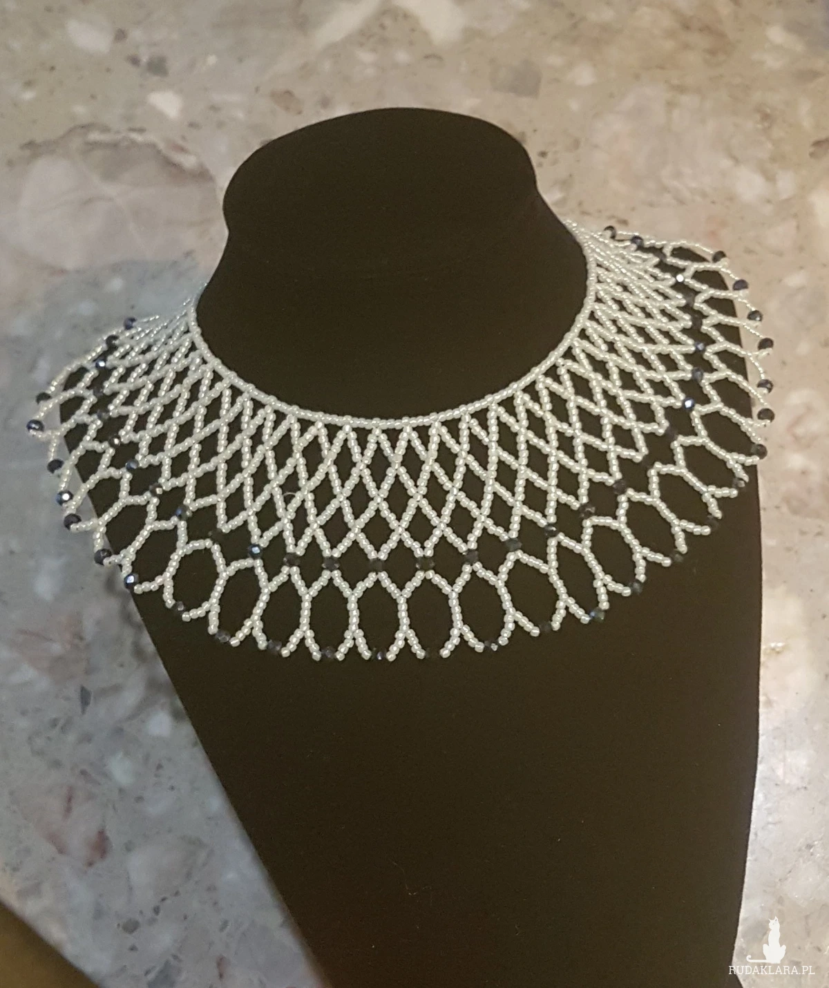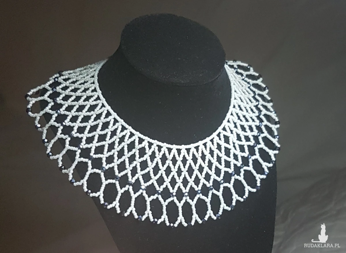 Naszyjnik wypleciony ręcznie z drobnych koralików szklanych z dodatkiem koralików fasetowanych 3 mm w czarnym kolorze. Objętość wokół szyi 38-40 cm, szerokość 5 cm