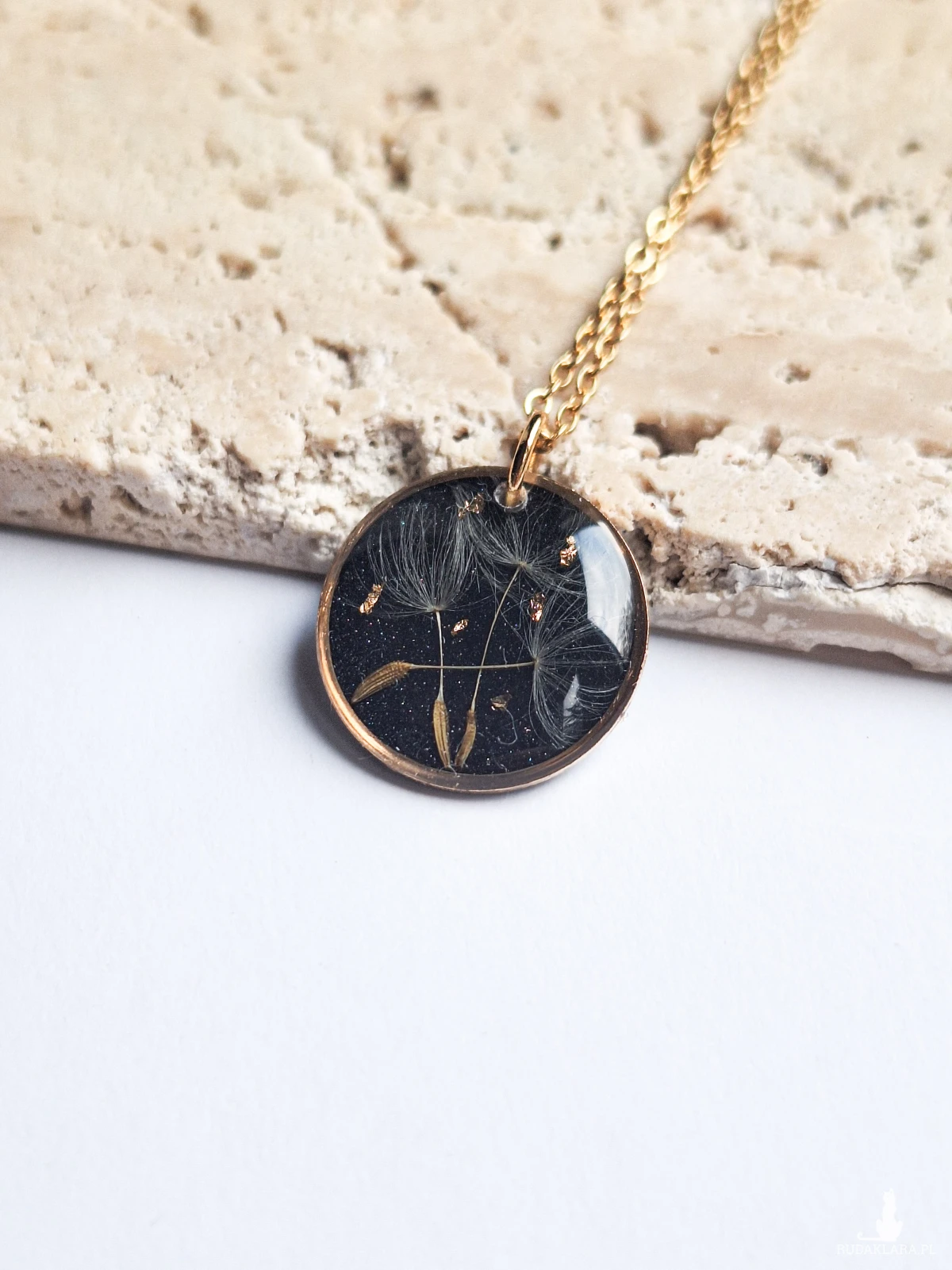 Uroczy wisiorek z zatopionymi nasionami dmuchawca i płatkami złotana czarnym, połyskującym tle. Wykonany z wysokiej klasy żywicy, która nie zmienia koloru pod wpływem promieniowania uv oraz wysokiej jakości stali chirurgicznej.