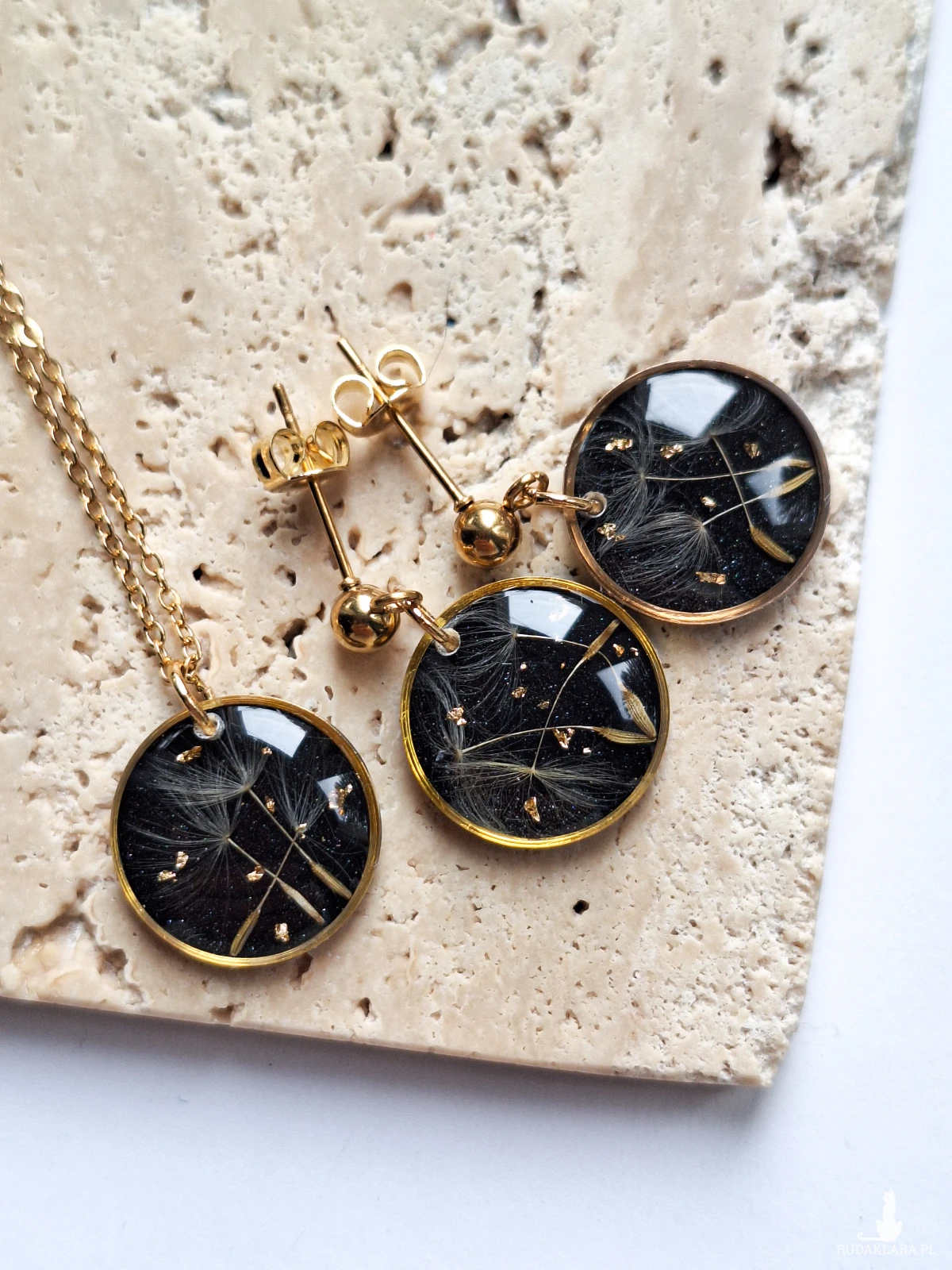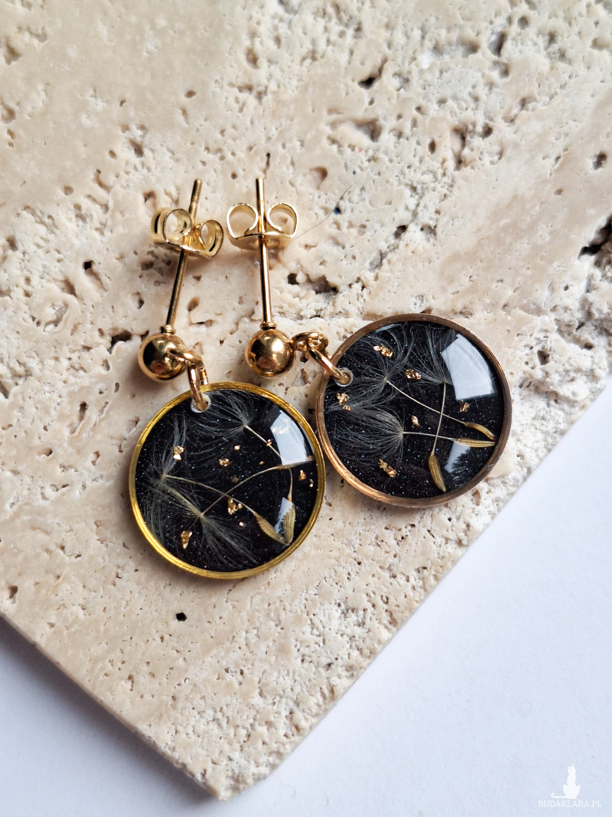 Urocze kolczyki w kształcie kółka z zatopionymi nasionami dmuchawca i płatkami złota na czarnym, błyszczącym tle. Wykonane z wysokiej klasy żywicy, która nie zmienia koloru pod wpływem promieniowania UV oraz wysokiej jakości stali chirurgicznej.