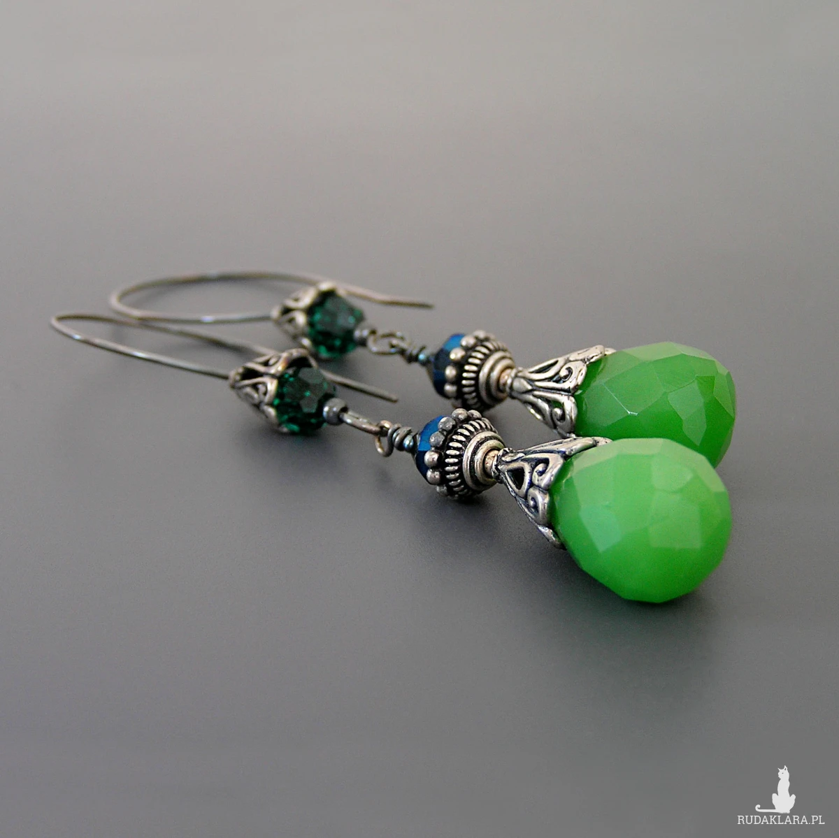Kolczyki retro z kroplami jadeitu o wymiarach 18 x 12 mm i kryształkami w kolorze zielonym i granatowym o wymiarach 6 x 6 mm.