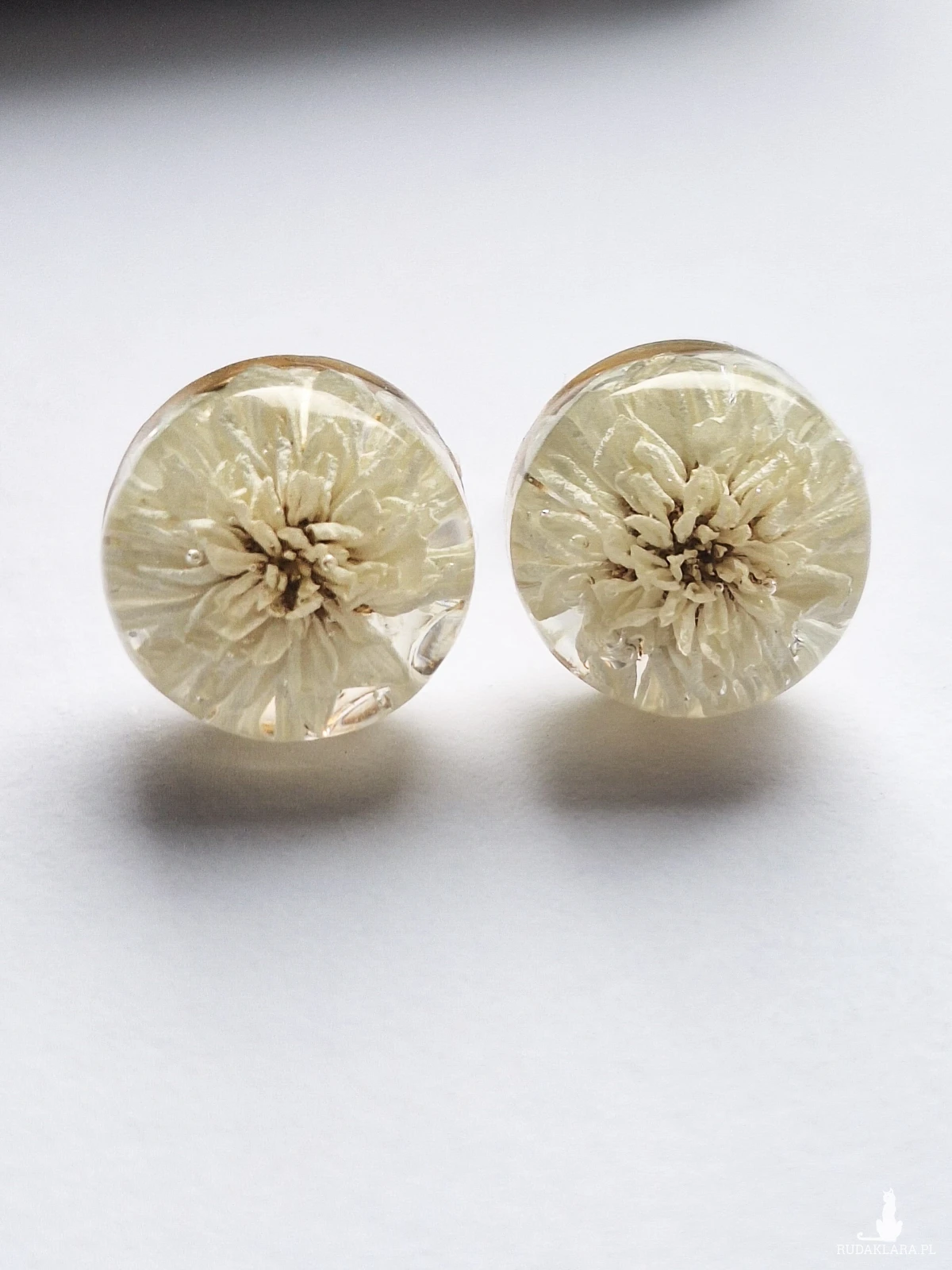 Urocze kolczyki sztyfty z zatopionym kwiatem krwawnika. Wykonane z wysokiej klasy żywicy, która nie zmienia koloru pod wpływem promieniowania UV oraz wysokiej jakości stali chirurgicznej.