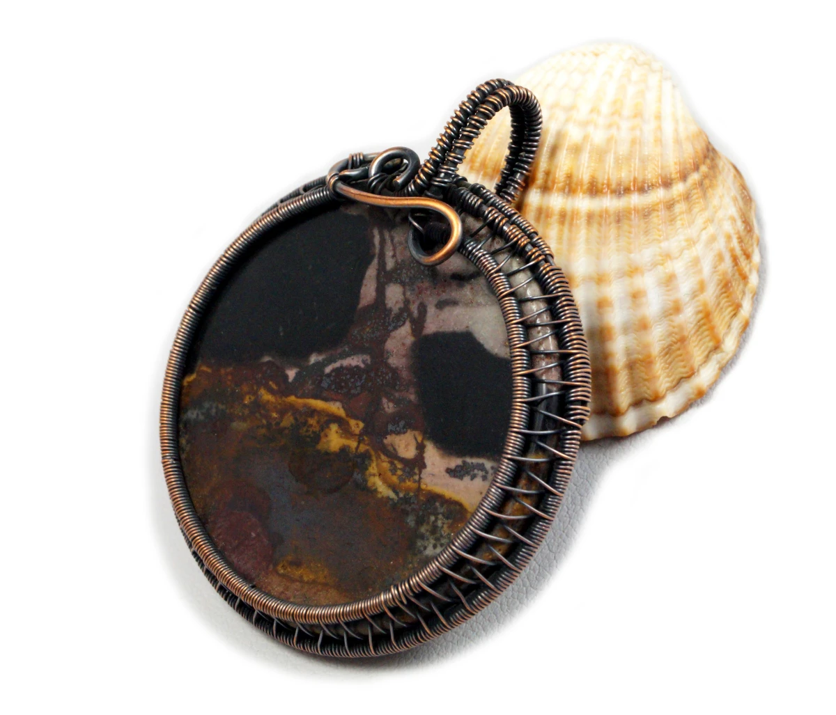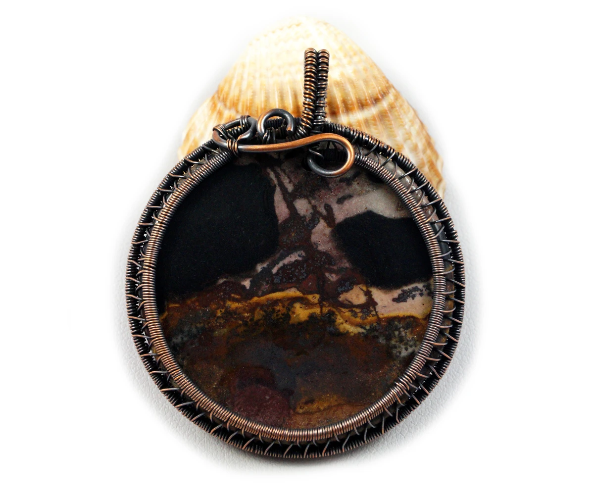 Oryginalny, misternie pleciony wisior z plastrem jaspisu krajobrazowego w brązowym kolorze.