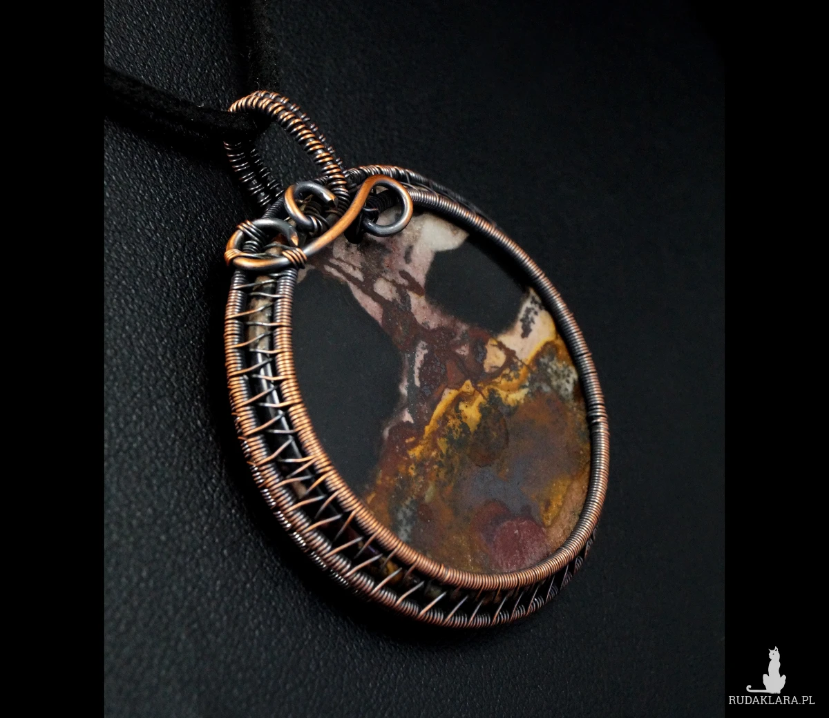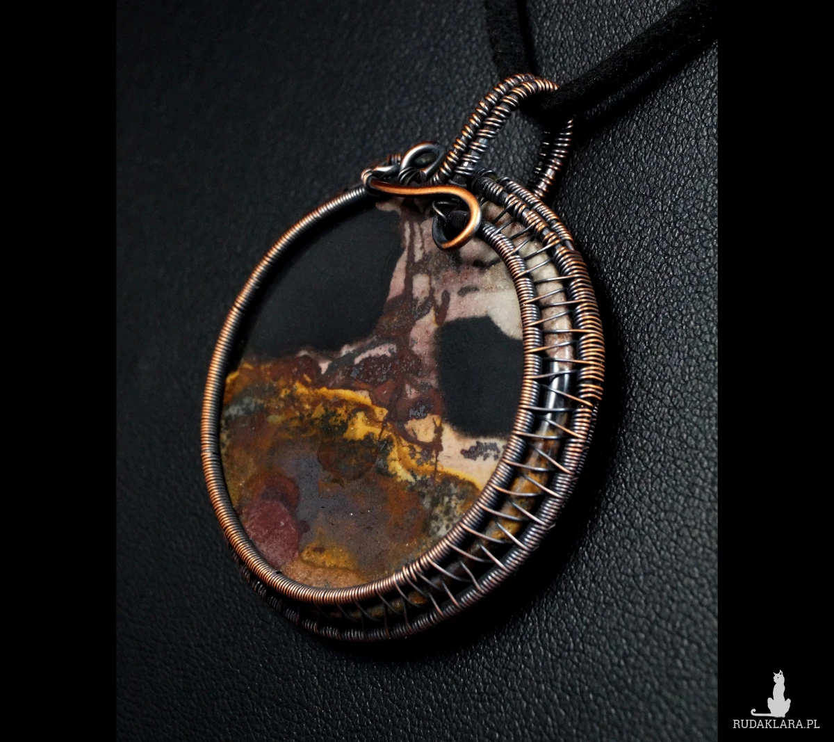 Wisior zaprojektowany i wykonany przeze mnie od podstaw bardzo pracochłonną i precyzyjną techniką wire-wrapping z oksydowanej miedzi.