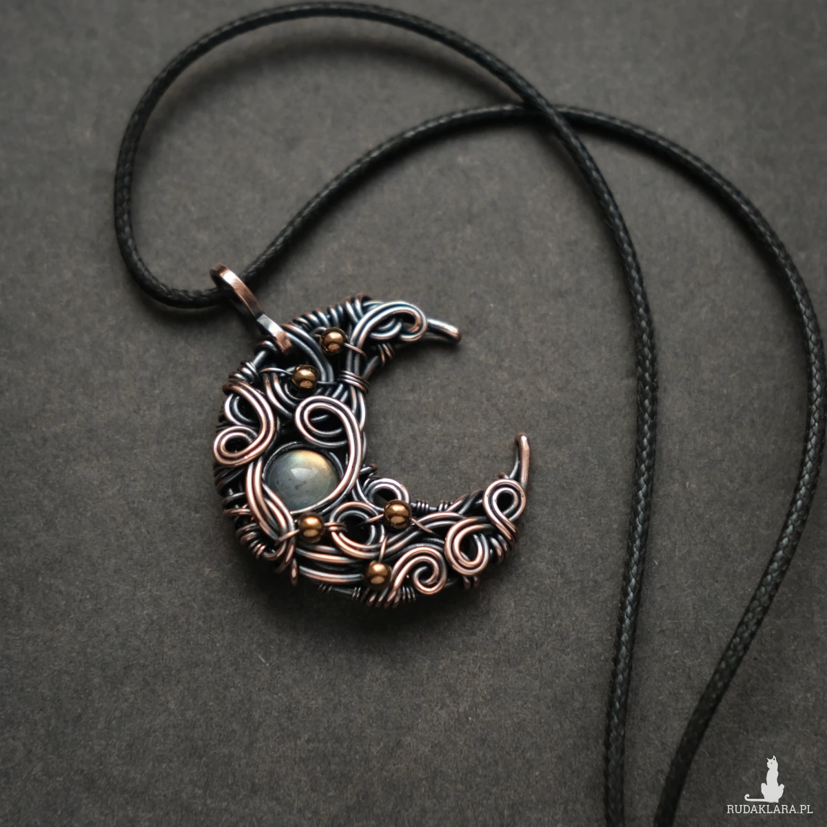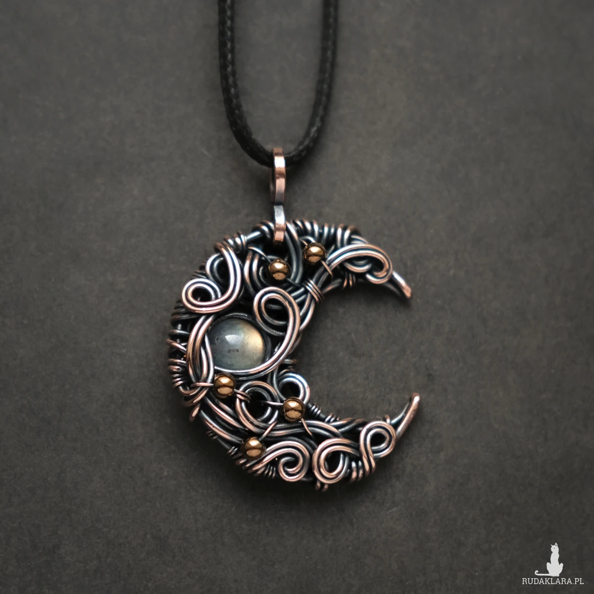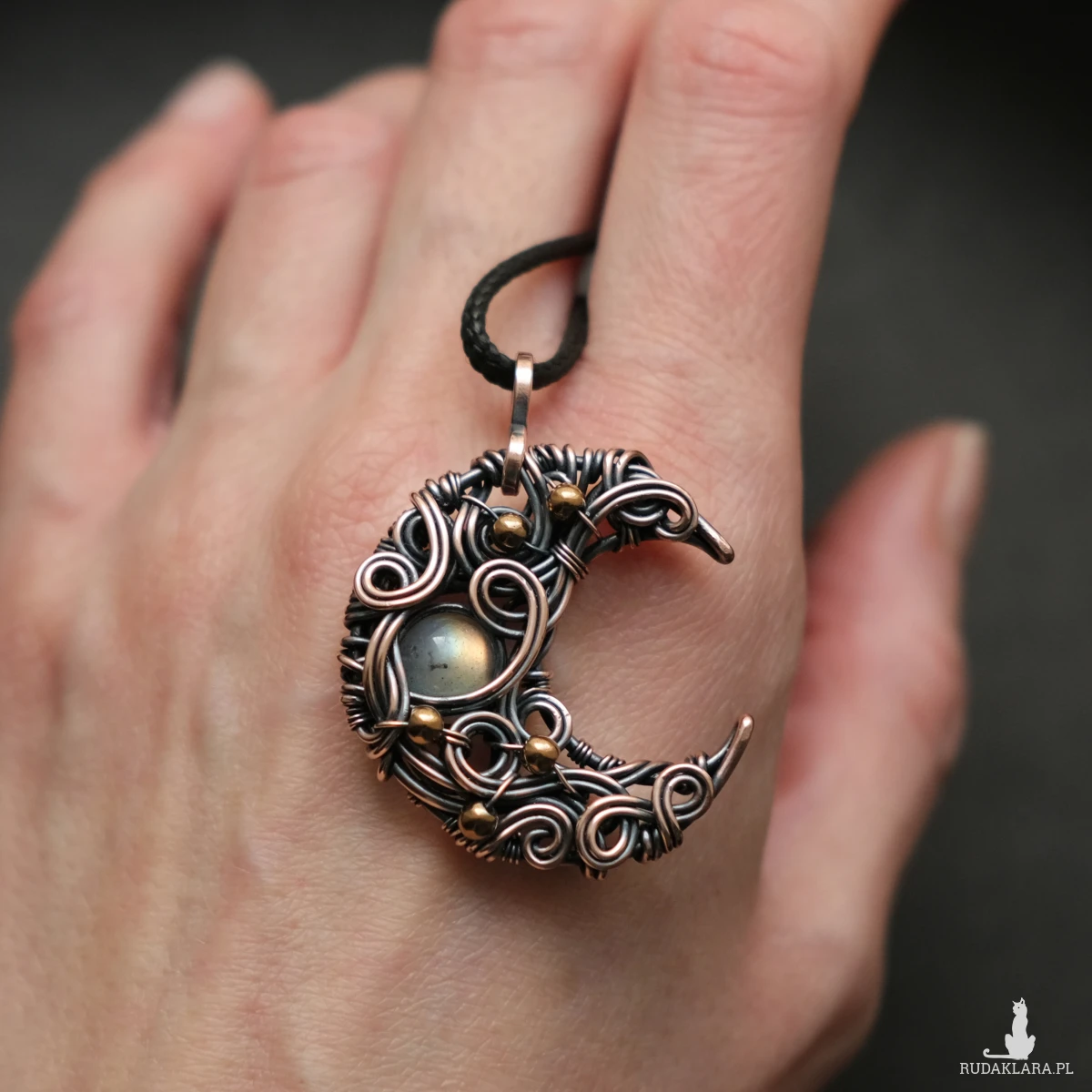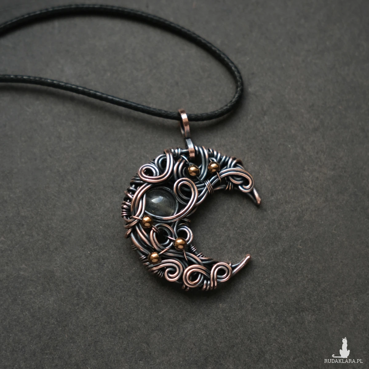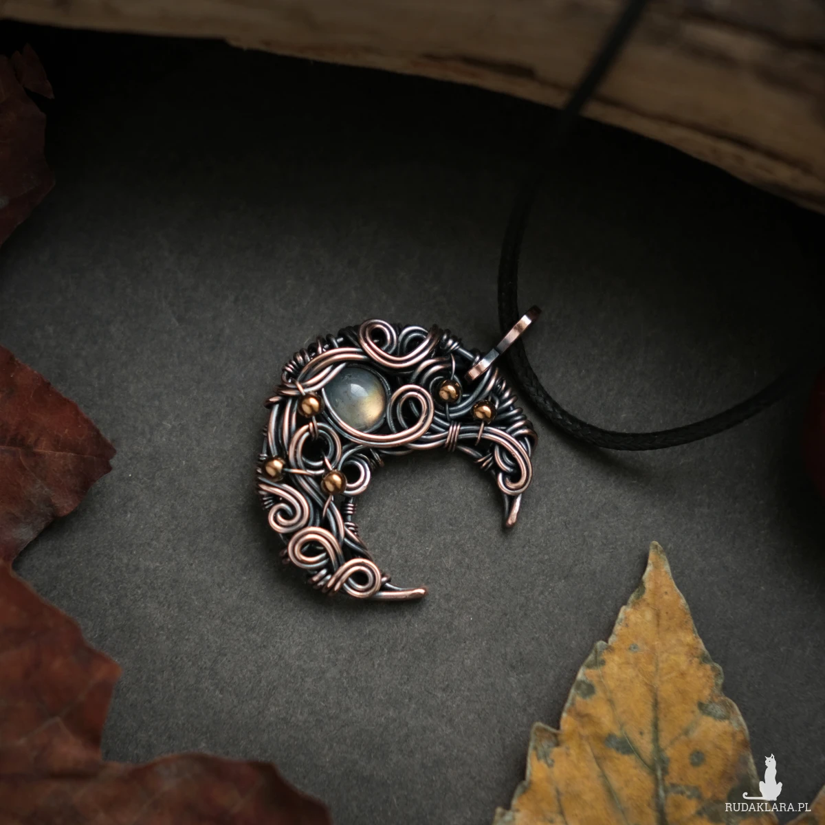 Wisiorek miedziany księżyc lunula labradoryt i hematyty wire wrapping