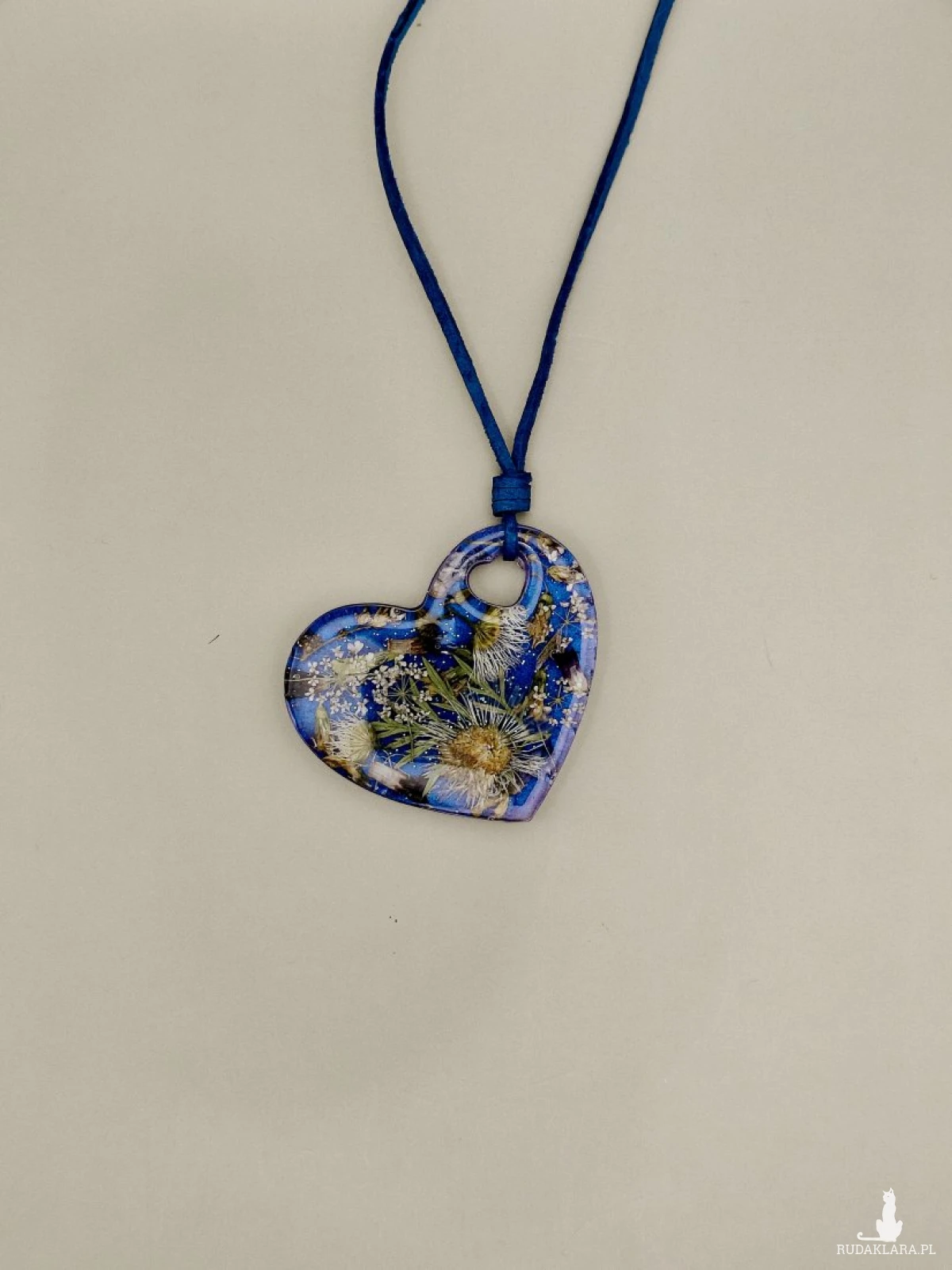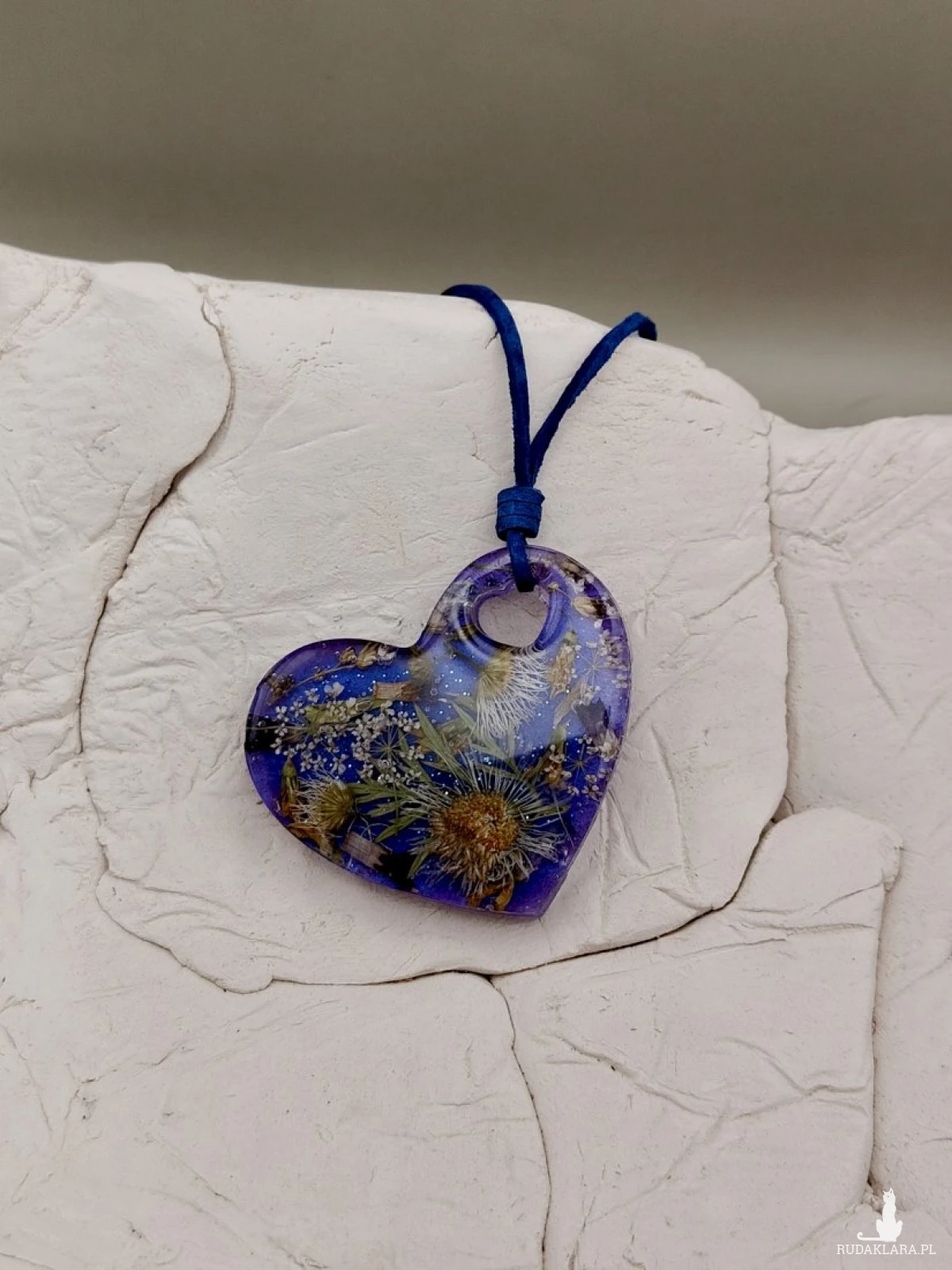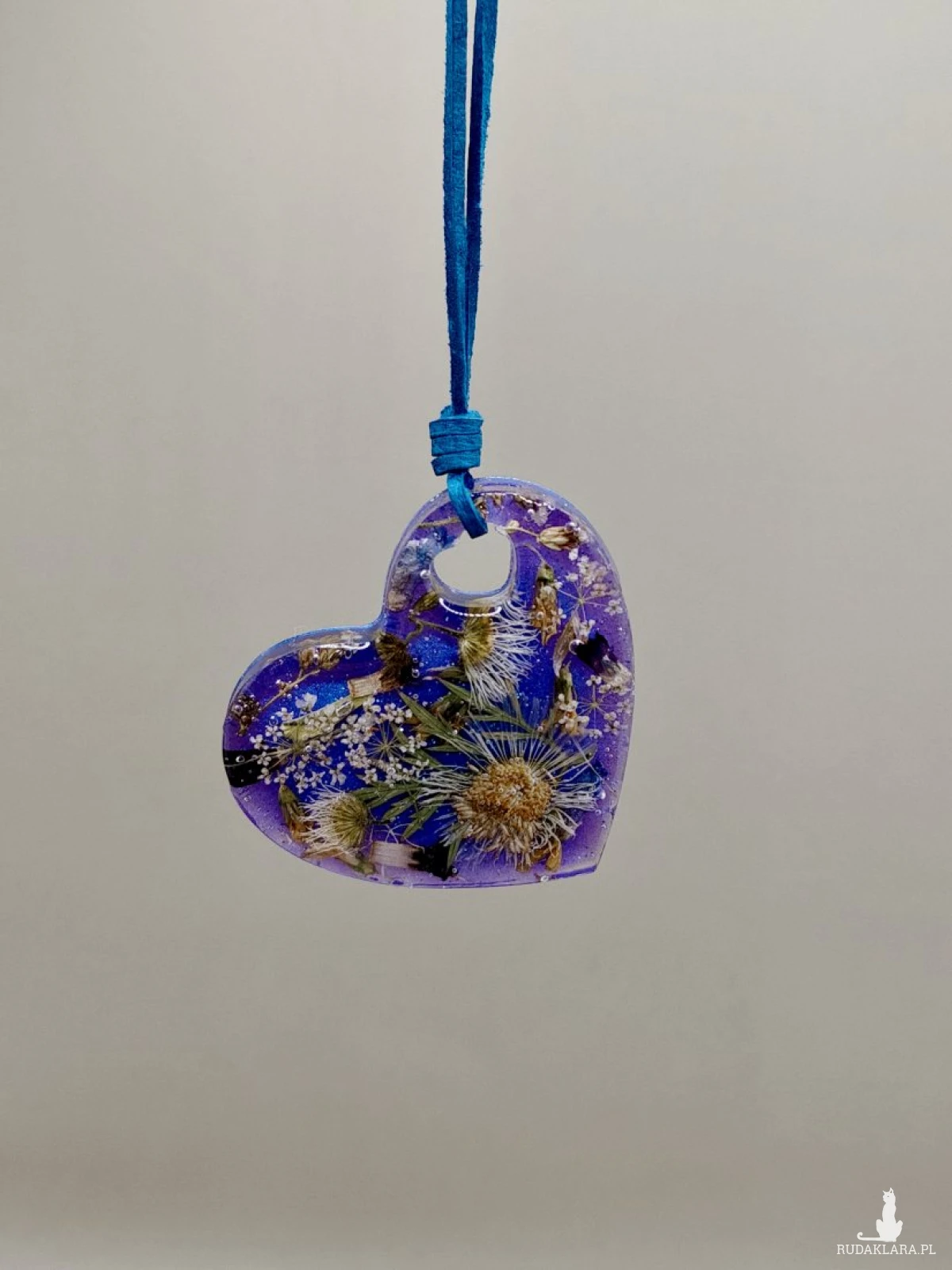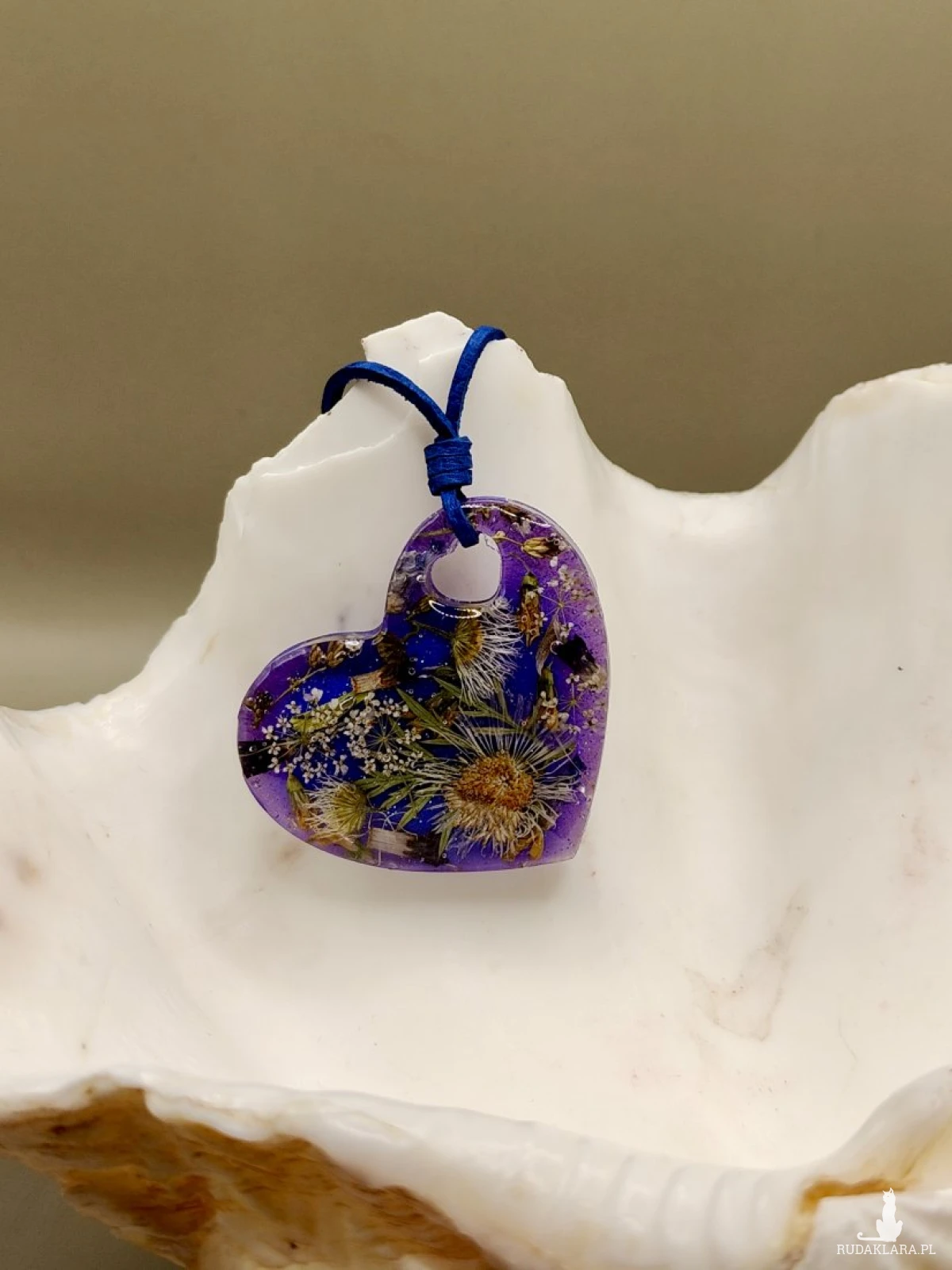 Ręcznie wykonany wisiorek w kształcie serca z zatopionymi naturalnymi, suszonymi roślinami. Przezroczysta żywica o fioletowym zabarwieniu tworzy eleganckie tło, które podkreśla delikatne, kremowe i zielone akcenty kwiatów. Całość zawieszona jest na intensywnie niebieskim sznurku, co dodaje biżuterii wyrazistego, artystycznego charakteru. To wyjątkowy dodatek dla osób ceniących naturę, kolor i unikatowe rękodzieło.