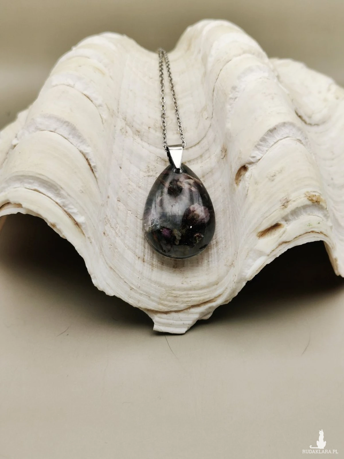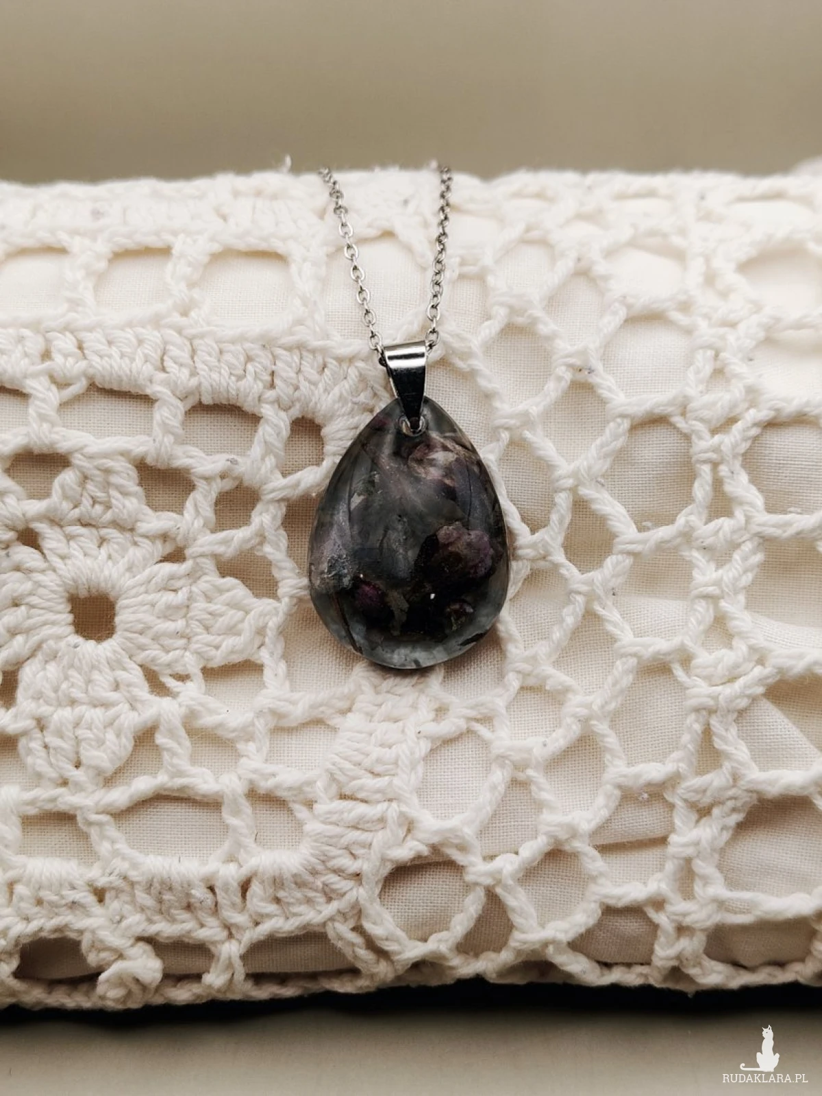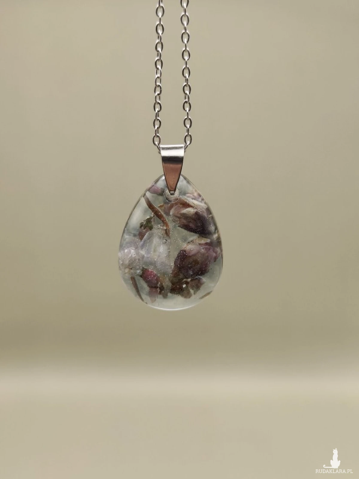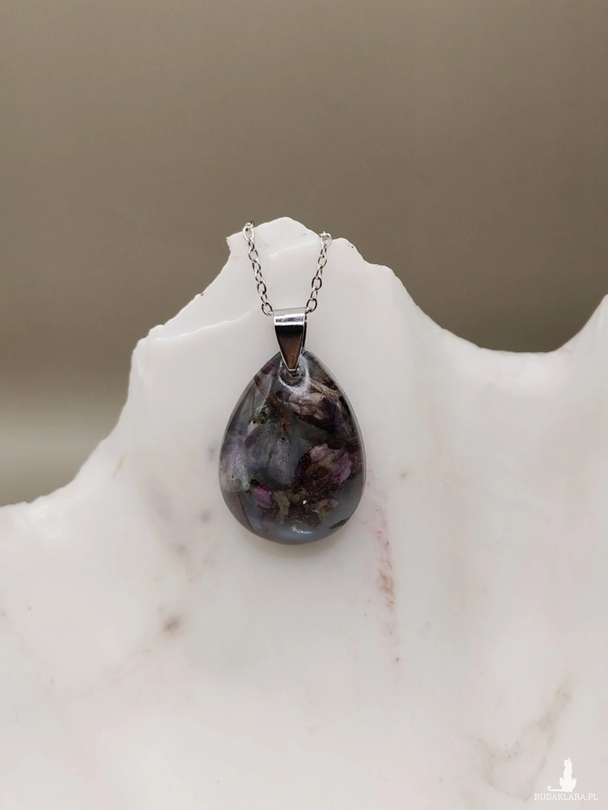 Elegancki wisiorek wykonany z przejrzystej żywicy, wewnątrz której zatopiono delikatne, naturalne kwiaty w odcieniach fioletu, różu i zieleni. Tworzą one subtelną, tajemniczą kompozycję przypominającą nocny ogród. Kropla żywicy osadzona jest na minimalistycznej, metalowej zawieszce i zawieszona na srebrzystym łańcuszku. Biżuteria idealna dla osób ceniących naturę, unikalne rękodzieło oraz niepowtarzalne dodatki.