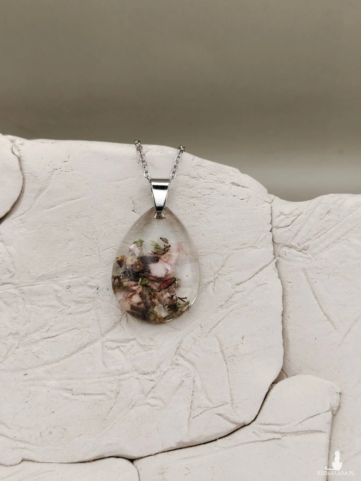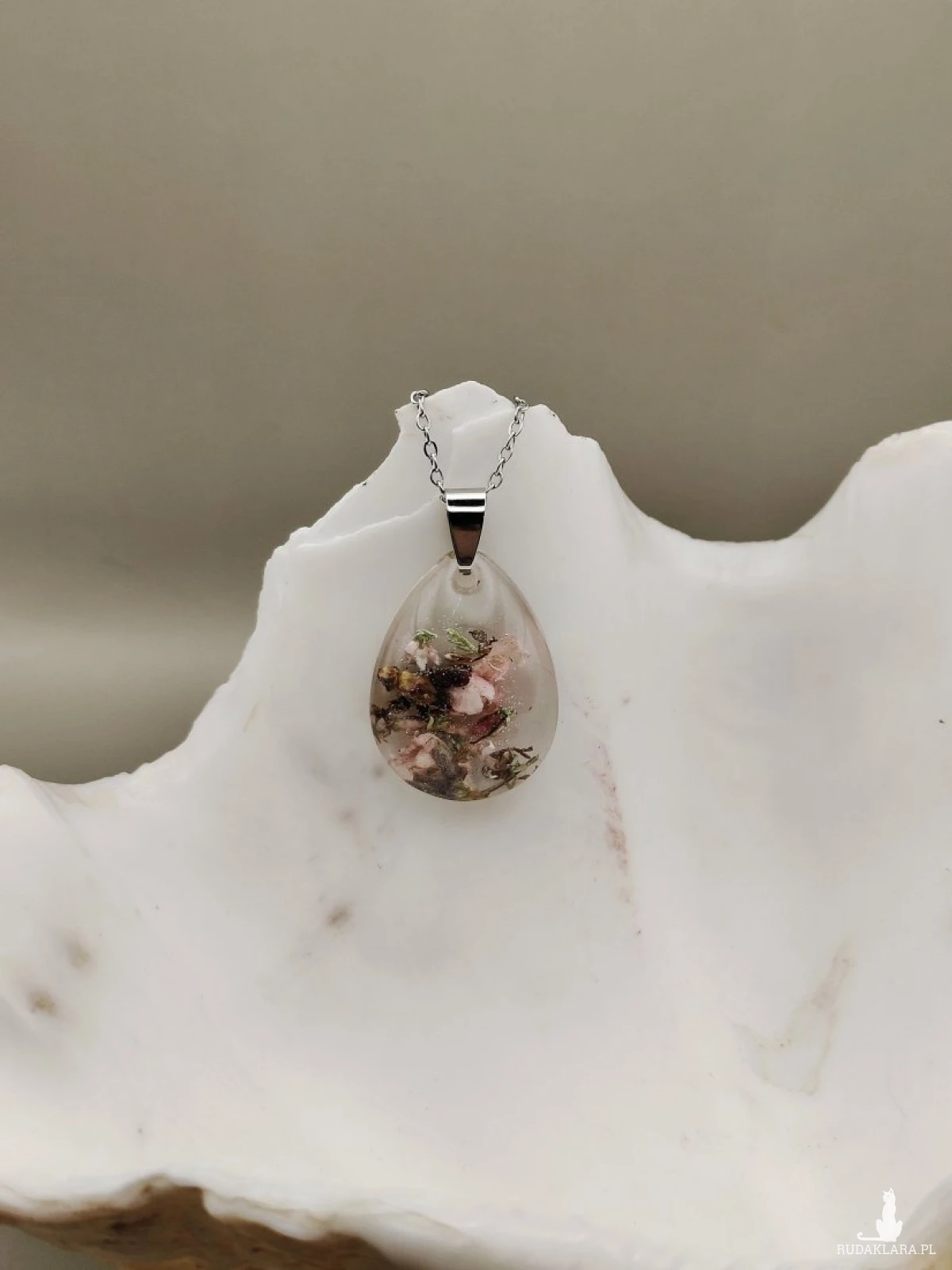 Delikatny, ręcznie wykonany wisiorek z przejrzystej żywicy, w której zatopione zostały drobne, pastelowe kwiaty. Subtelna kompozycja nadaje biżuterii romantyczny, naturalny charakter. Transparentna forma sprawia, że kwiaty wyglądają jak zawieszone w czasie, a całość pięknie prezentuje się zarówno na co dzień, jak i jako elegancki dodatek do wyjątkowych stylizacji.