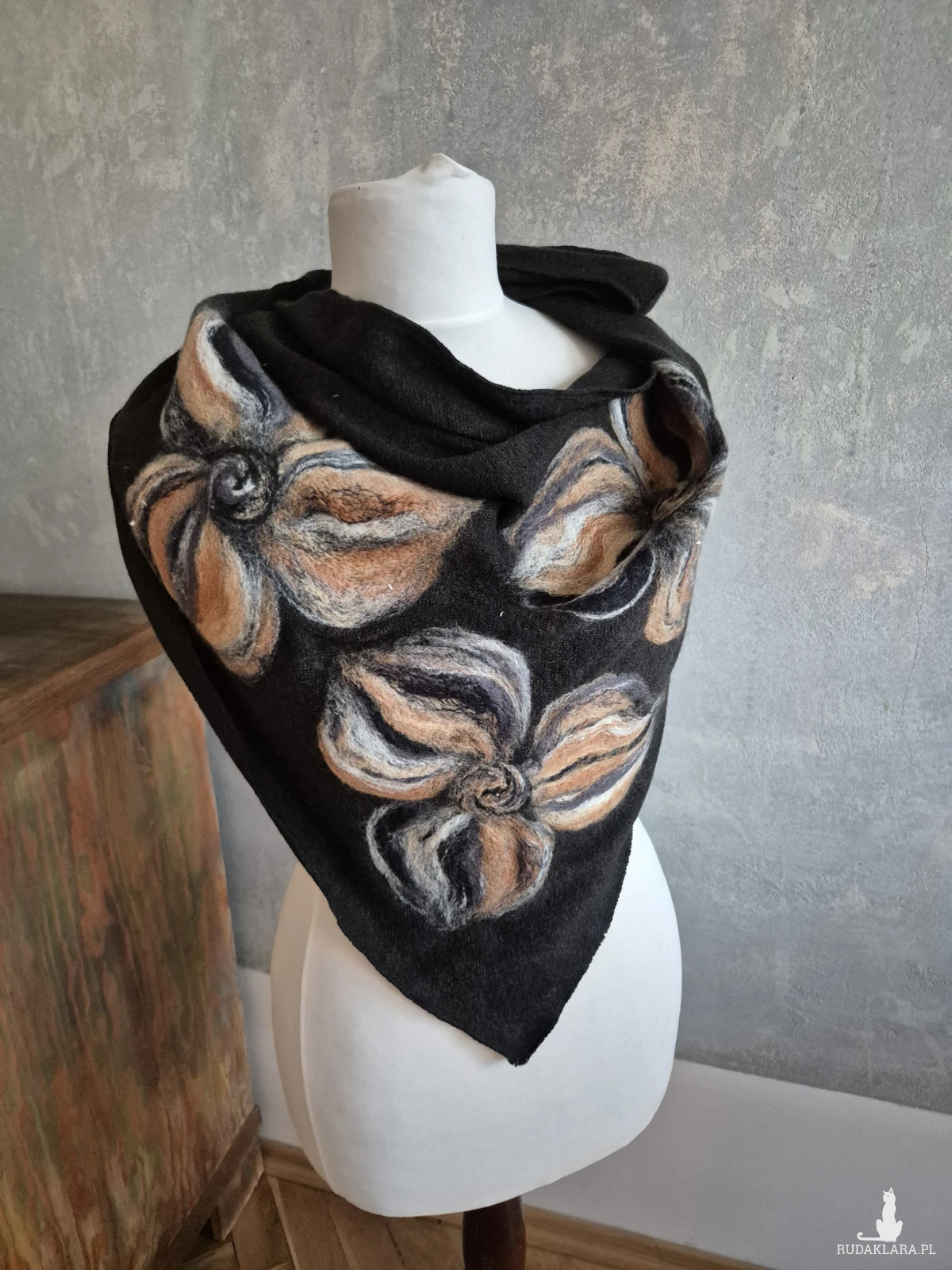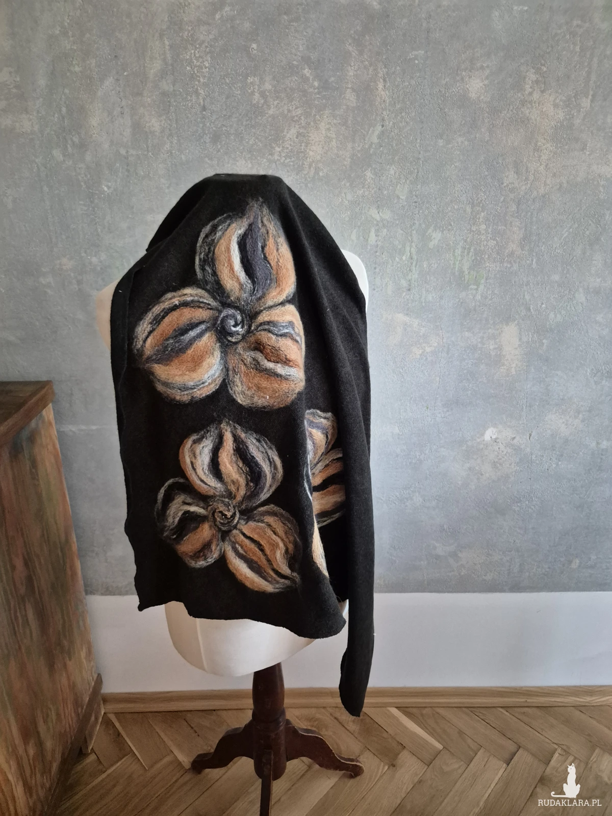 Czarna chusta handmade wełniana, elementy filcowane to wełna merynosów, produkt wysokiej jakości, chusta miła i ciepła, doskonała na chłodne dni, idealna na prezent, wspaniała na codzienne noszenie, zwraca uwagę swą oryginalnością, miękko układa się wokół szyi, absolutny bestseller polecam czas oczekiwania tydzien box y1