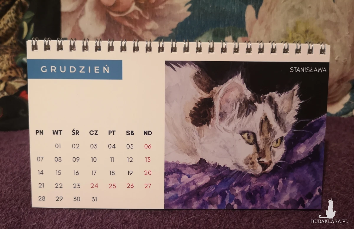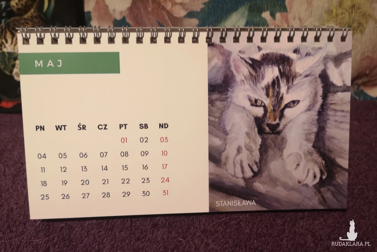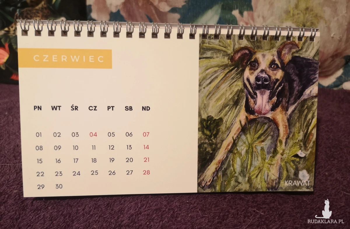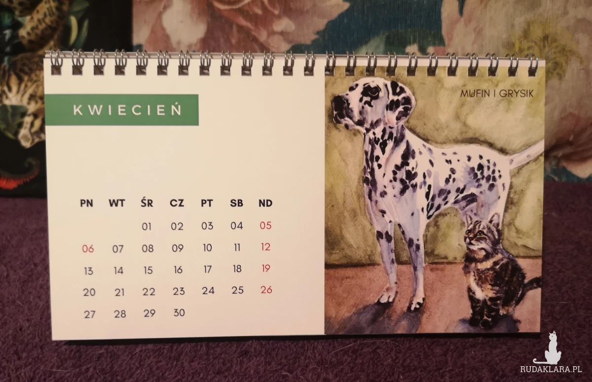 Autorski kalendarz biurkowy z reprodukcjami portretów kotów i psów (moich, moich znajomych oraz z kocich fundacji).
