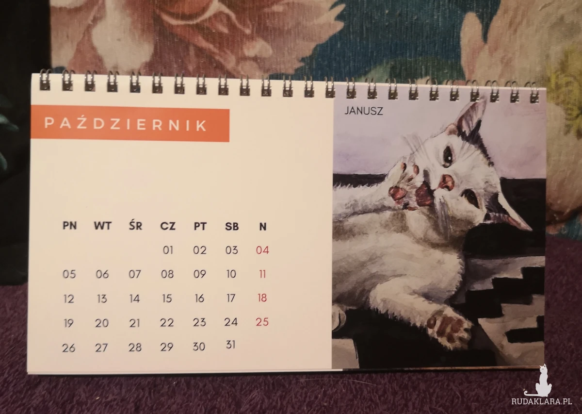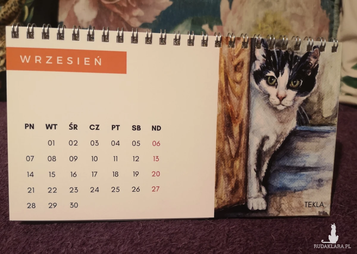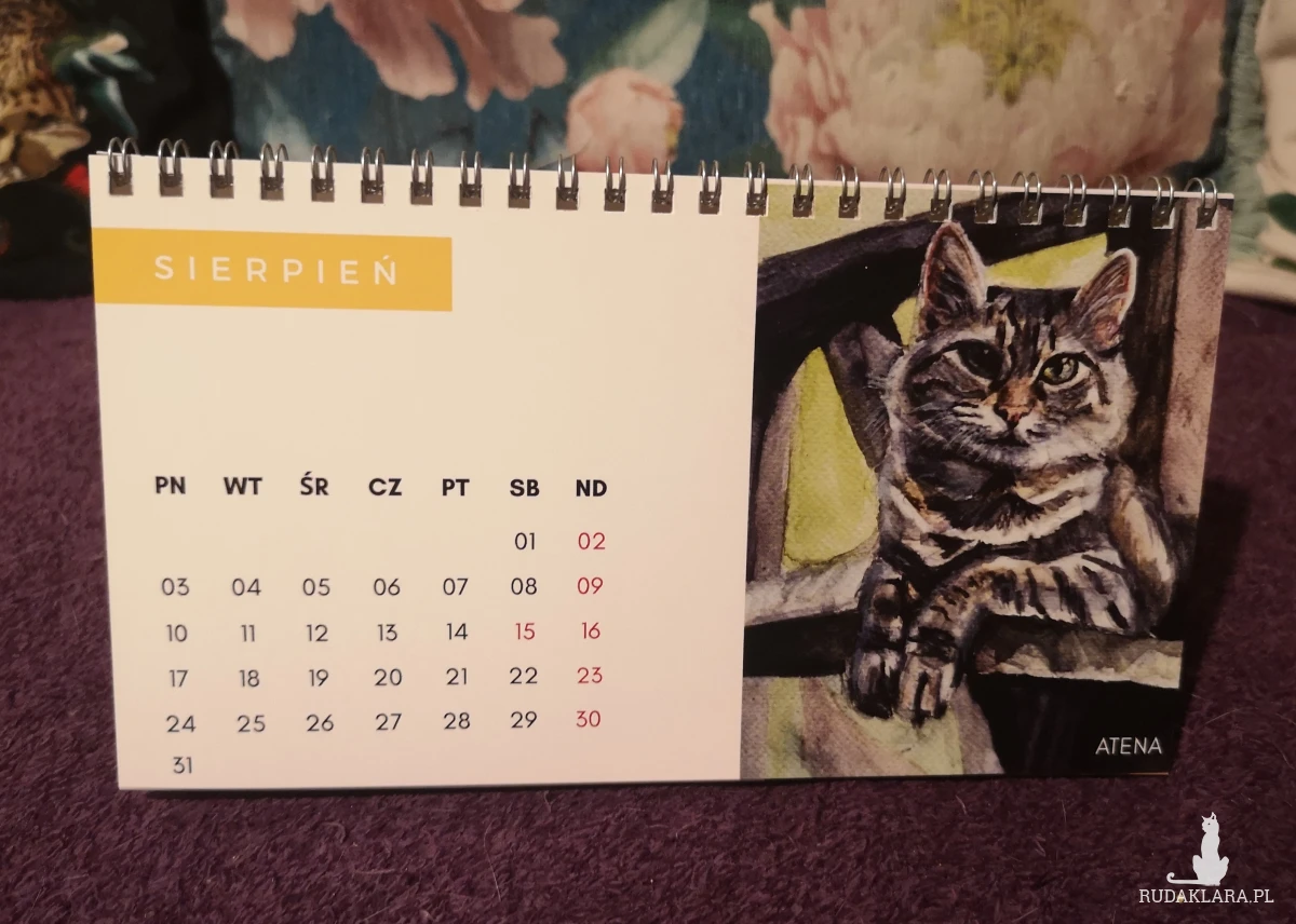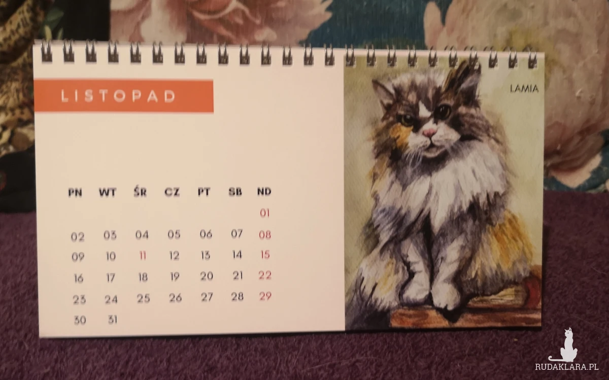 Autorski kalendarz biurkowy z reprodukcjami portretów kotów i psów (moich, moich znajomych oraz z kocich fundacji).