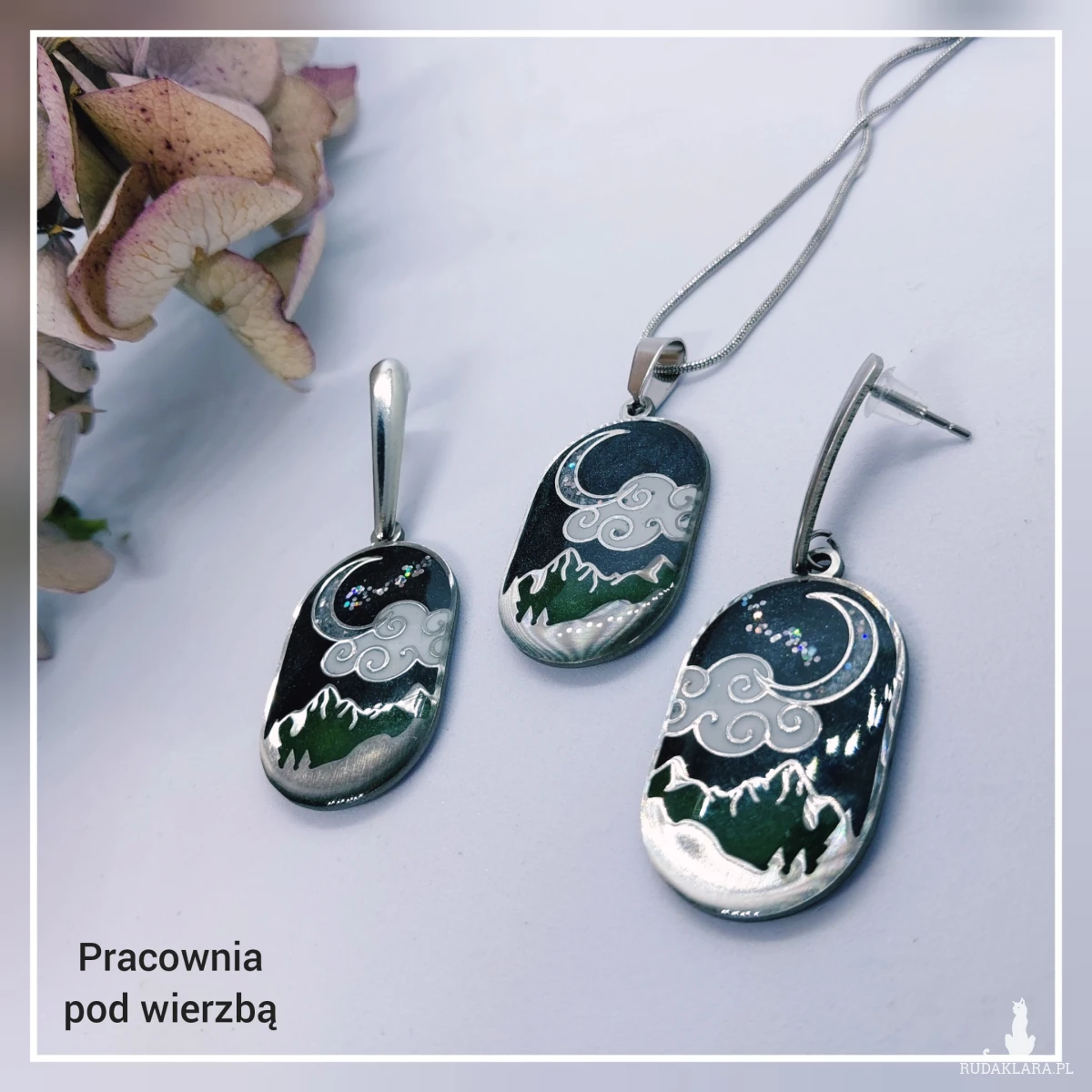 Uroczy zestaw biżuterii ręcznie malowanej żywicą jubilerską. Elementy metalowe to stal szlachetna.