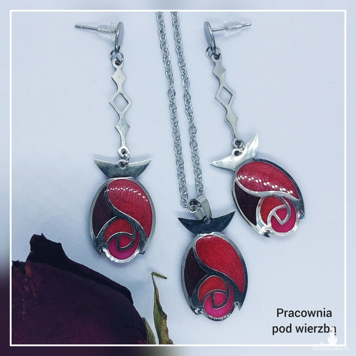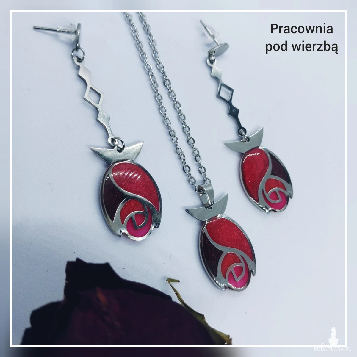 Uroczy zestaw biżuterii ręcznie malowanej żywicą jubilerską. Elementy metalowe to stal szlachetna.