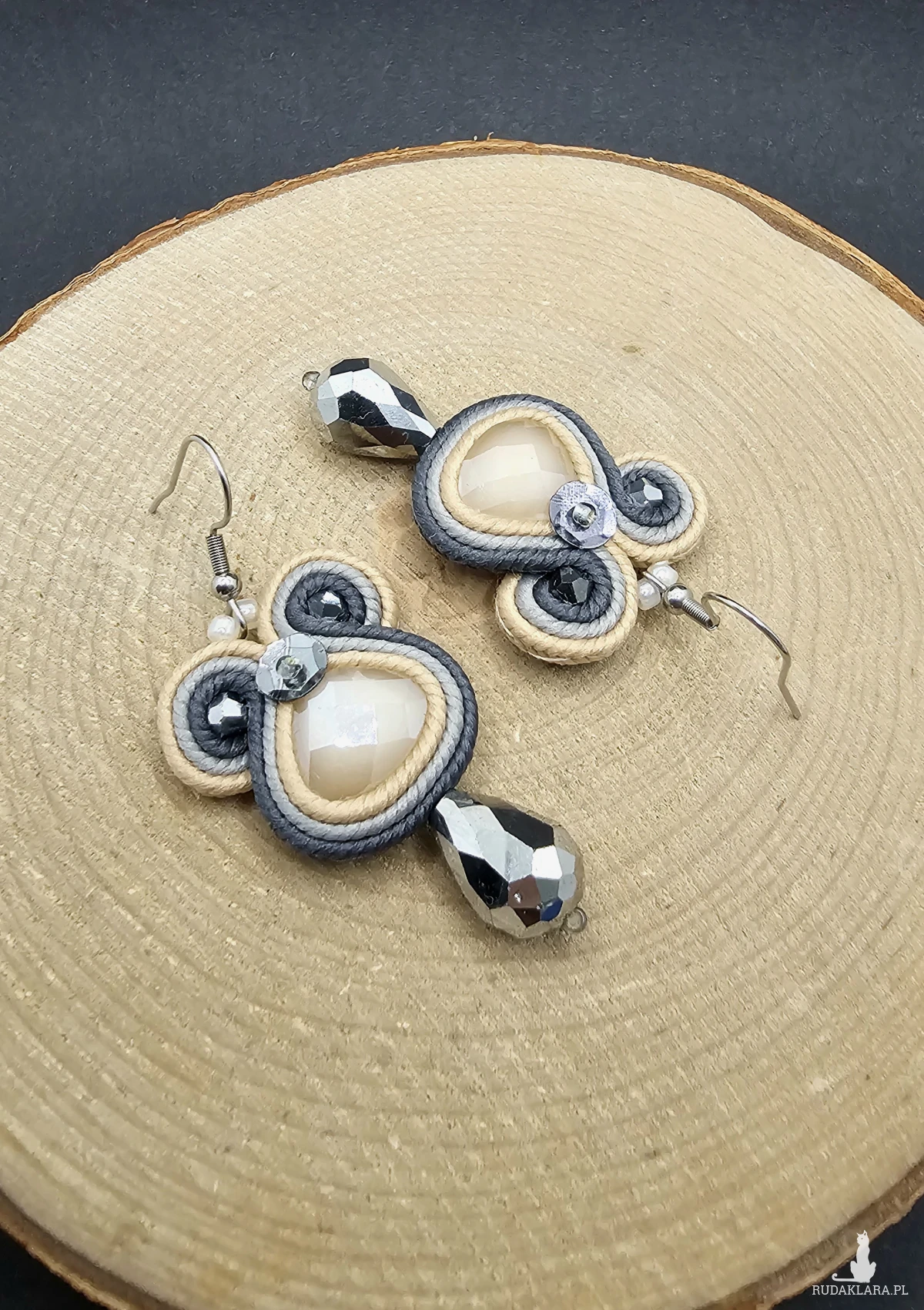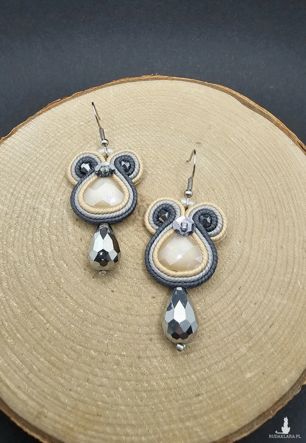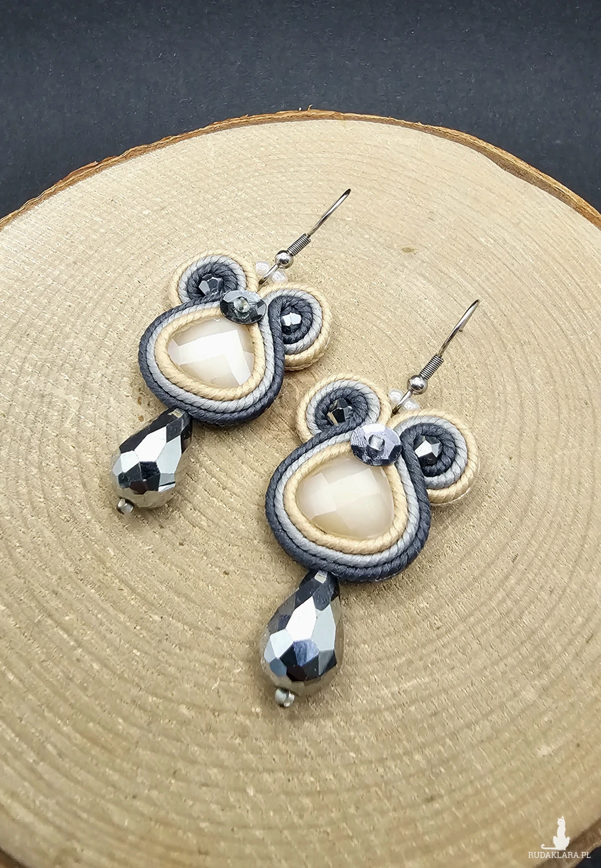 Szklane kryształki otoczone polskimi sznurkami sutasz oraz fasetowanymi koralikami. Dół kolczyków zdobią srebrne krople. Kolczyki zawieszone na klasycznych otwartych biglach ze stali chirurgicznej.
