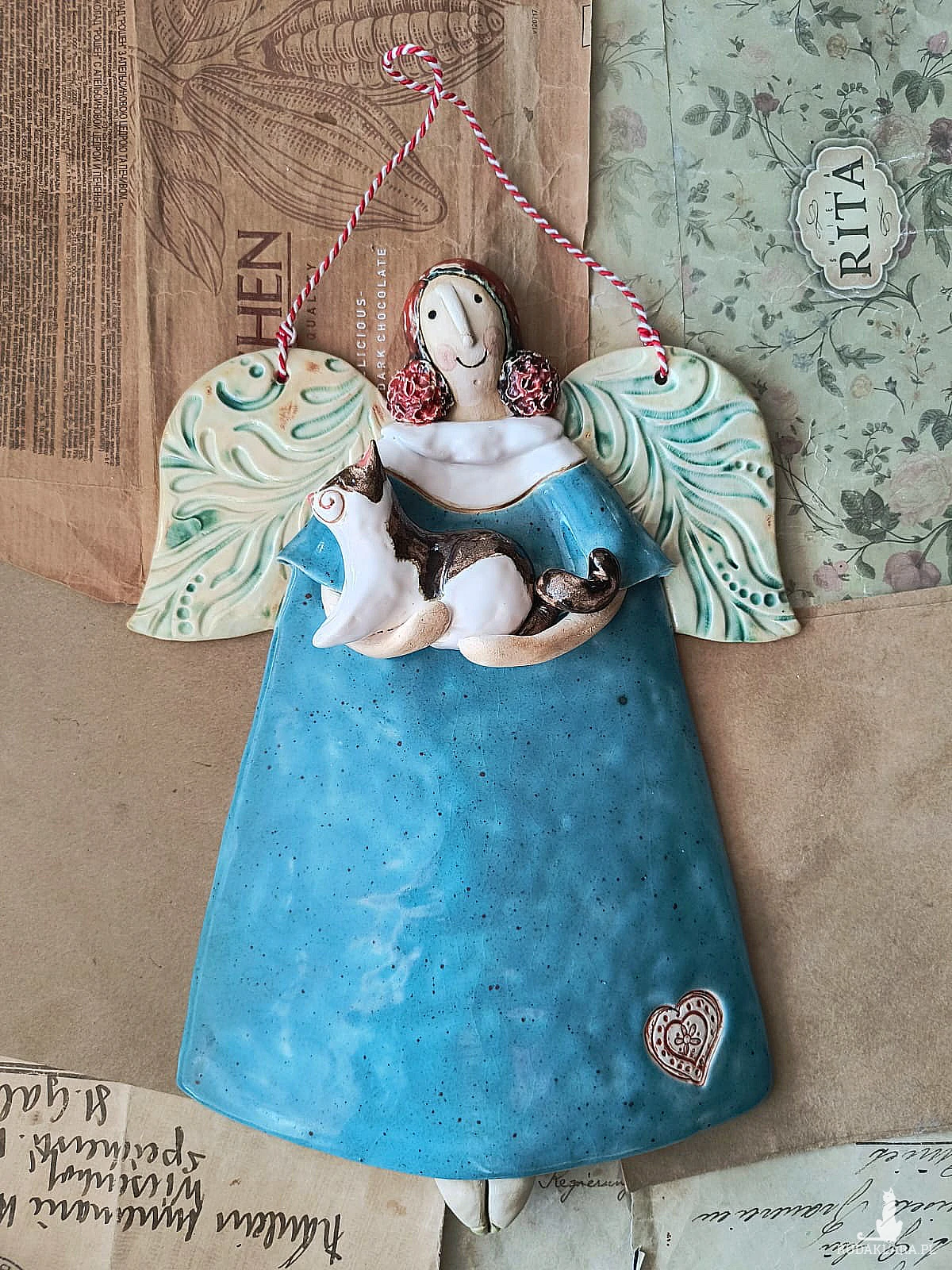Uroczy aniołek ceramiczny wykonany z gliny szamotowej, wypalony na biskwit, a następnie szkliwiony w temperaturze 1260 stopni C. Wymiary ok 18,5 cm x 24,5 cm. Do powieszenia na ścianie na ozdobnym sznureczku. Idealny jako prezent okolicznościowy lub do ozdoby domu.