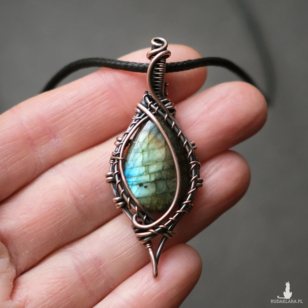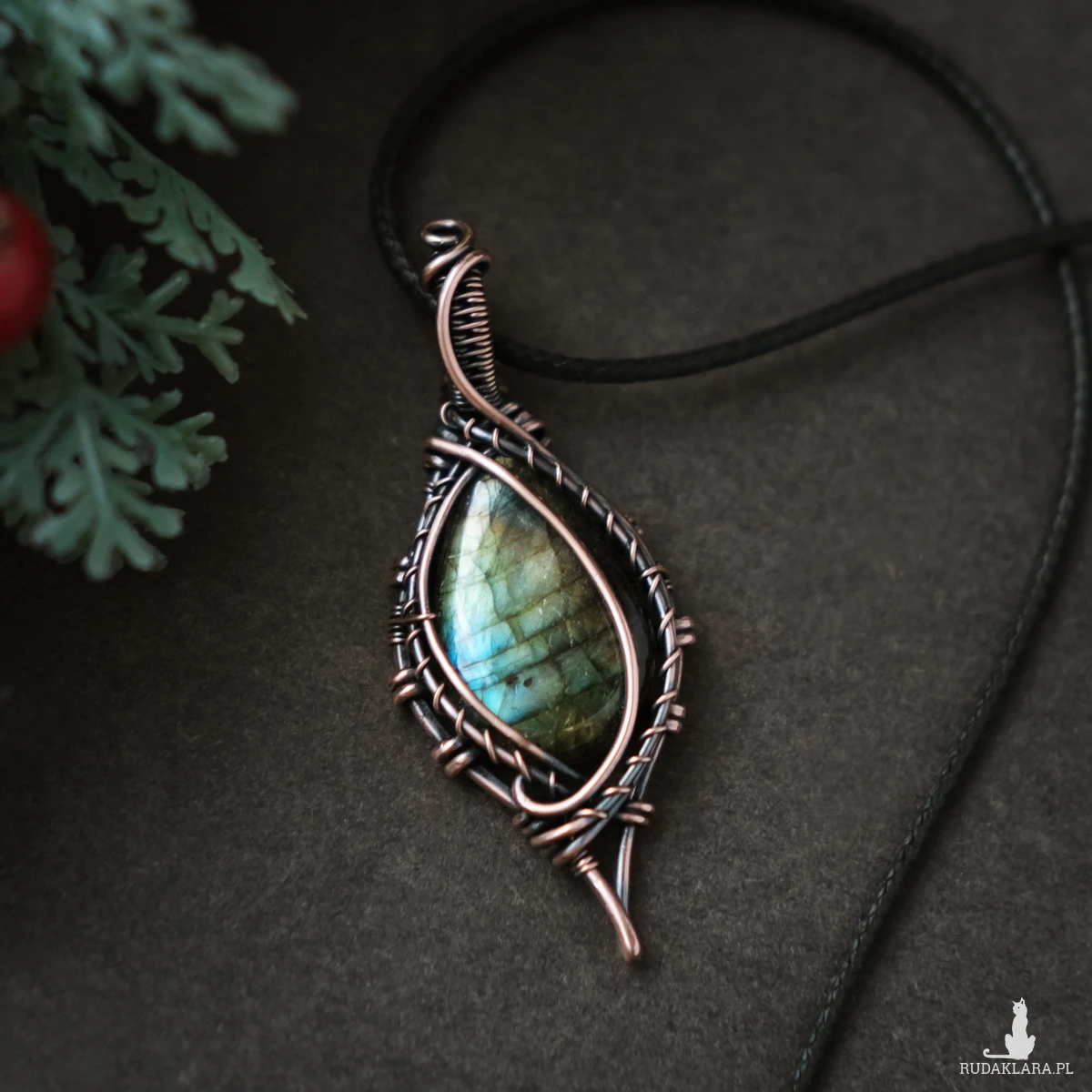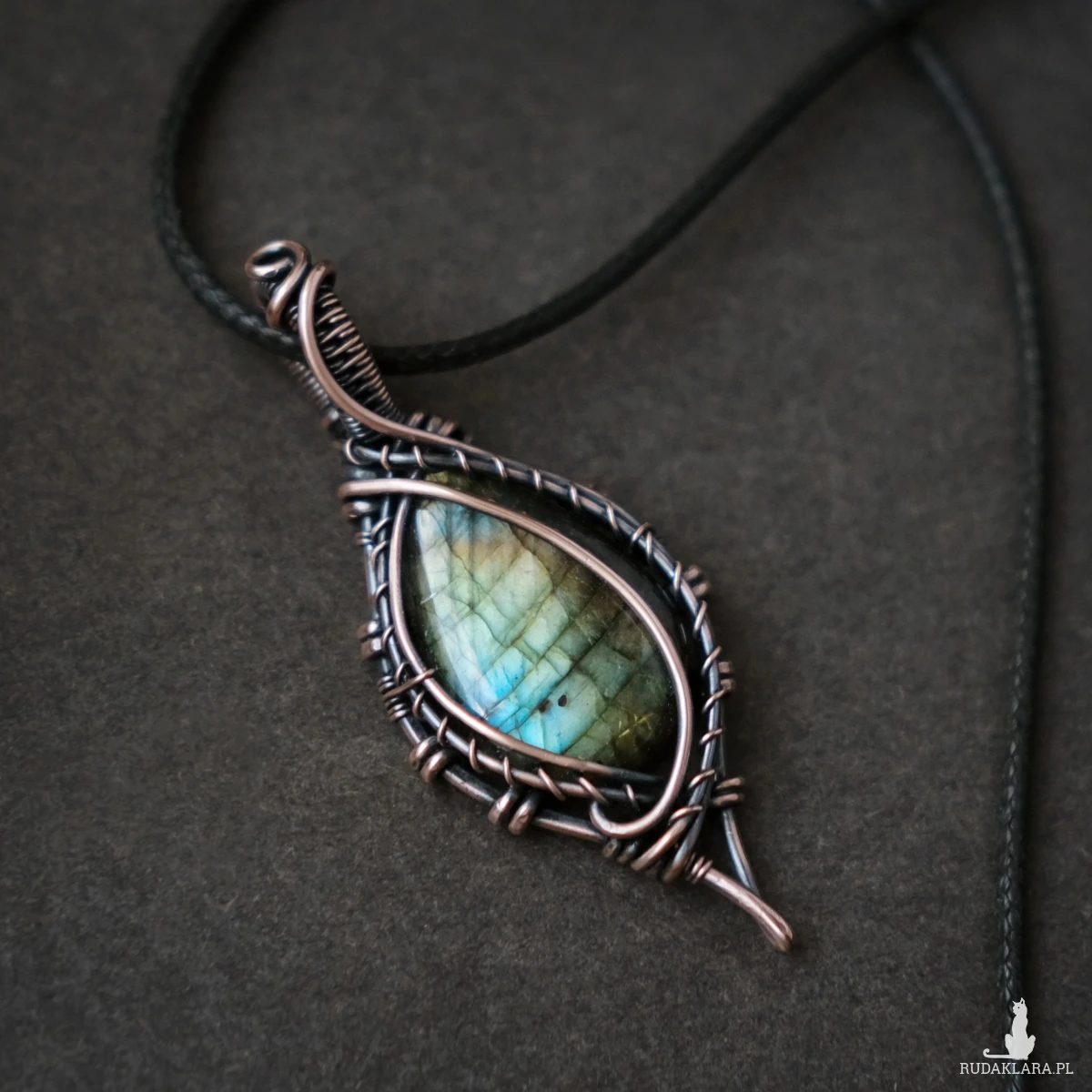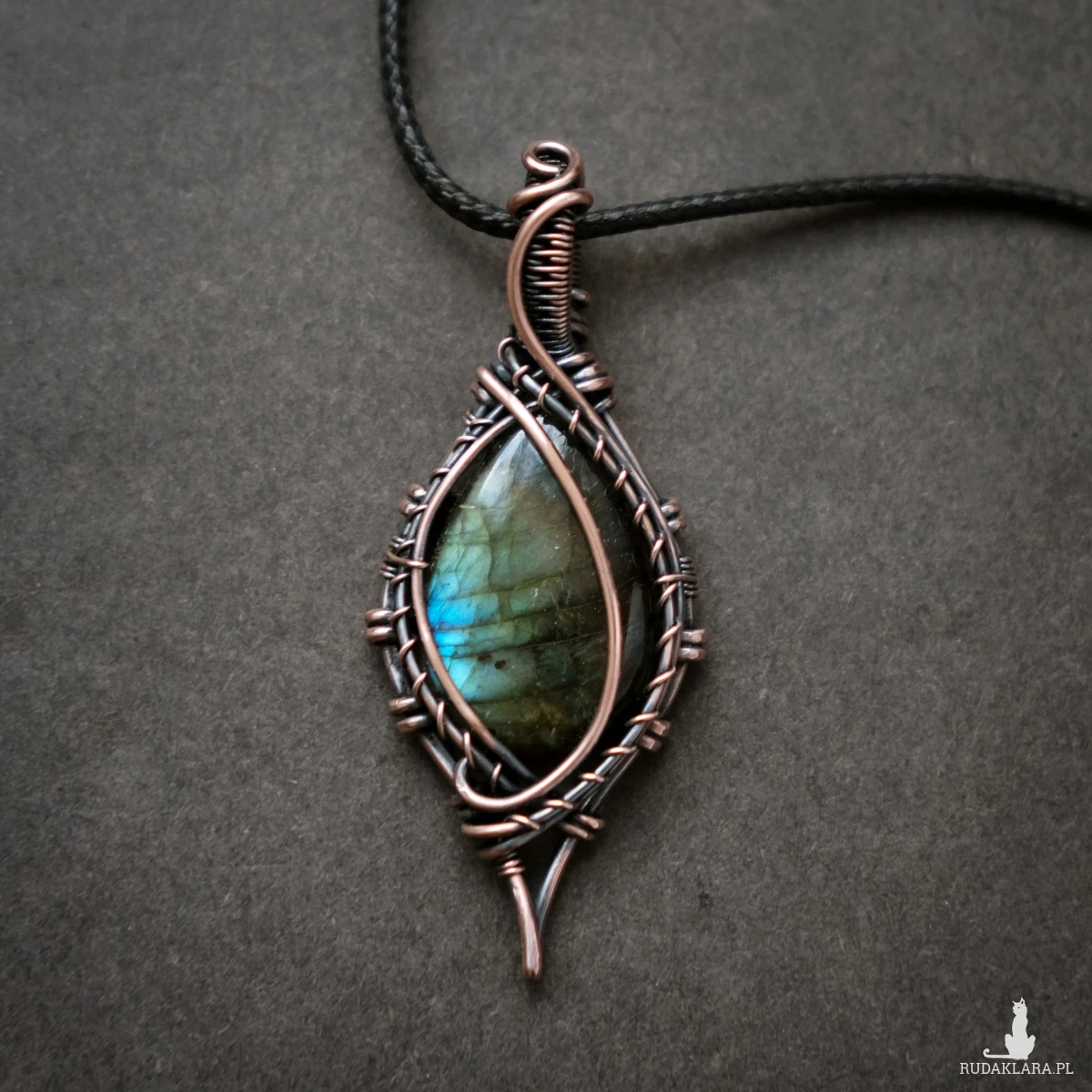 Piękny miedziany wisiorek w elfickim stylu z kamieniem labradorytu.