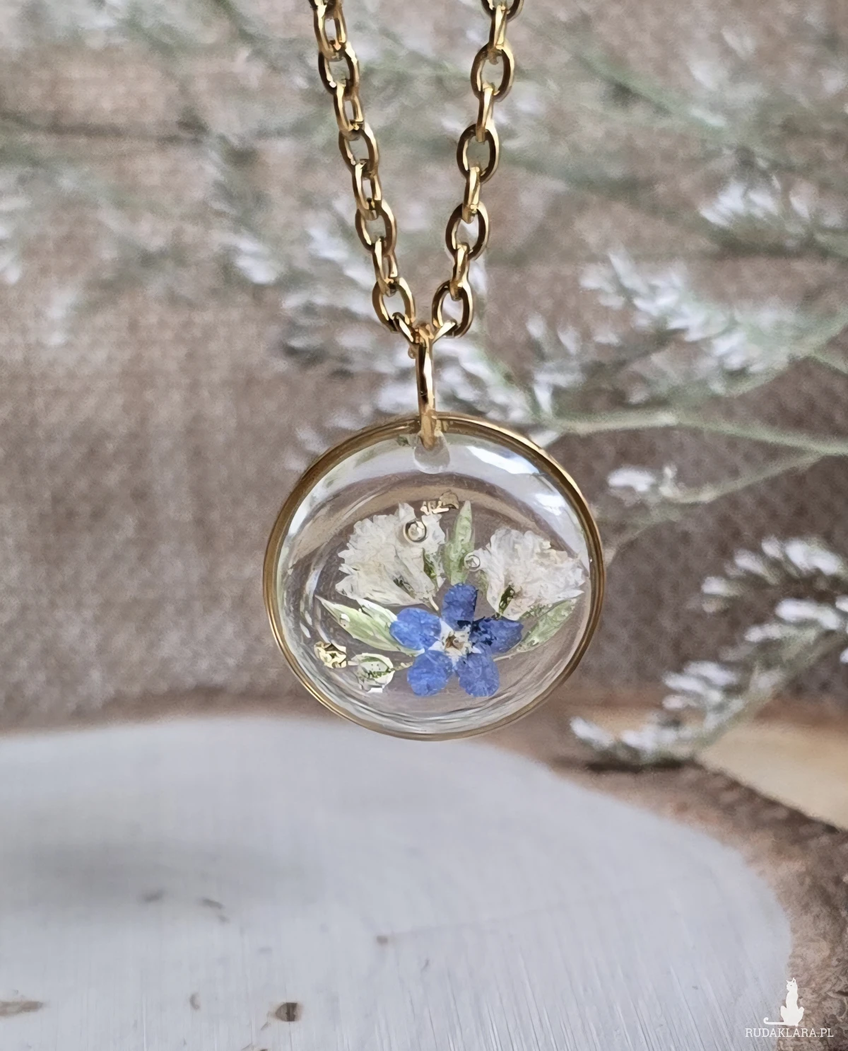 Oferuję Państwu unikalną biżuterię. Zawieszka jest wykonana z suszonych kwiatów i żywicy epoksydowej. Biżuteria jest wspaniałym i oryginalnym prezentem na lata.