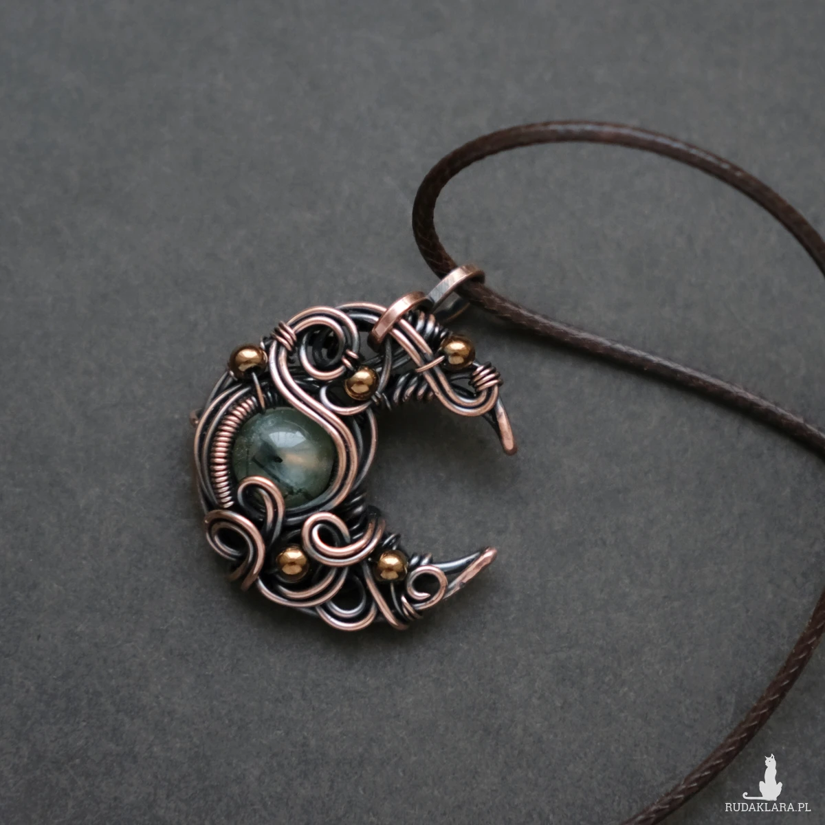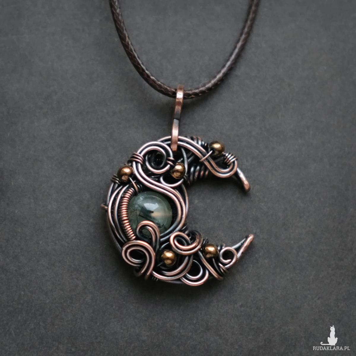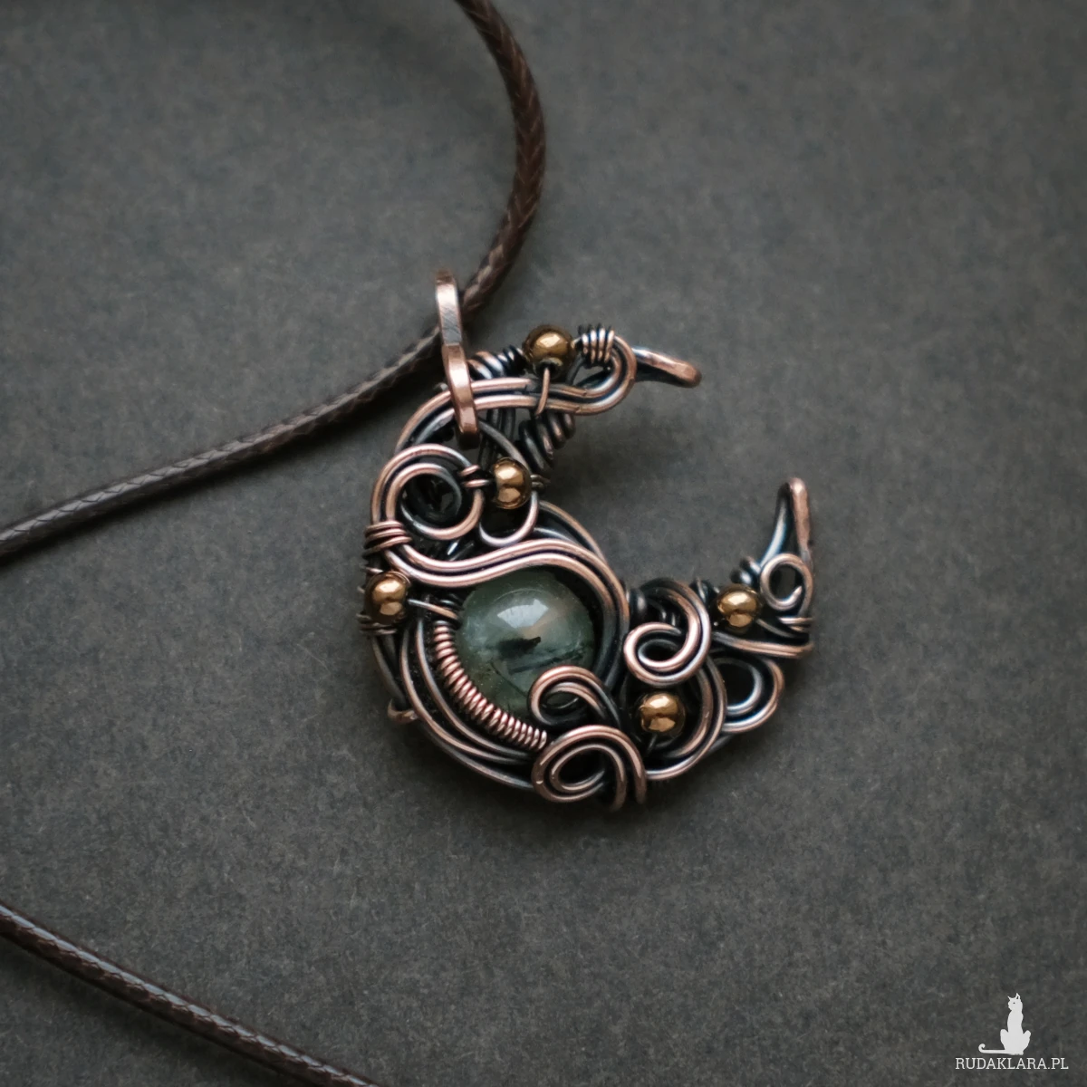 Miedziany drobny wisiorek - księżyc z kamieniem prehnitu oraz kulkami hematytu. Piękne fantazyjne sploty dodają mu baśniowego charakteru. Prehnit ma typowe dla tego kamienia ciemne wtrącenia.