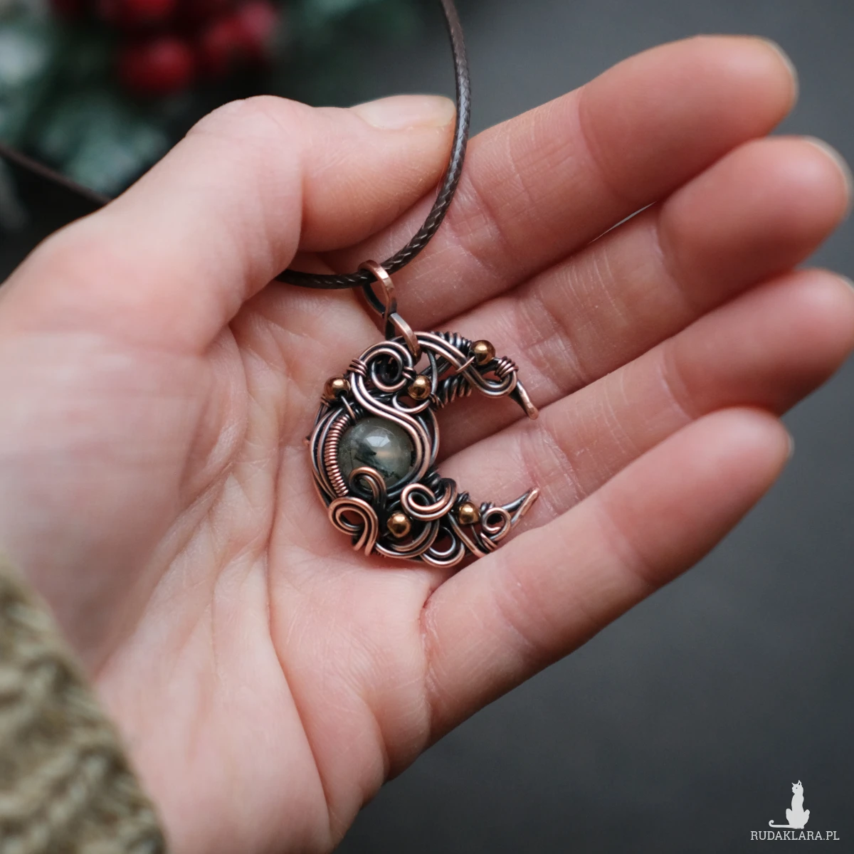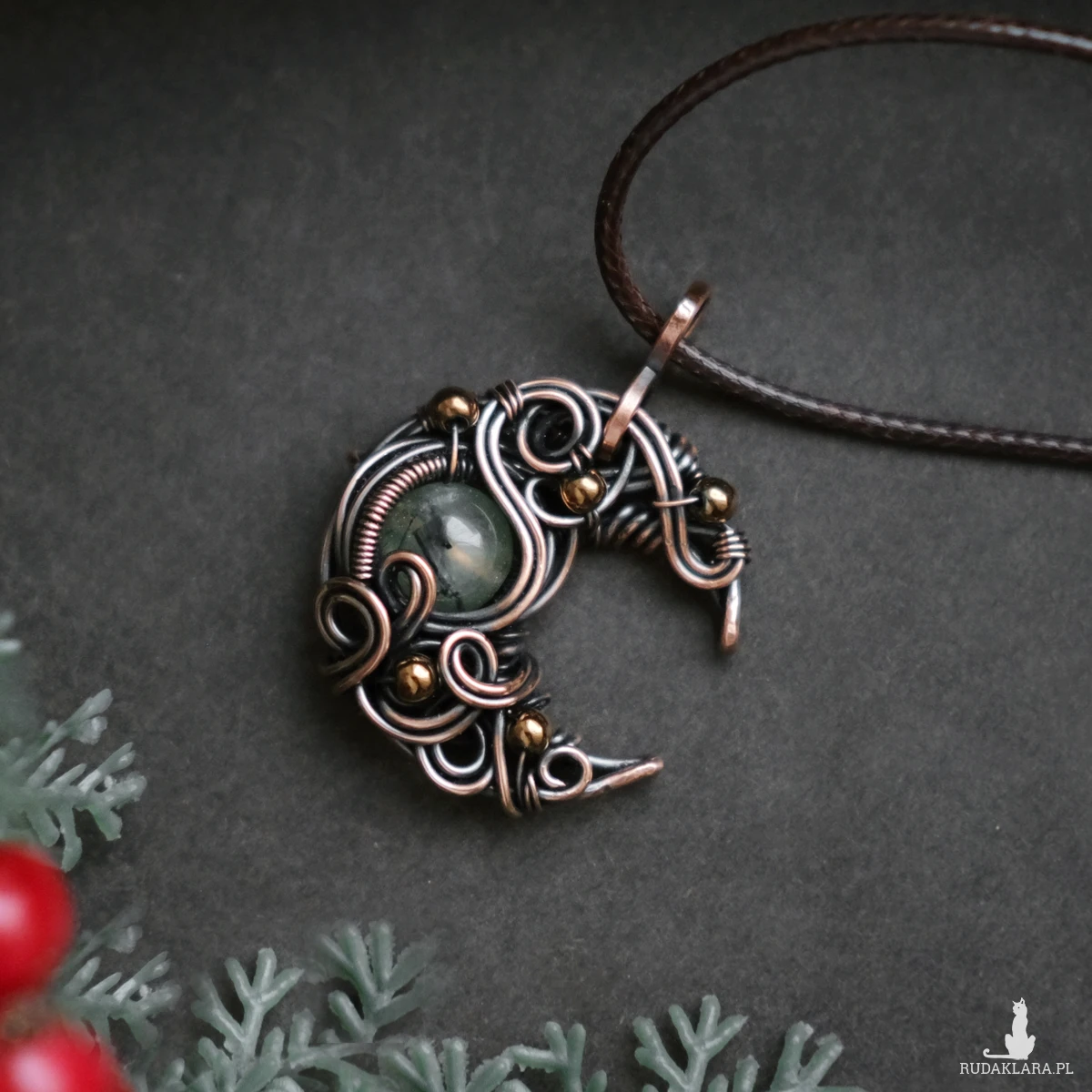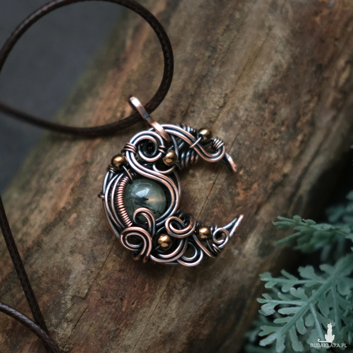 Miedziany drobny wisiorek - księżyc z kamieniem prehnitu oraz kulkami hematytu. Piękne fantazyjne sploty dodają mu baśniowego charakteru. Prehnit ma typowe dla tego kamienia ciemne wtrącenia.