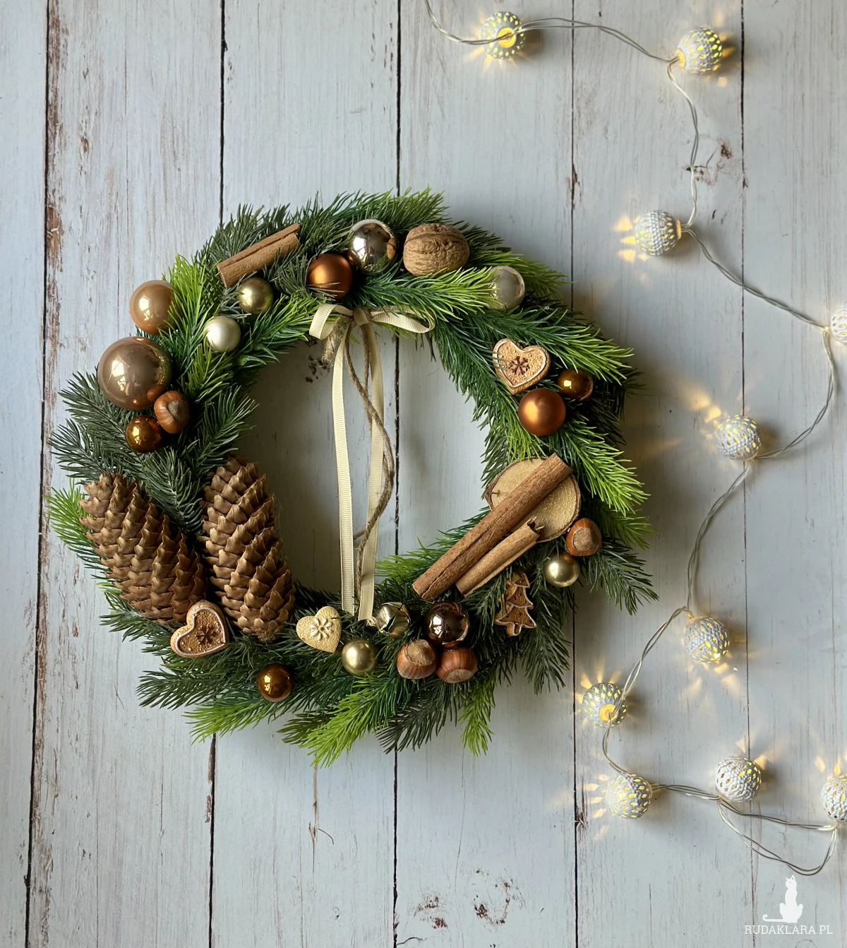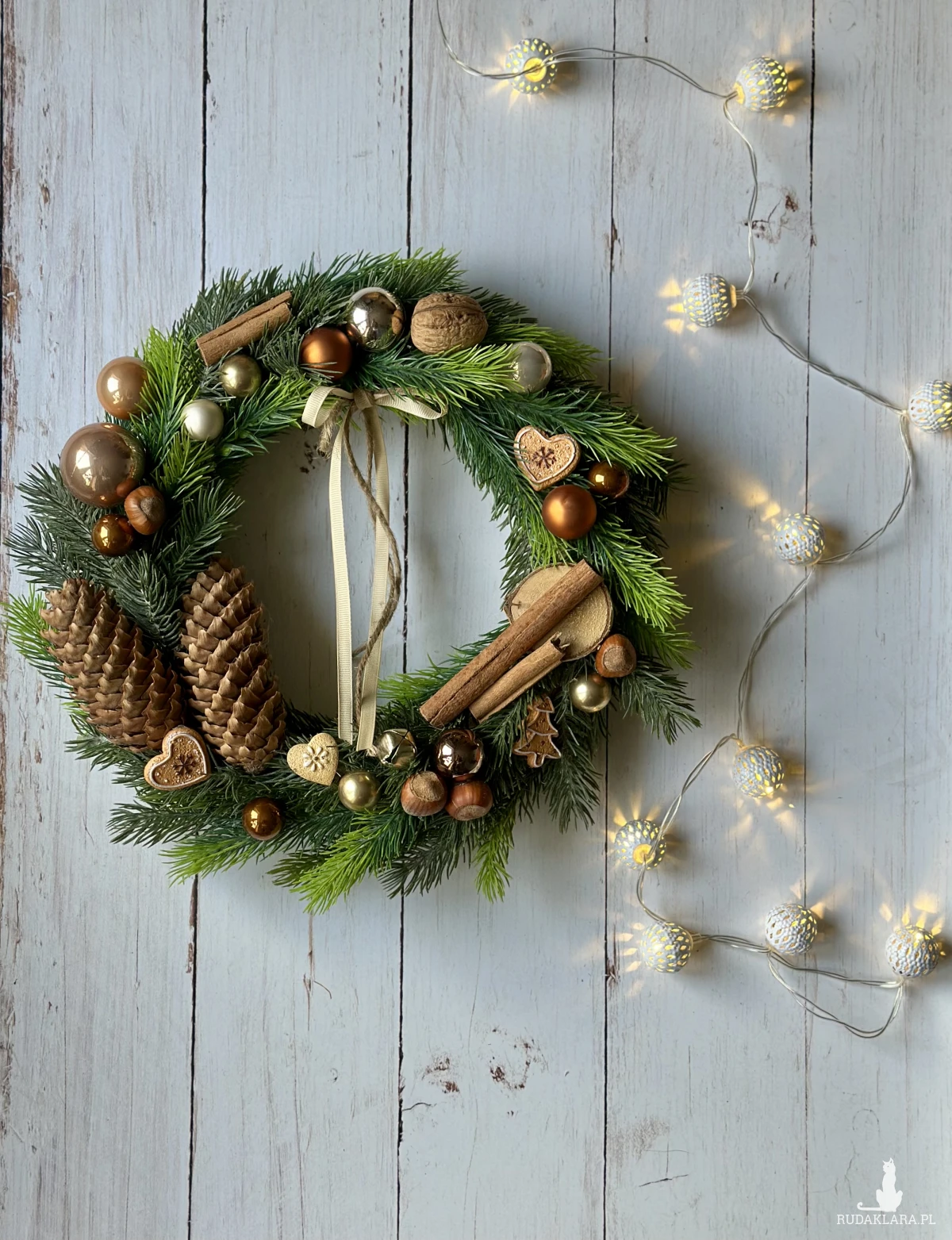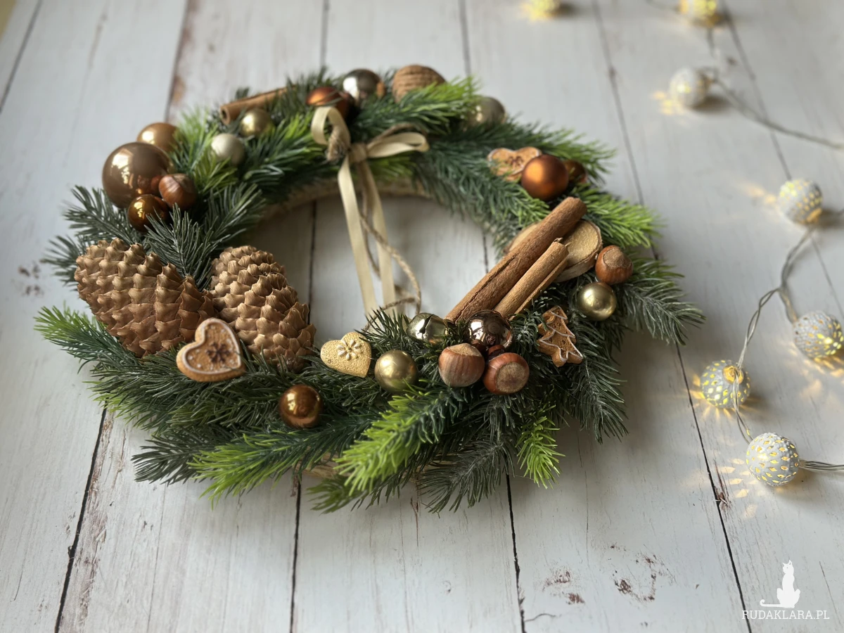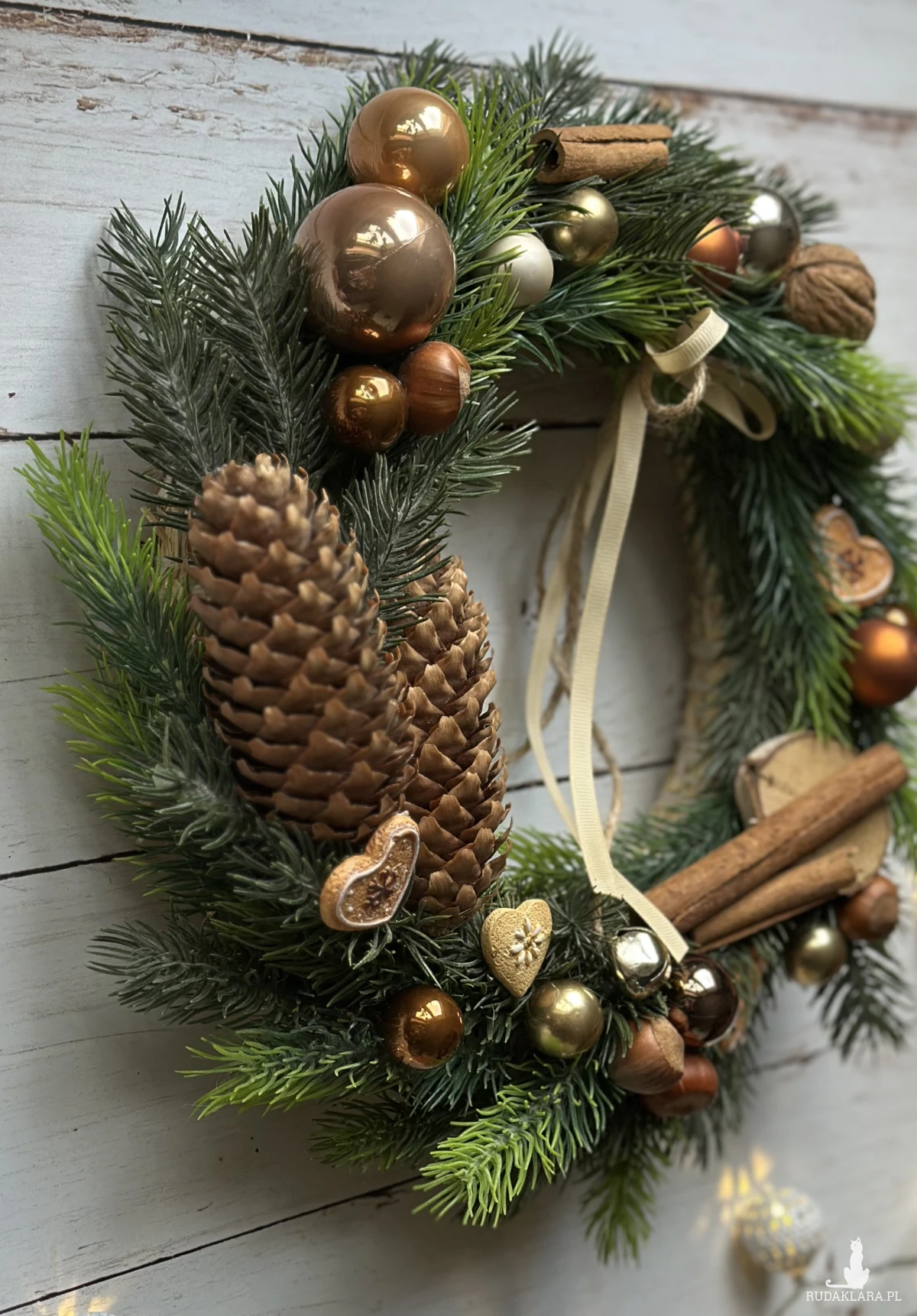 Wykonany z wielką dbałością o szczegóły wianek bożonarodzeniowy. Zimowa dekoracja świąteczna z ozdobami ze sztucznego igliwia i dodatków (szklane bombki, naturalne i syntetyczne ozdoby).