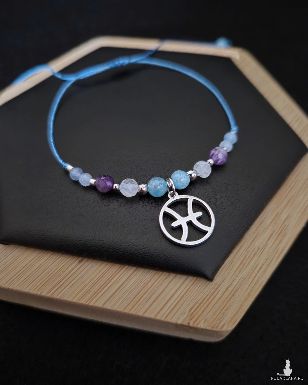Bransoletka Zodiakalna „Ryby” to subtelna, harmonijna kompozycja stworzona z myślą o osobach urodzonych pod znakiem Ryb — wrażliwych, intuicyjnych, empatycznych i głęboko połączonych ze światem emocji. Delikatna kolorystyka fioletu, błękitu i mlecznej bieli przywodzi na myśl spokój wody, ciszę i wewnętrzną równowagę. Całość dopełniają srebrne akcenty oraz zawieszka z symbolem Ryb, czyniąc z bransoletki osobisty talizman wspierający emocje i duchowość.