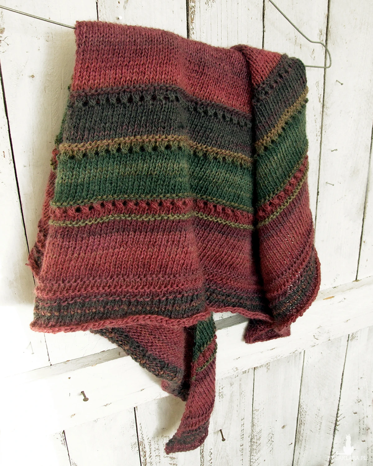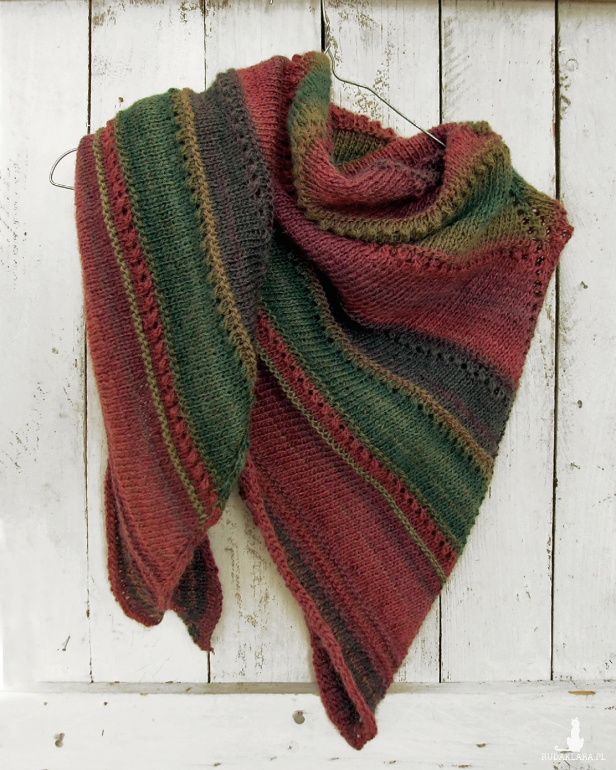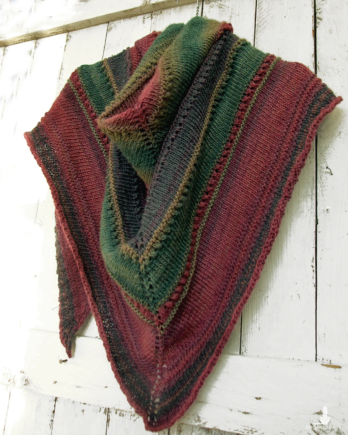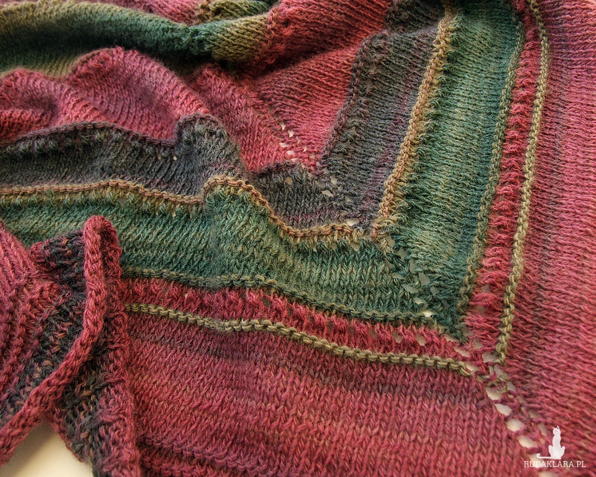 Kolory: ciemna zieleń, oliwka, grafitowy, buraczkowy, burgund - cieniowanie włóczki układa się w pasy różnej szerokości.