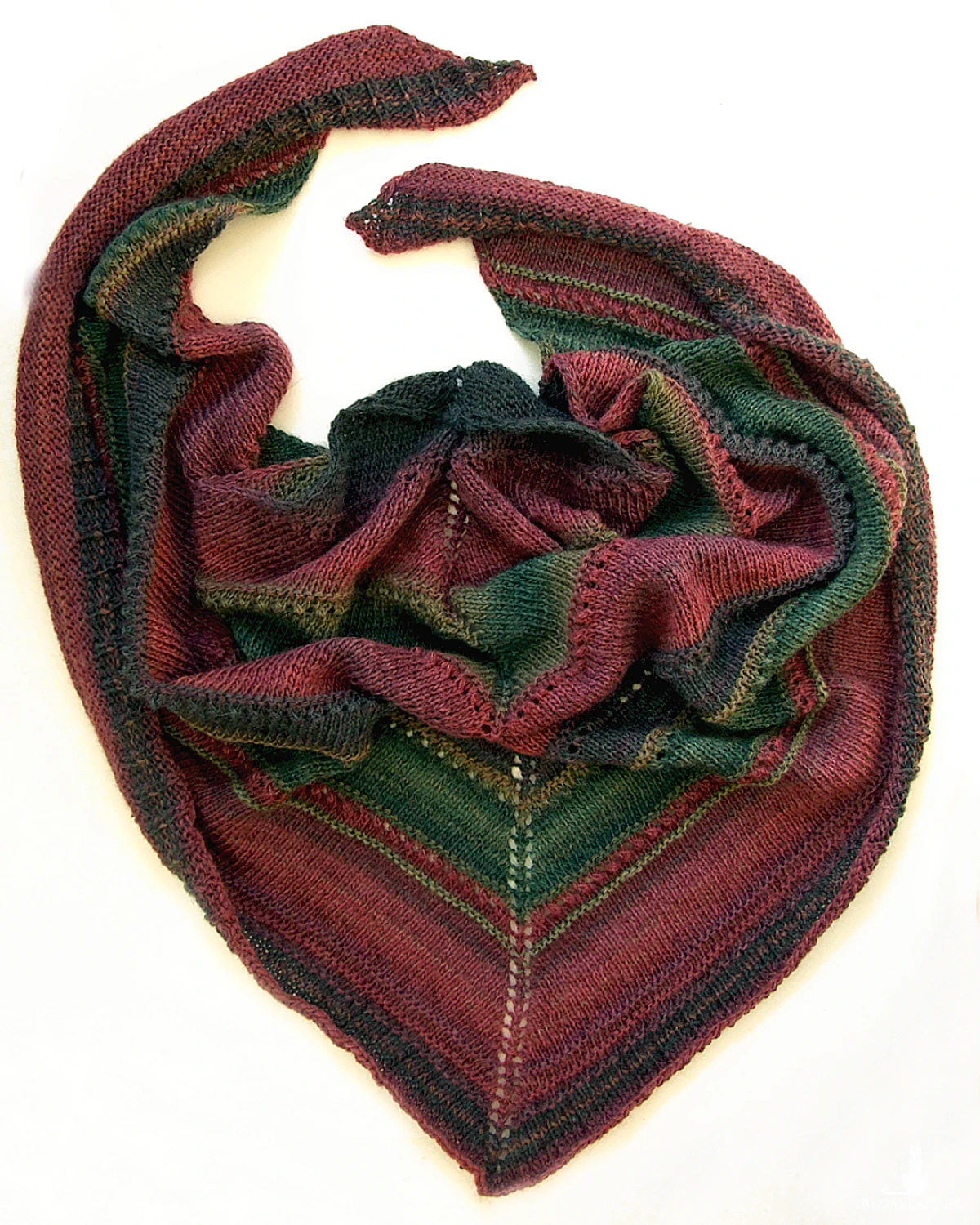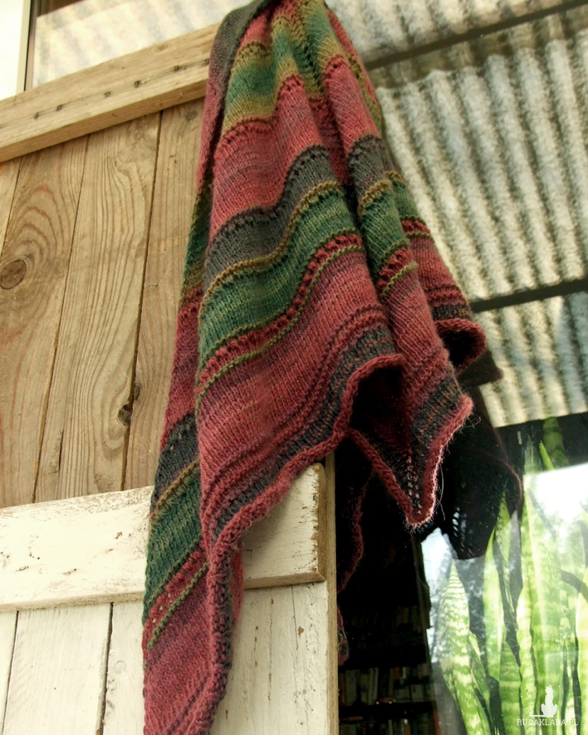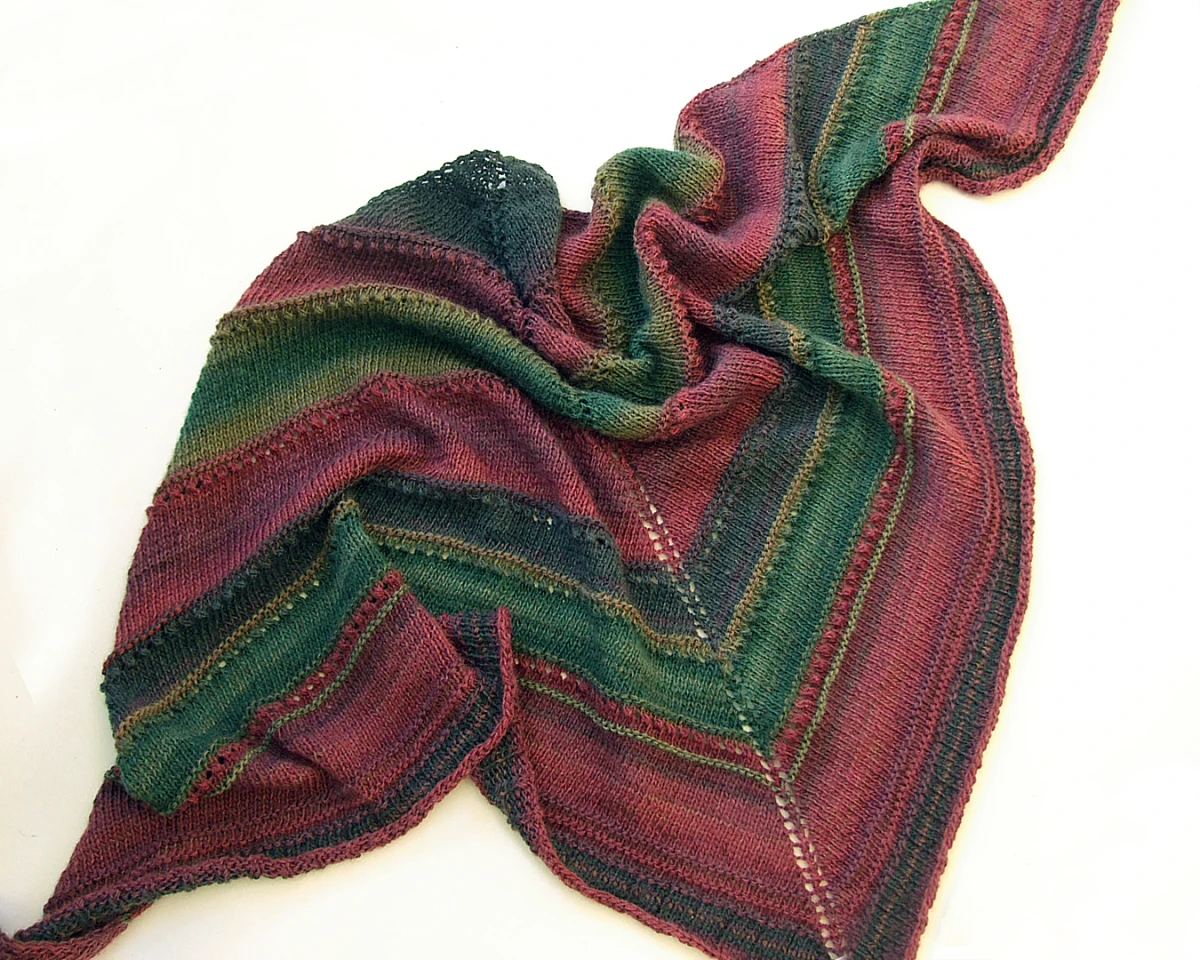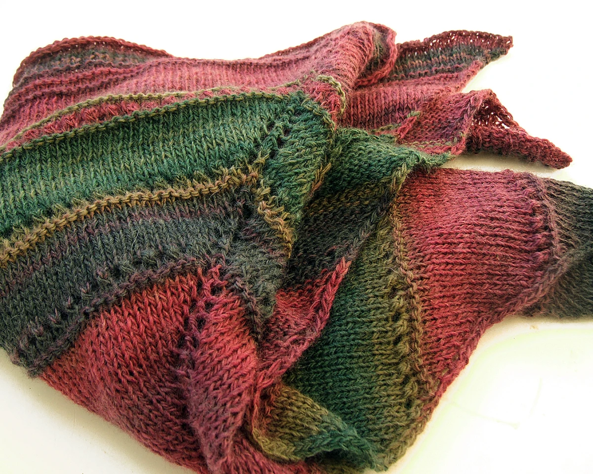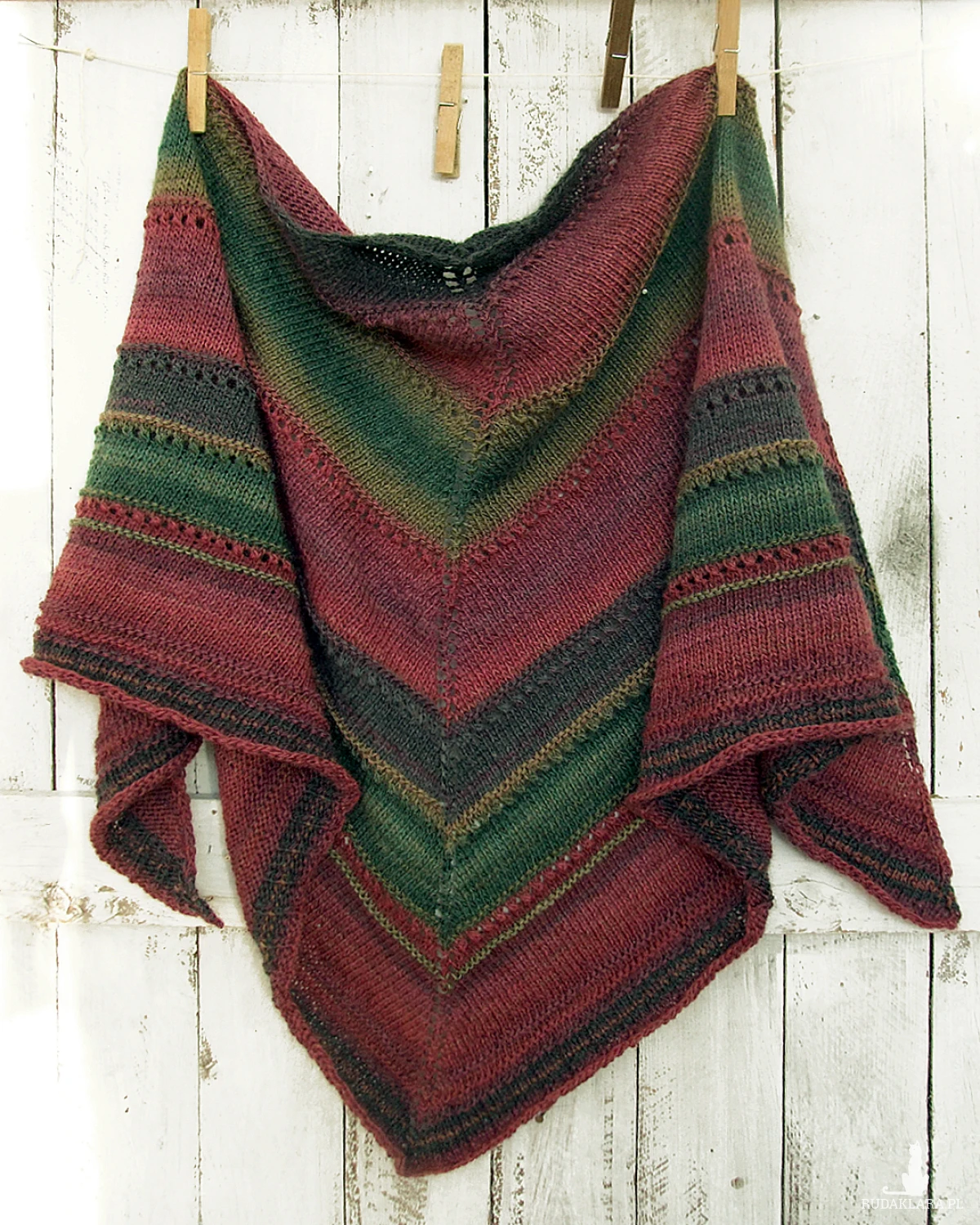 Kolory: ciemna zieleń, oliwka, grafitowy, buraczkowy, burgund - cieniowanie włóczki układa się w pasy różnej szerokości.