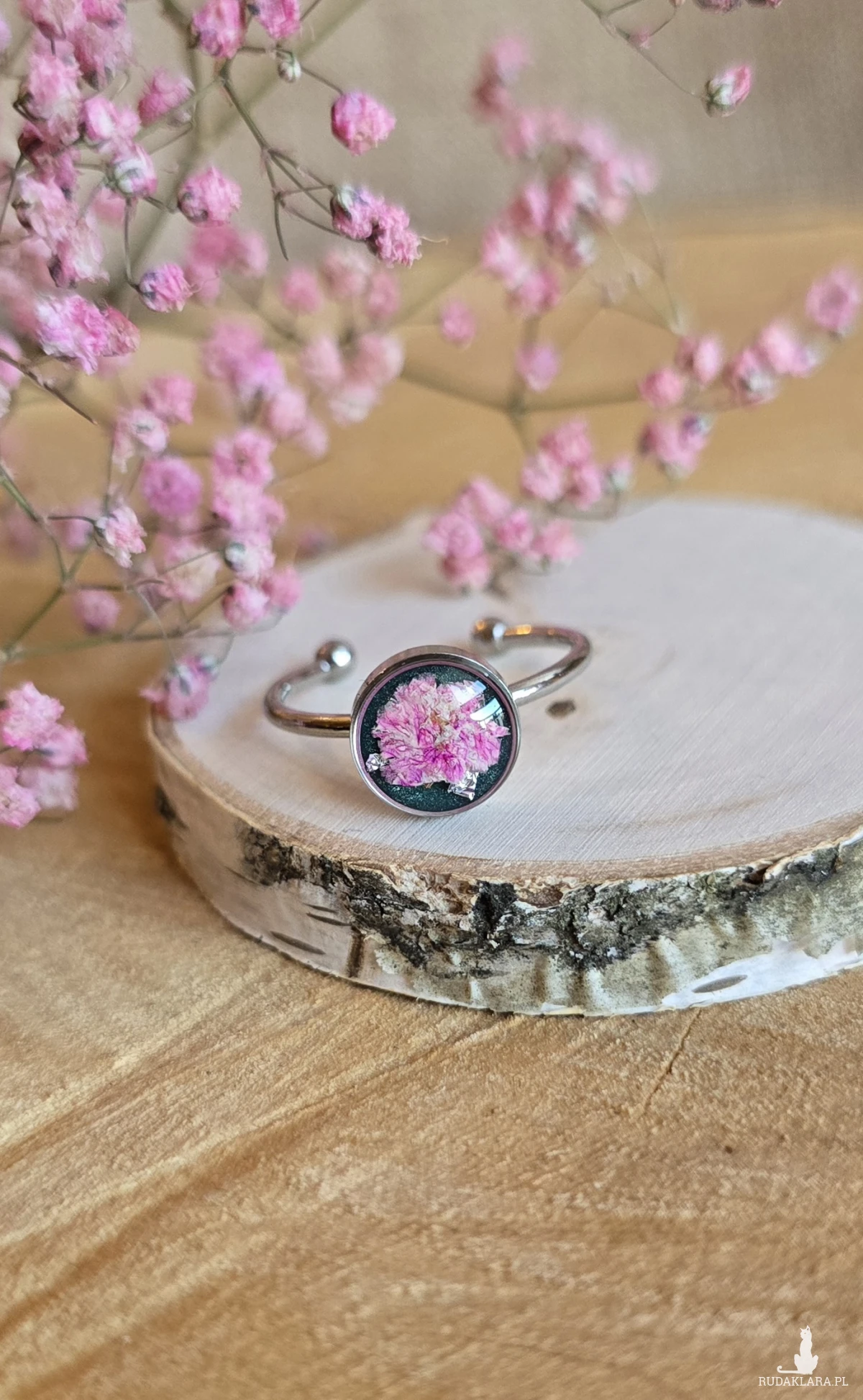 Oferuję Państwu unikalną biżuterię. Pierścionek jest wykonany z suszonych kwiatów i żywicy epoksydowej. Biżuteria jest wspaniałym i oryginalnym prezentem na lata.