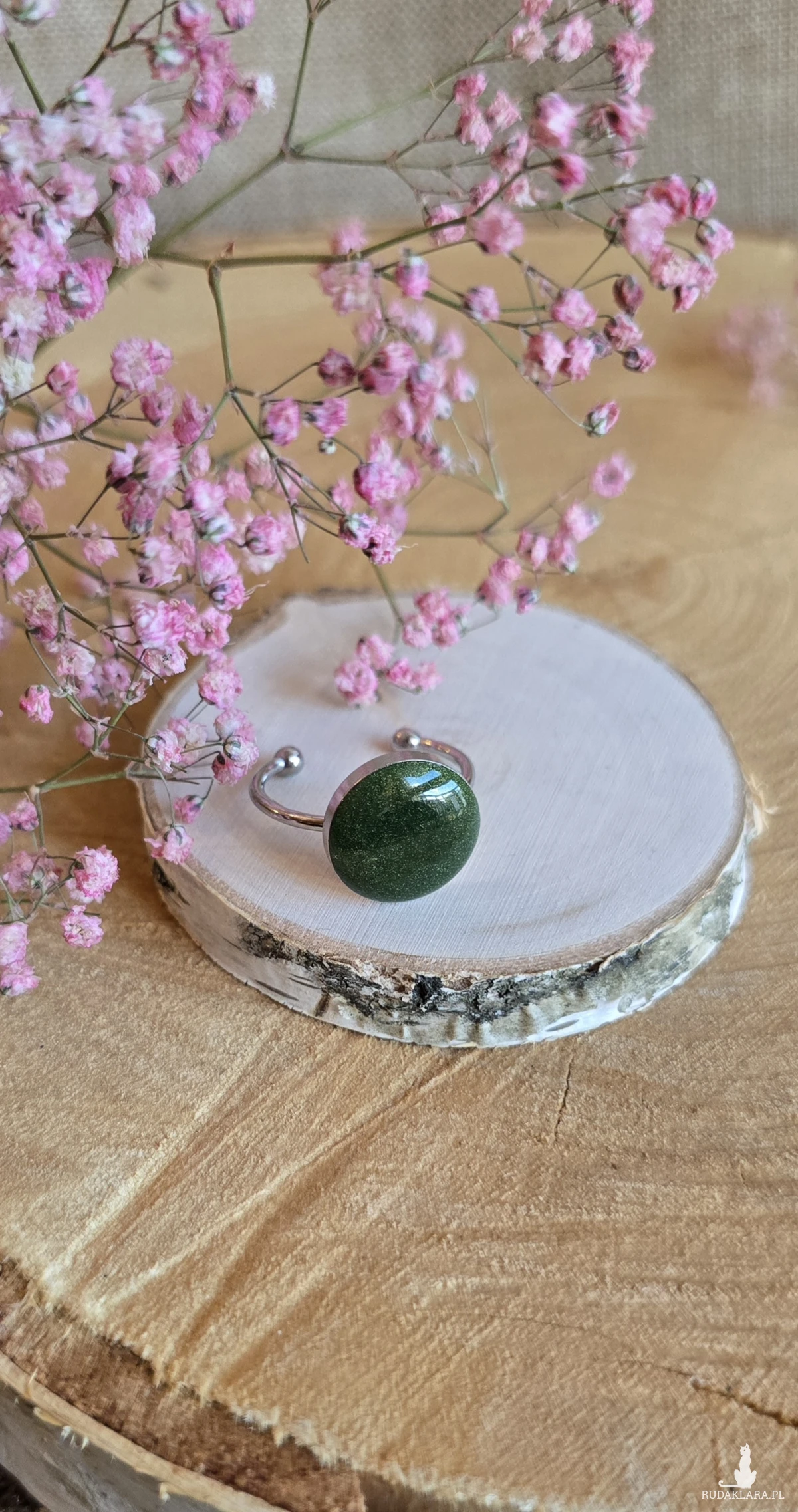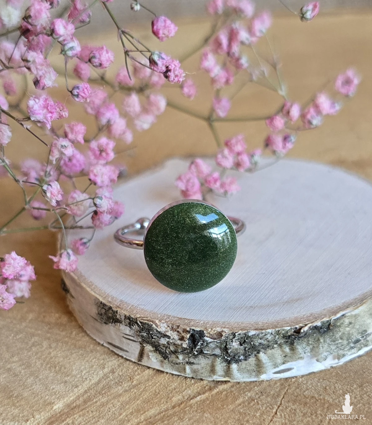 Duży pierścionek z zielonym oczkiem brokatowym żywica butelkowa zieleń
