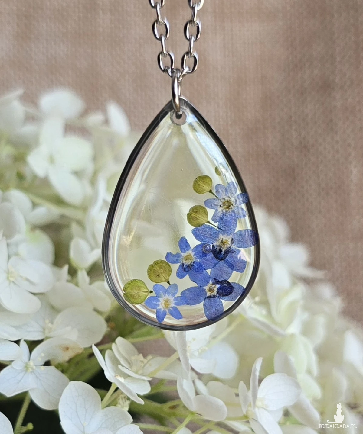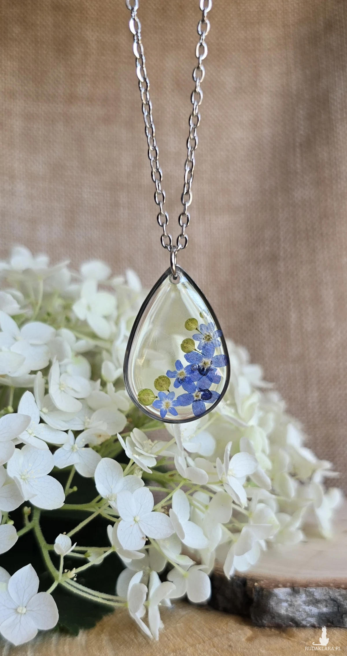 Srebrna zawieszka srebrny wisiorek kwiat naszyjnik żywica z żywicy kwiaty łezka łza niezapominajki