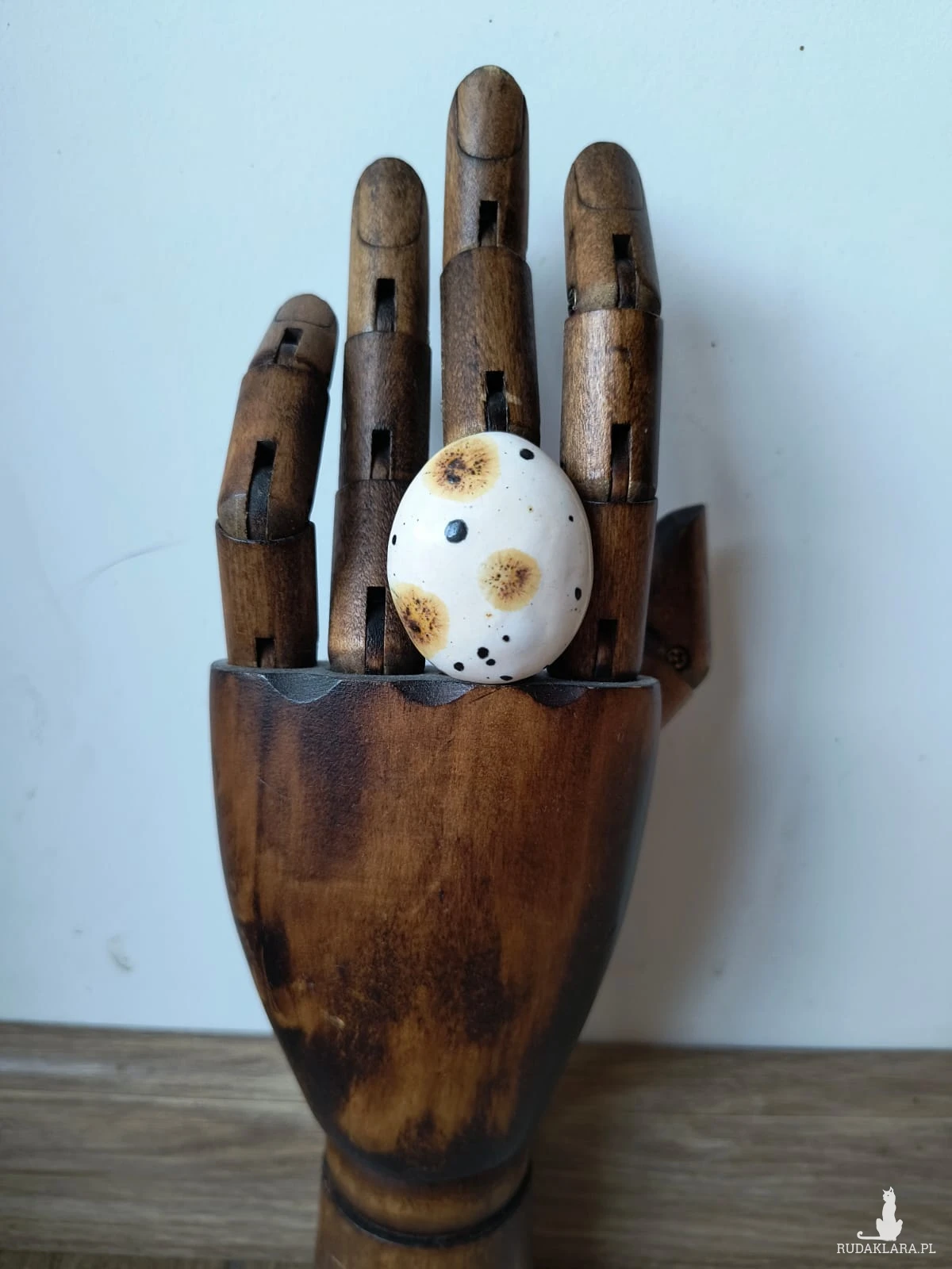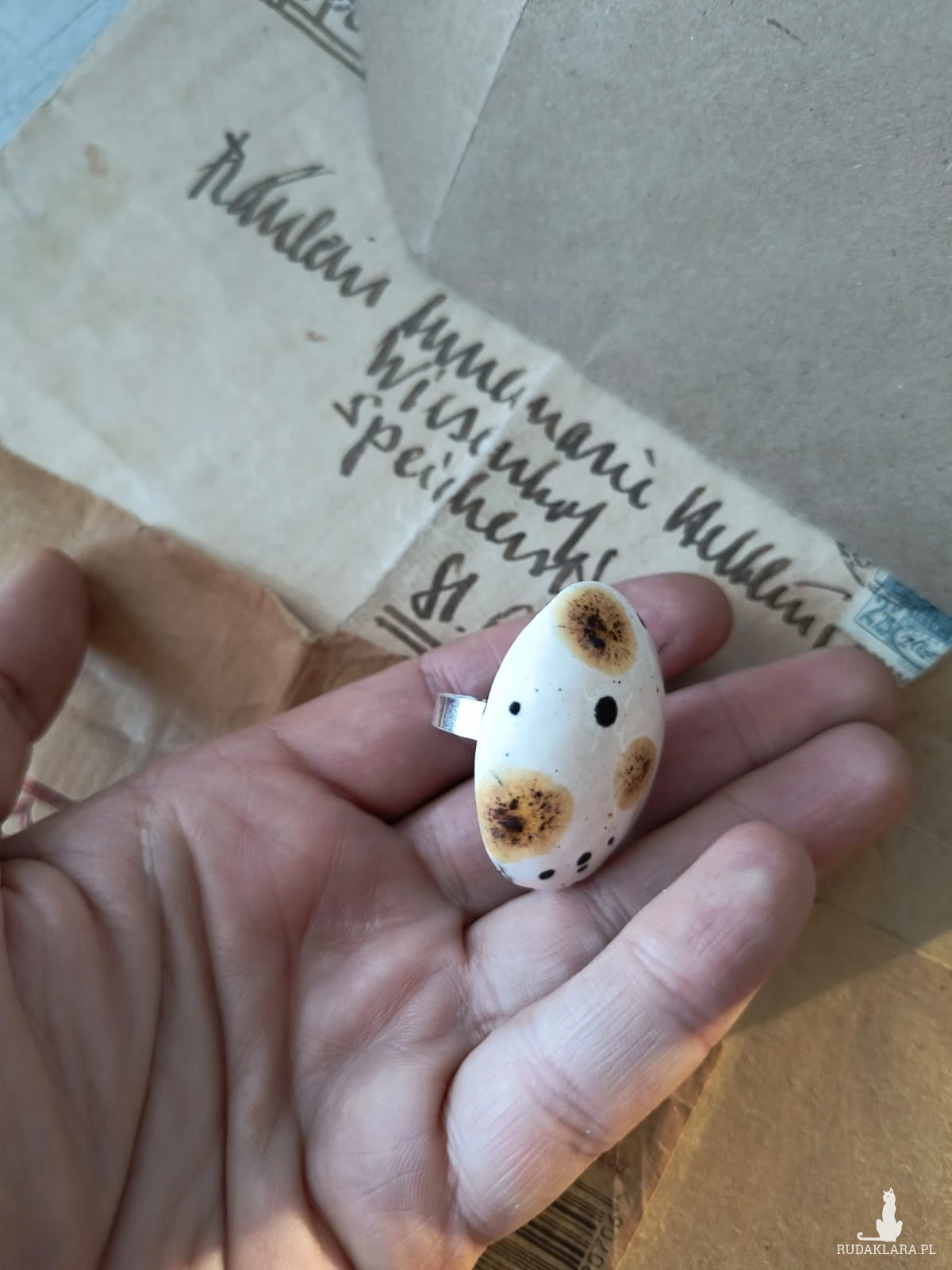 Pierścionek o ceramicznym oku w kształcie owalnym, wykonany z gliny szamotowej, wypalony na biskwit, a następnie szkliwiony w temp. ok 1260 stopni C. Baza do pierścionka w kolorze srebra. Niepowtarzalny i jedyny w swoim rodzaju. Wymiary ok 4 cm x 3,5 cm. Obwód pierścionka jest regulowany. Serdecznie polecam wszystkim Paniom!!!