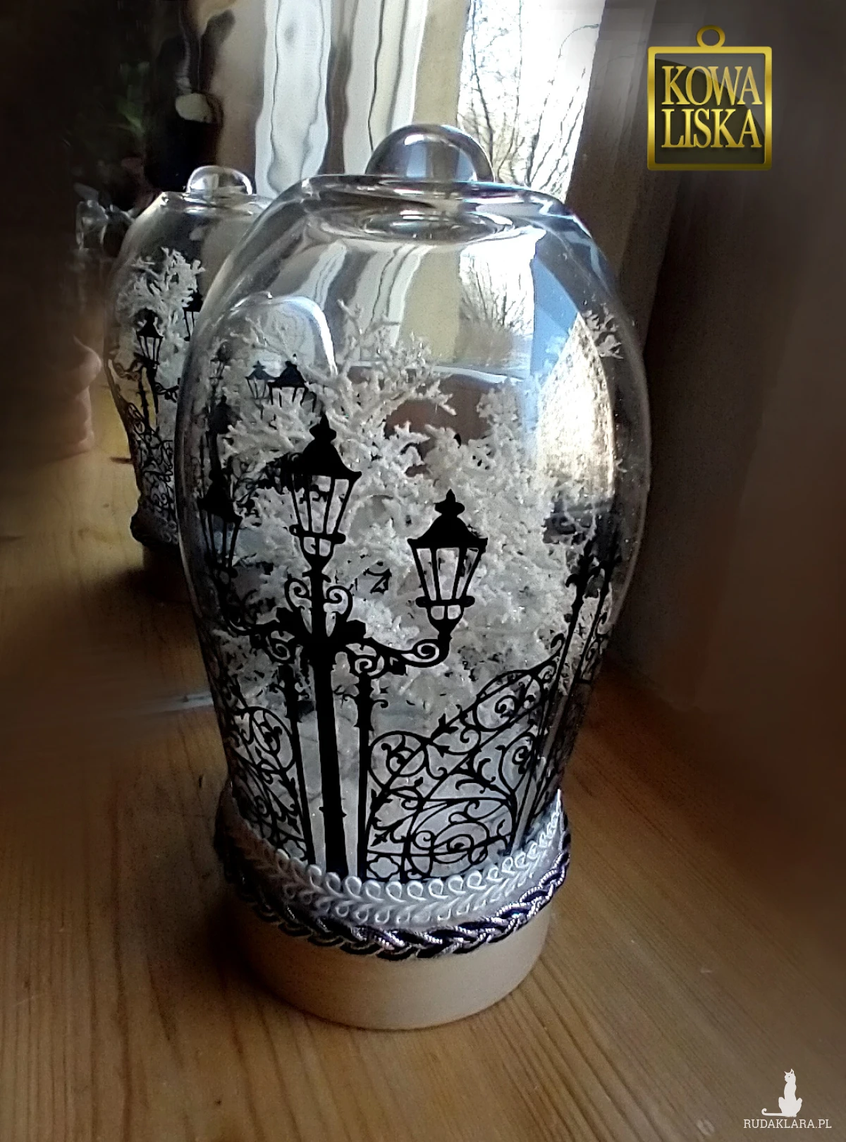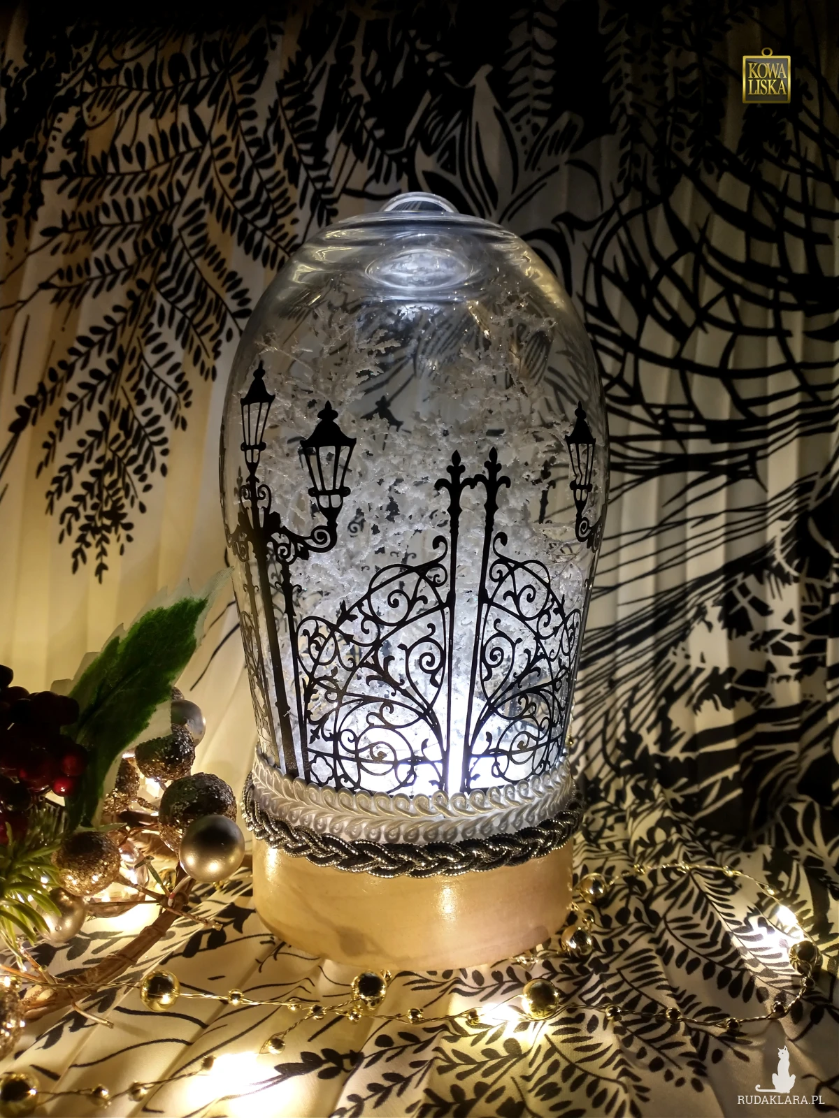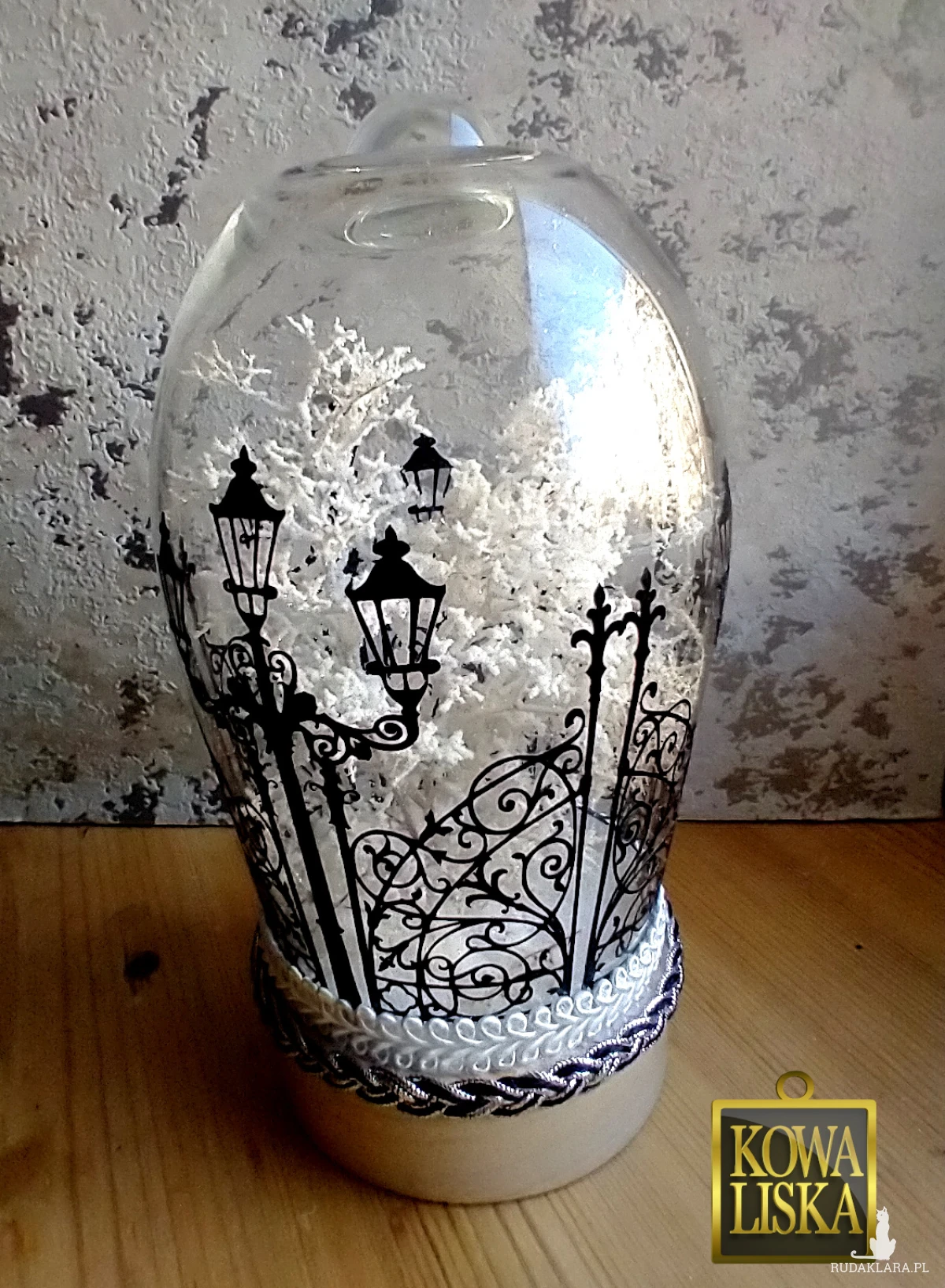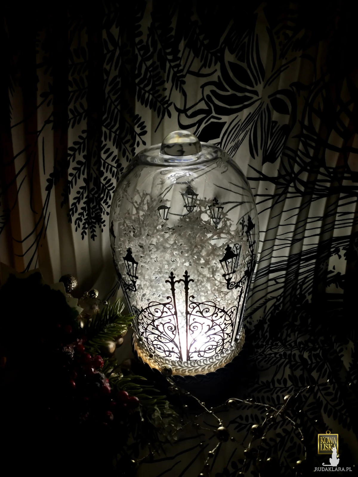 Wykonany na bazie szklanej kopułki lampion jest ozdobiony z zewnątrz elementami z czarnej folii. Zamknięte w środku prawdziwe gałązki imitują nagie drzewa. Obsypane szklanym pyłem niczym szronem, po włączeniu pięknie odbijają światło i skrzą się mroźnymi, srebrzystymi akcentami.