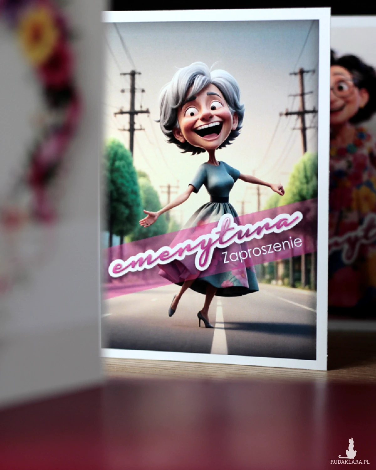 Zaproszenie na imprezę z okazji przejścia na emeryturę. Zaproszenie składane A5 do formatu A6. Wydruk cyfrowy na papierze kredowym o gramaturze 350g.